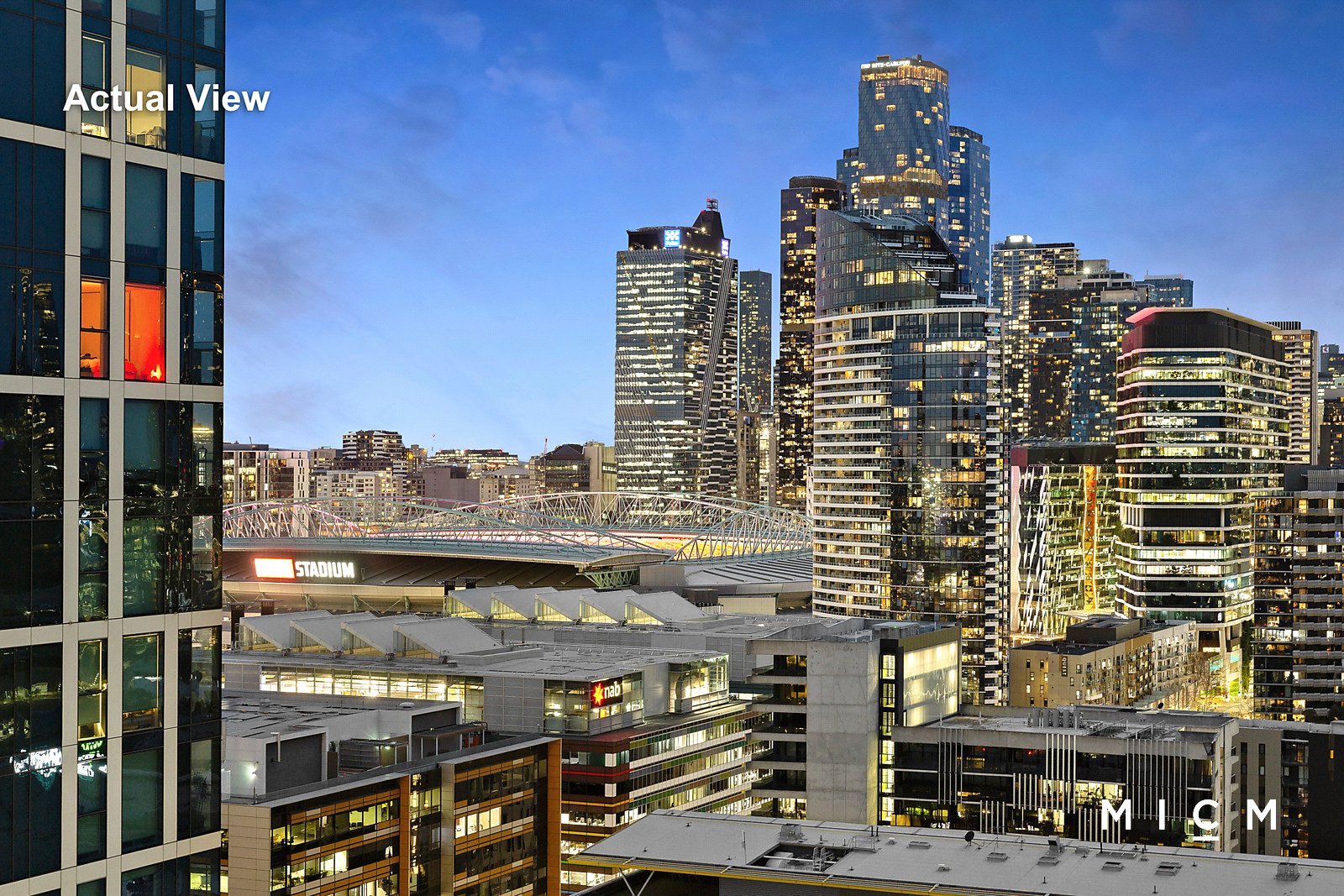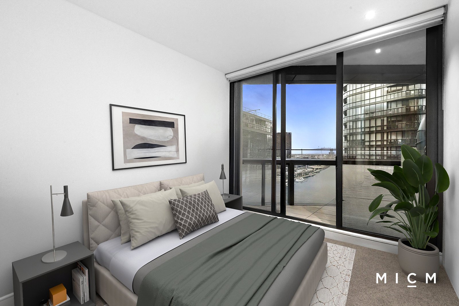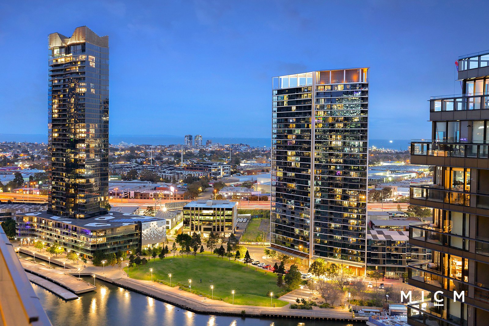 Floor-to-ceiling glass hems this radiant retreat and reveals a northern panorama extending across the city skyline, Marvel Stadium and the blue-water beauty of Victoria Harbour. Wide-reaching living and dining pivots a stone-finished kitchen graced with a mirrored splashback, a Fisher and Paykel dish-drawer, and premium Miele appliances including a 4-burner gas cooktop. Make a seamless connection with a commanding balcony featuring picturesque views across the city, Yarra River, Port Phillip Bay and everything in between.