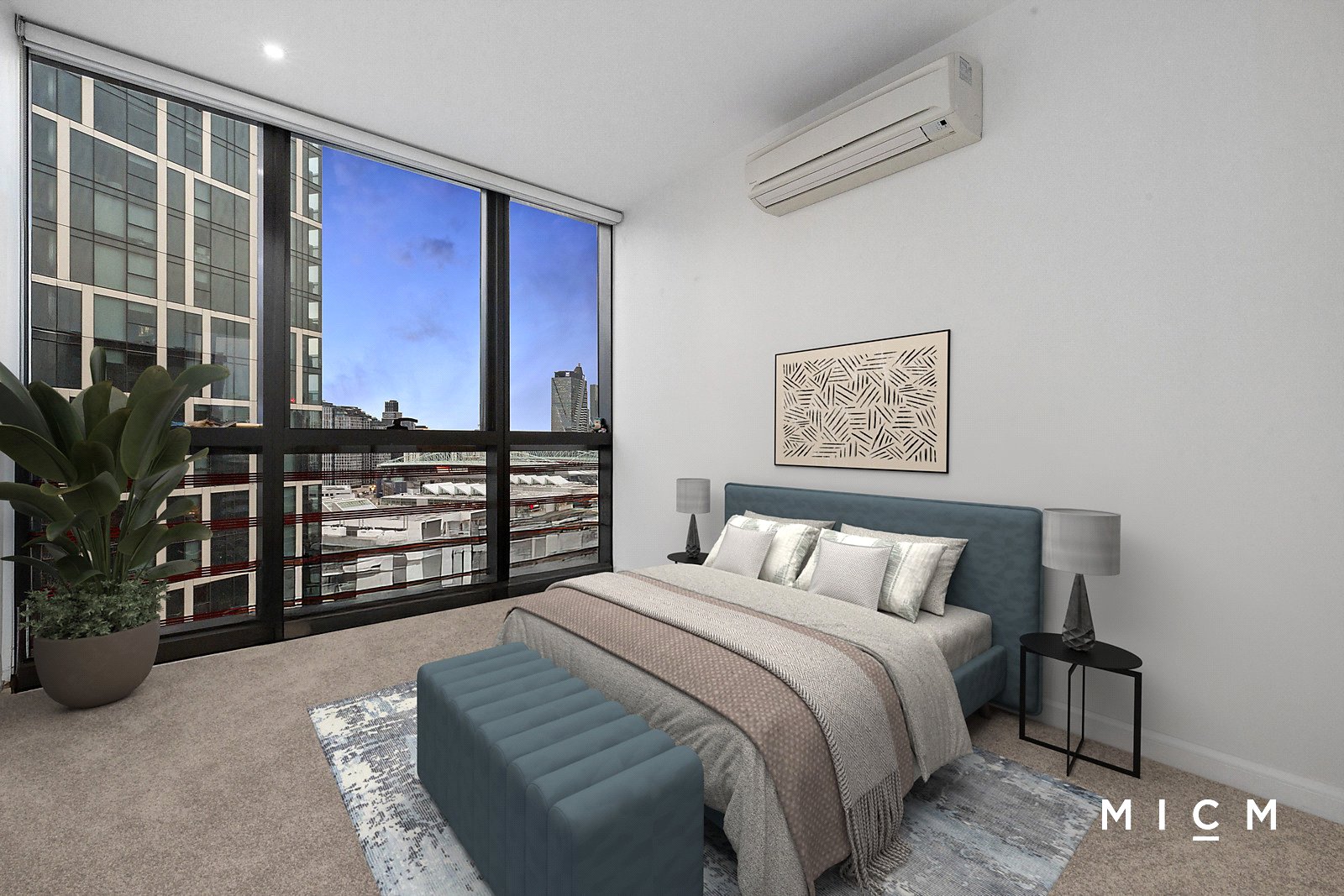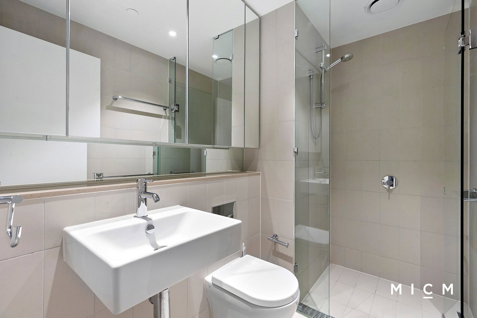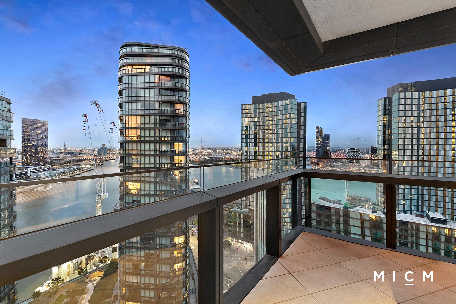 Floor-to-ceiling glass hems this radiant retreat and reveals a northern panorama extending across the city skyline, Marvel Stadium and the blue-water beauty of Victoria Harbour. Wide-reaching living and dining pivots a stone-finished kitchen graced with a mirrored splashback, a Fisher and Paykel dish-drawer, and premium Miele appliances including a 4-burner gas cooktop. Make a seamless connection with a commanding balcony featuring picturesque views across the city, Yarra River, Port Phillip Bay and everything in between.