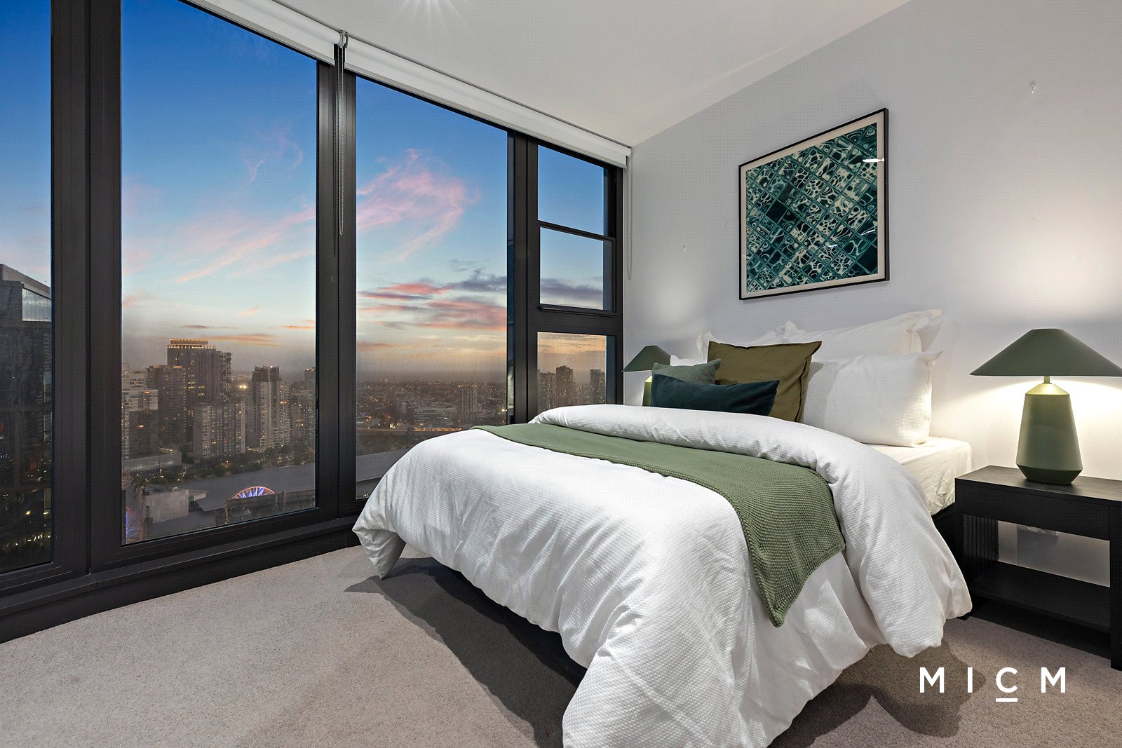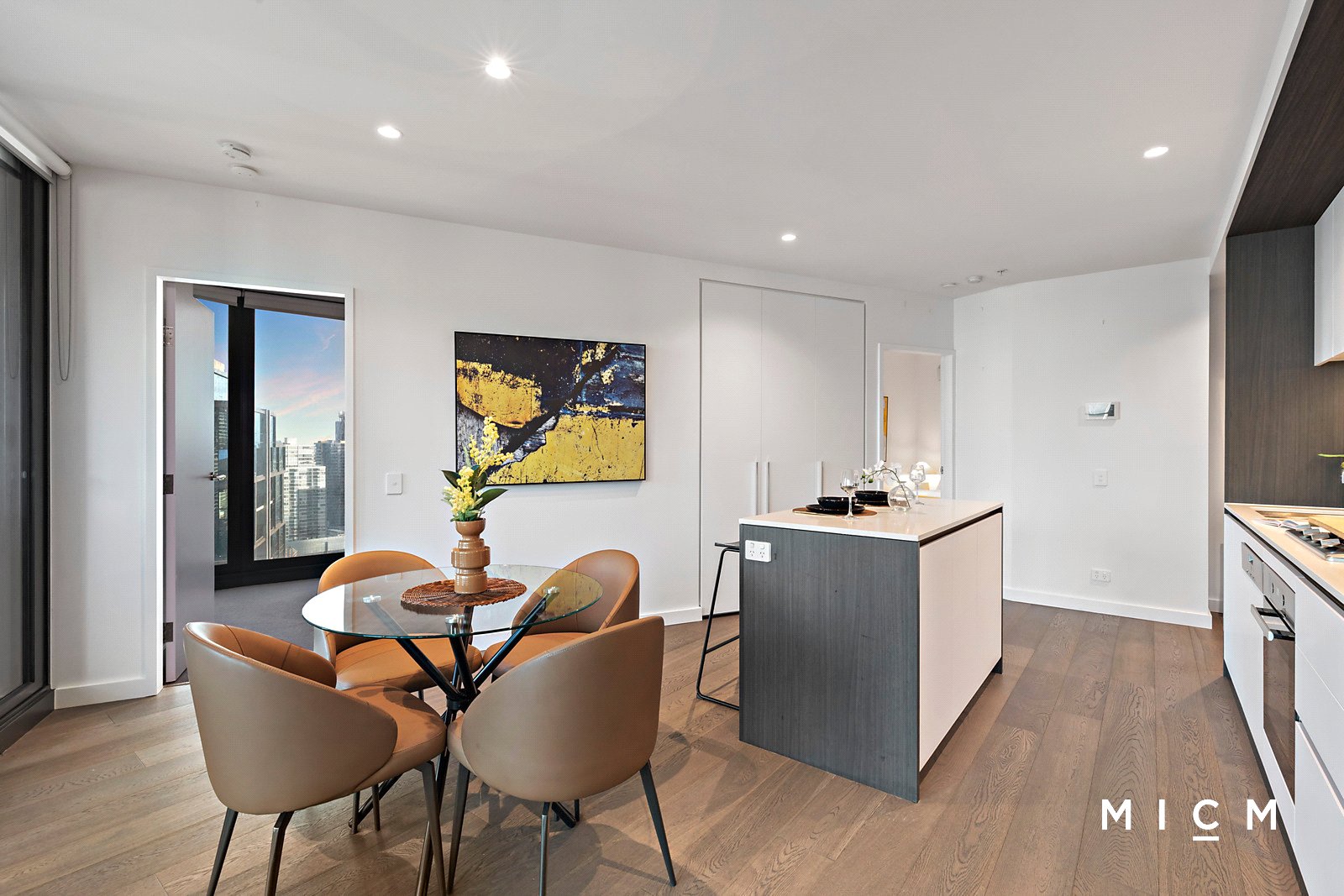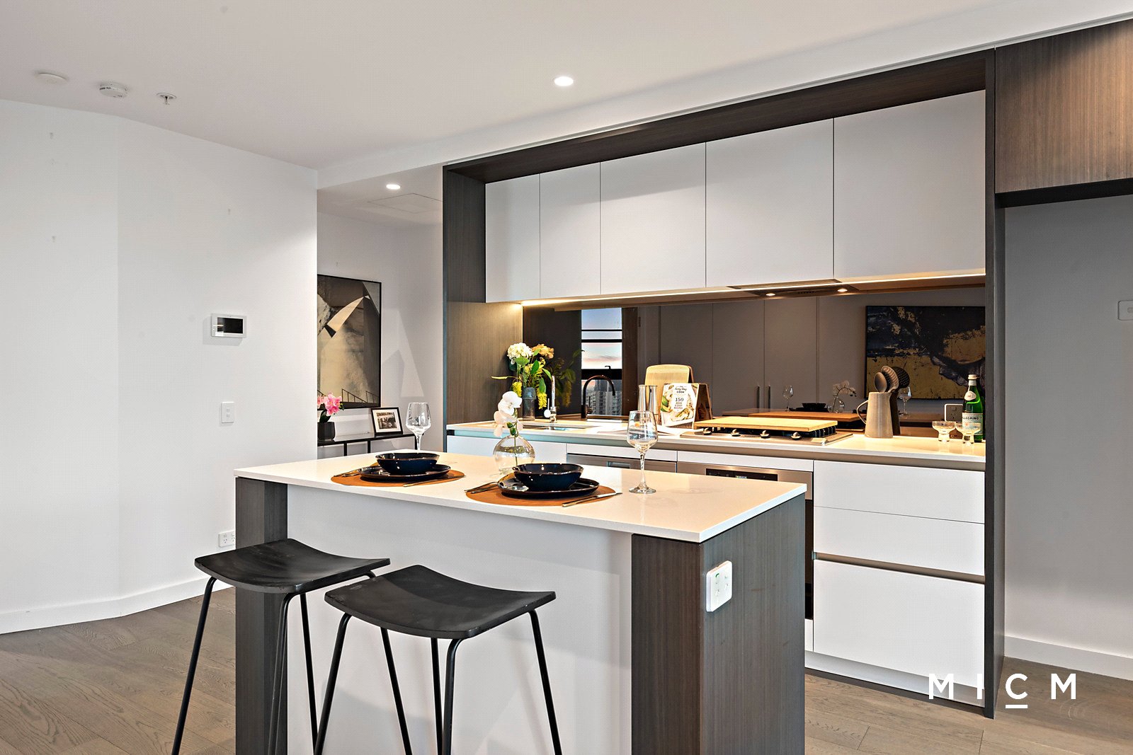The light-filled layout maximises space in a commanding corner setting. Enjoy wide-reaching open-plan living and dining, complemented by a stone-finished kitchen graced with an inviting island bench, a mirrored splashback, soft-closing cabinetry, and the full suite of high-quality Miele appliances including a dishwasher and a 4-burner gas cooktop. Always free-flowing on the 29th floor of the magnificent Melbourne Quarter complex, spill outside to a private undercover balcony featuring striking views over the Yarra River and the stunning neighbourhood skyline. The generously sized bedrooms are filled with light, serviced by mirrored built-in robes and a pristine pair of luxe bathrooms with mirrored cabinetry, concealed cisterns and floor-to-ceiling tiles.