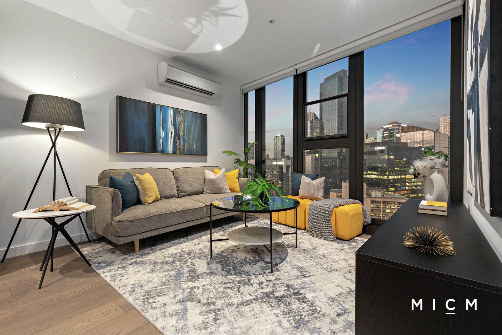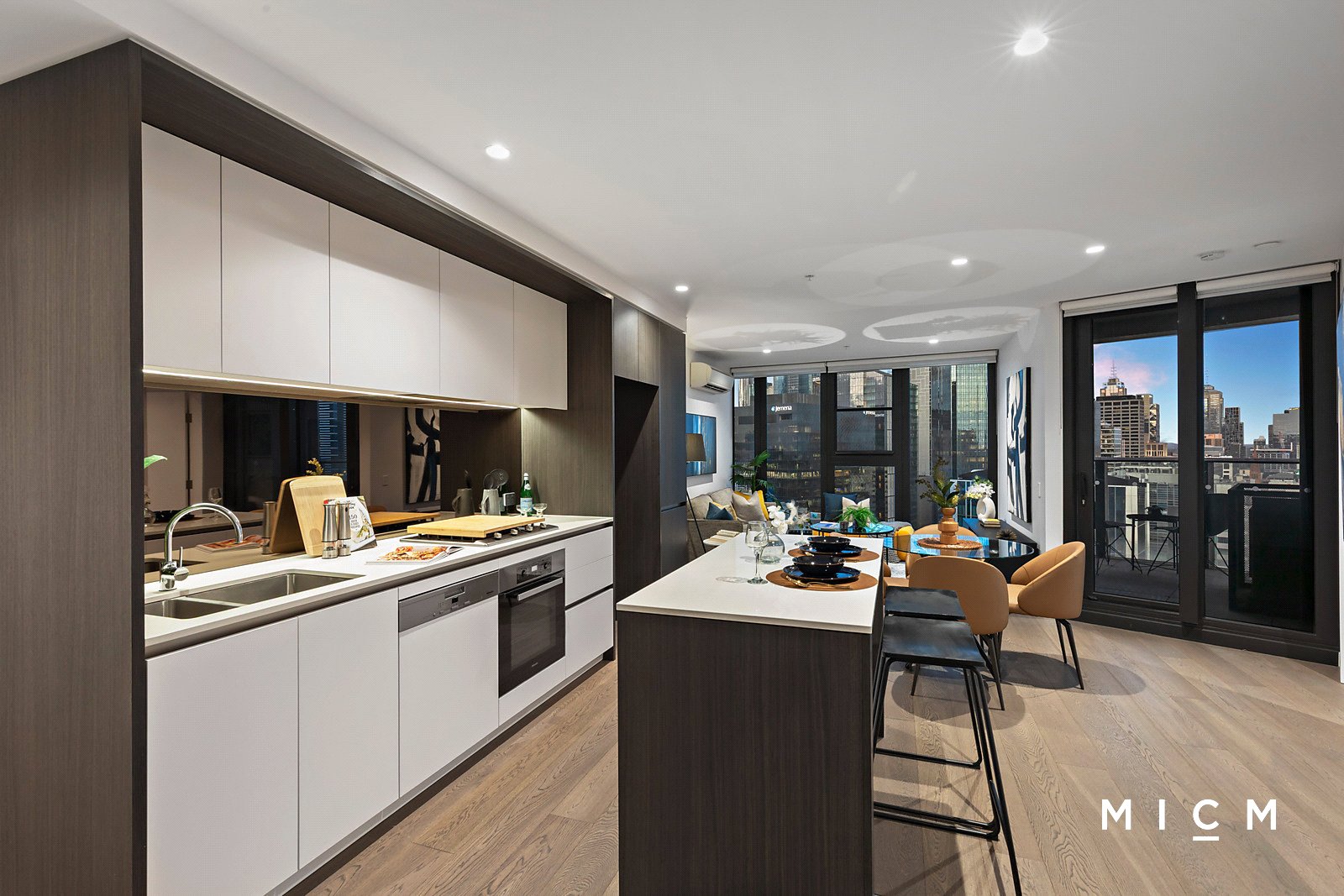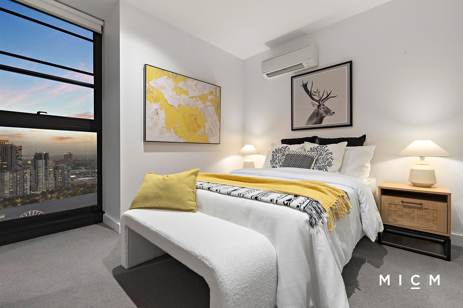 The light-filled layout maximises space in a commanding corner setting. Enjoy wide-reaching open-plan living and dining, complemented by a stone-finished kitchen graced with an inviting island bench, a mirrored splashback, soft-closing cabinetry, and the full suite of high-quality Miele appliances including a dishwasher and a 4-burner gas cooktop. Always free-flowing on the 29th floor of the magnificent Melbourne Quarter complex, spill outside to a private undercover balcony featuring striking views over the Yarra River and the stunning neighbourhood skyline. The generously sized bedrooms are filled with light, serviced by mirrored built-in robes and a pristine pair of luxe bathrooms with mirrored cabinetry, concealed cisterns and floor-to-ceiling tiles.