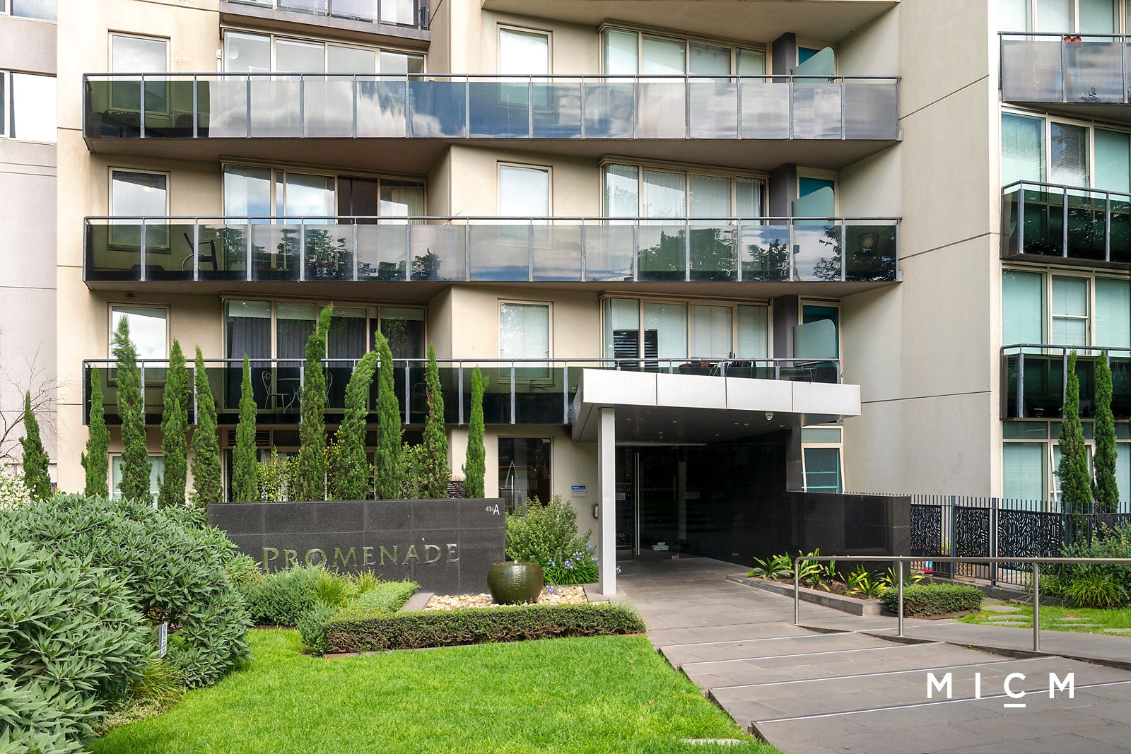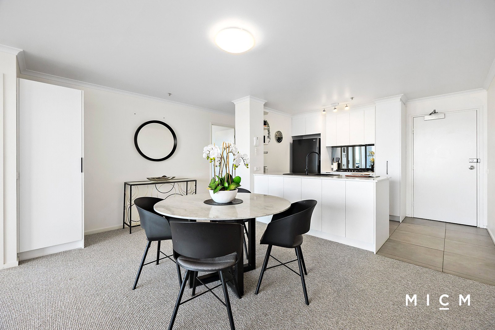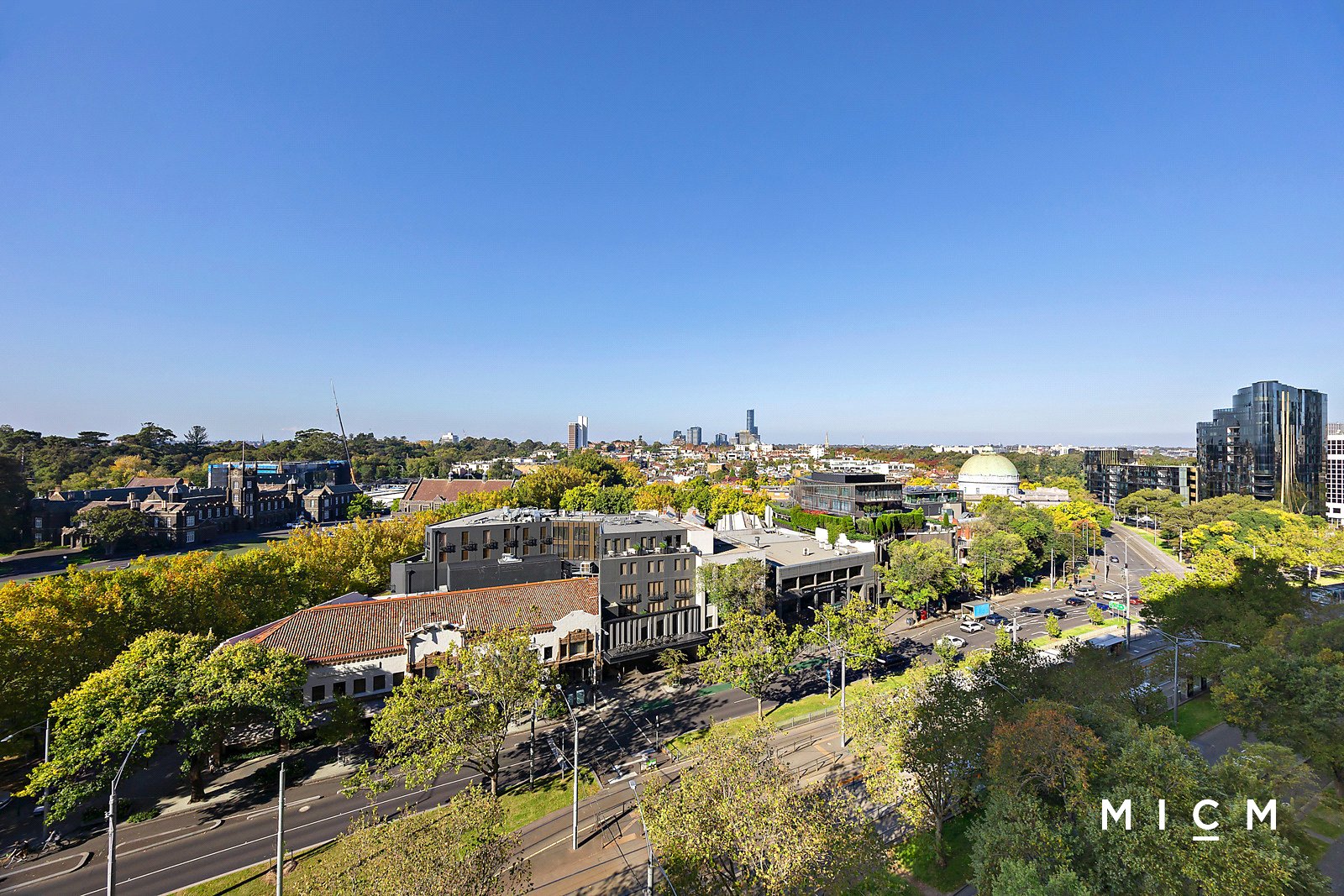 Spacious and air-conditioned open-plan living and dining is complemented by a renovated kitchen with a breakfast bar, sleek stone surfaces, mirrored splashback, black graphite sink, quality tapware, and high-end appliances including a dishwasher and a 4-burner gas cooktop. Perched on the 11th floor of the popular Promenade complex, step outside on a sheltered east-facing balcony and entertain in alfresco style with spectacular vistas sweeping over the heritage buildings of Melbourne Grammar before landing on glimpses of the MCG, the Royal Botanic Gardens, and the soaring city skyline to the north. This commanding backdrop will be the highlight of every celebration! Generously sized, the light-filled bedrooms are serviced by a rejuvenated bathroom graced with floor-to-ceiling tiles, a stone-topped vanity, mirrored cabinetry, and rainfall/hand-held shower fittings. The palatial main bedroom is enhanced by the inclusion of roomy fitted walk-in robes, large enough to repurpose as a private study or storeroom, if desired.