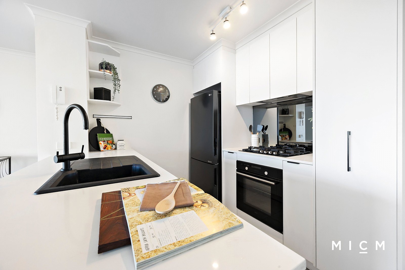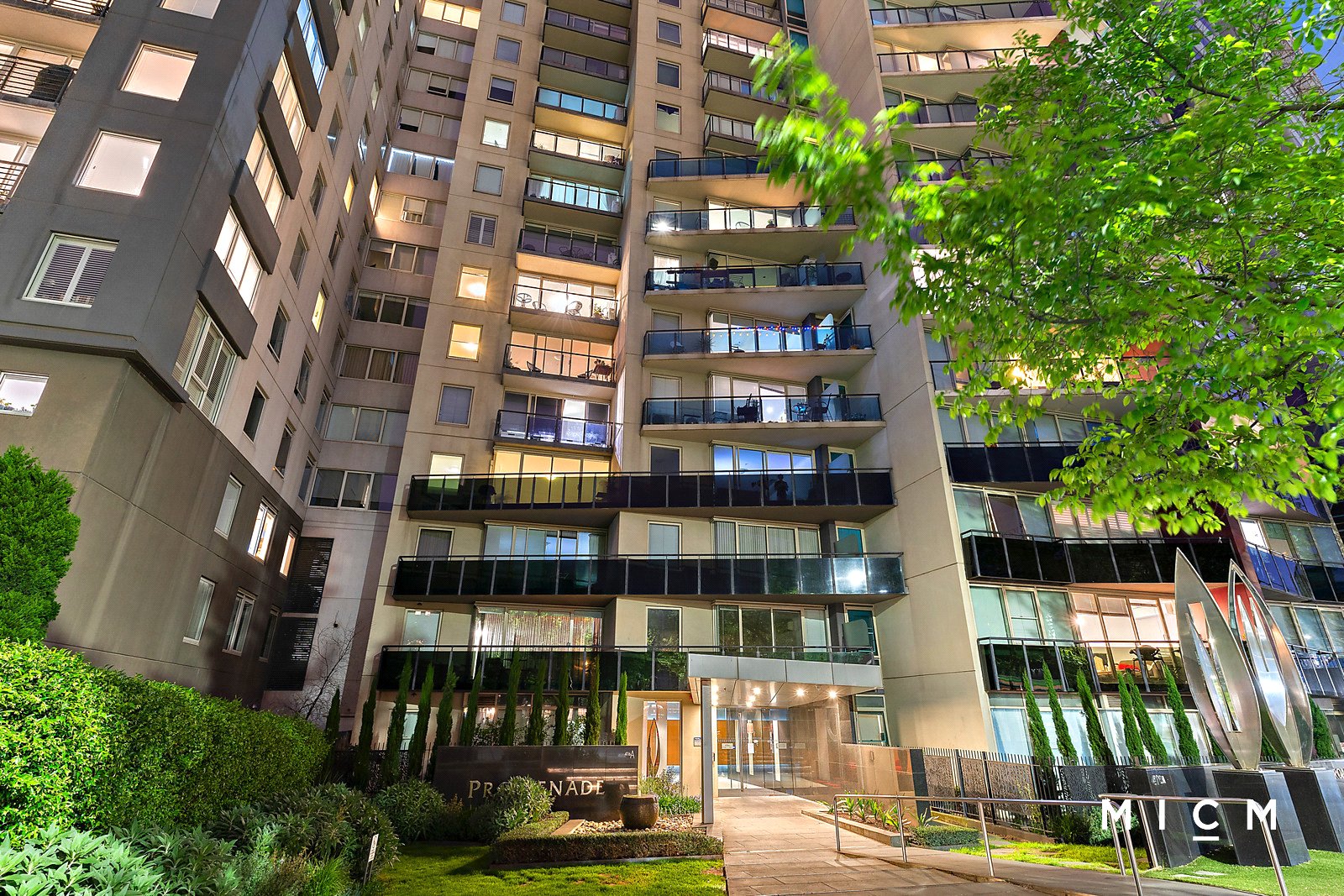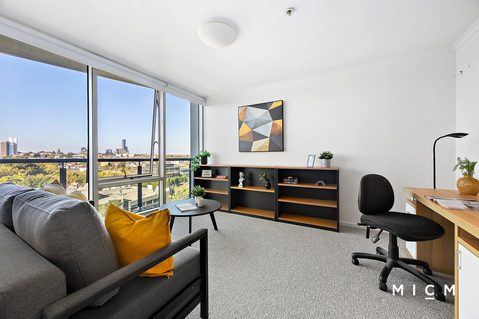 Spacious and air-conditioned open-plan living and dining is complemented by a renovated kitchen with a breakfast bar, sleek stone surfaces, mirrored splashback, black graphite sink, quality tapware, and high-end appliances including a dishwasher and a 4-burner gas cooktop. Perched on the 11th floor of the popular Promenade complex, step outside on a sheltered east-facing balcony and entertain in alfresco style with spectacular vistas sweeping over the heritage buildings of Melbourne Grammar before landing on glimpses of the MCG, the Royal Botanic Gardens, and the soaring city skyline to the north. This commanding backdrop will be the highlight of every celebration! Generously sized, the light-filled bedrooms are serviced by a rejuvenated bathroom graced with floor-to-ceiling tiles, a stone-topped vanity, mirrored cabinetry, and rainfall/hand-held shower fittings. The palatial main bedroom is enhanced by the inclusion of roomy fitted walk-in robes, large enough to repurpose as a private study or storeroom, if desired.