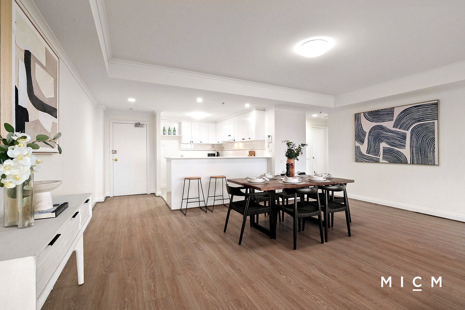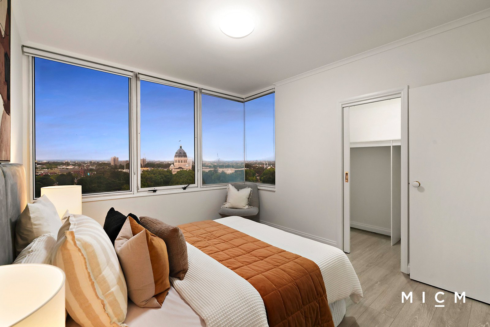 Set in a coveted corner setting on the 14th floor of the sought-after Spring Street Towers building, glide across recently installed floorboards through dedicated space for wide-reaching open-plan living and dining. A newly refreshed kitchen boasts a breakfast bar and stainless-steel appliances including a dishwasher and a 4-burner gas cooktop. Spill outside to a sheltered balcony overlooking the lush greenery of Carlton Gardens and the iconic dome of the Royal Exhibition Building. An undeniable highlight of the home, this spectacular perch is perfect for relaxing, dining and entertaining in gentle morning light. Generously sized and robed, all three north-facing bedrooms share the spectacular views, while the master suite flaunts roomy walk-in robes and the sparkling bathroom is graced with a separate WC and a shower over a bathtub.