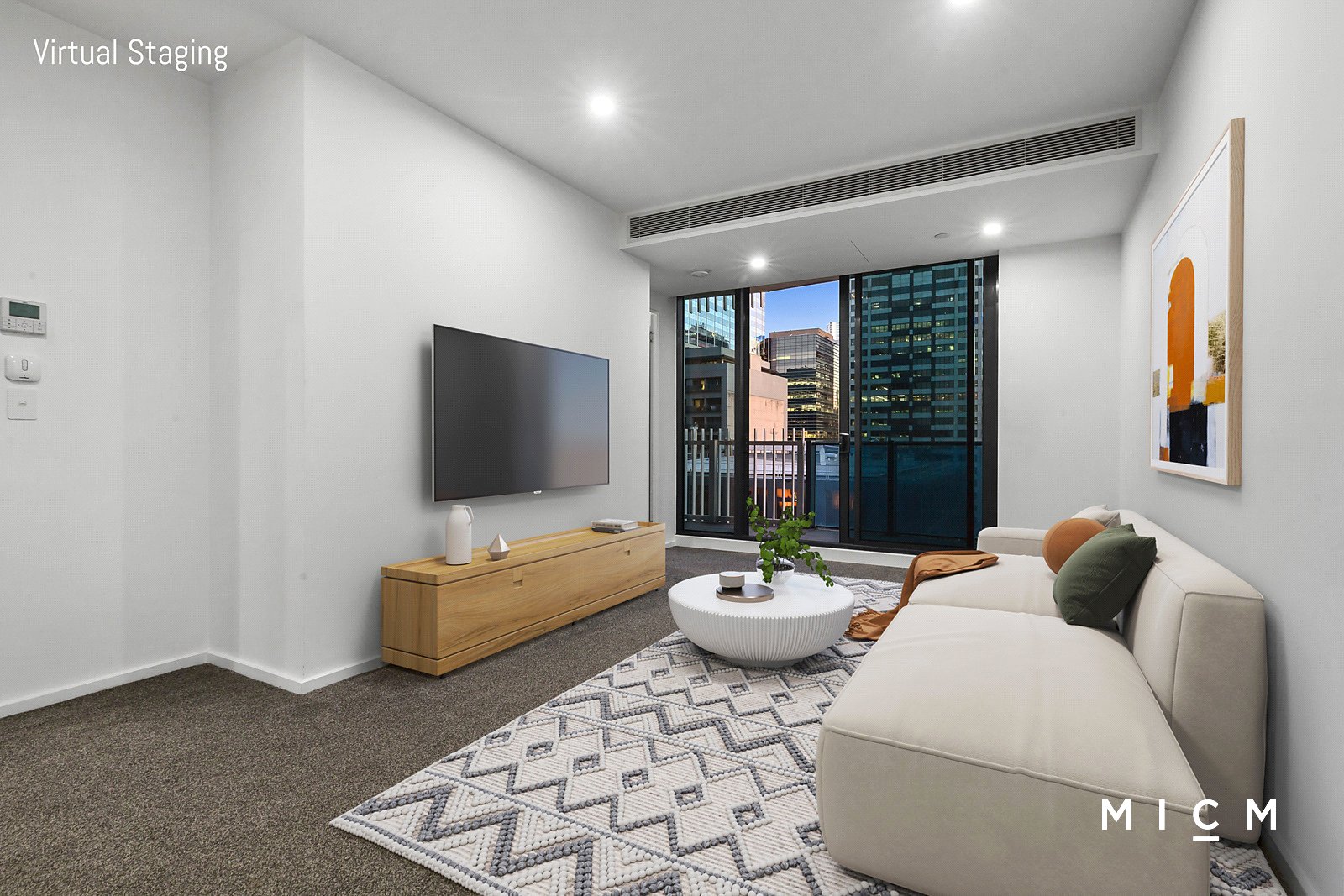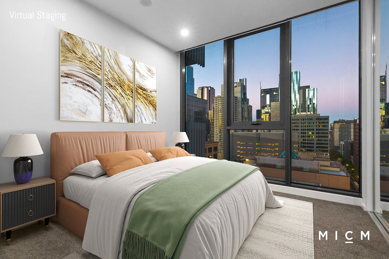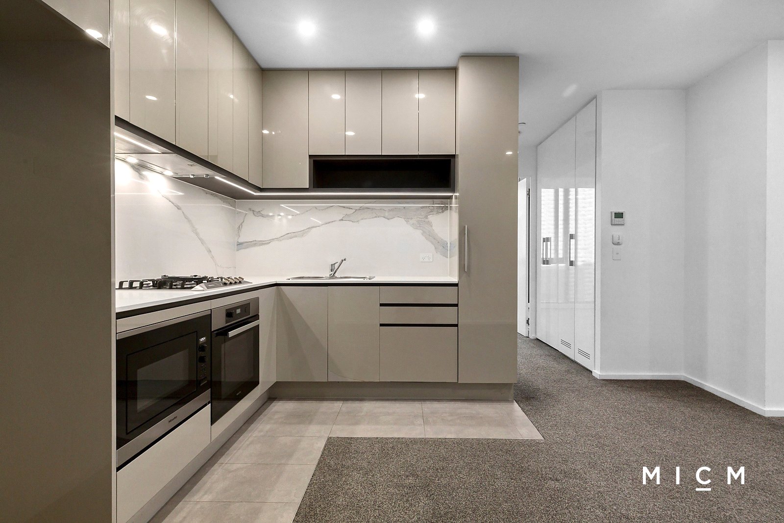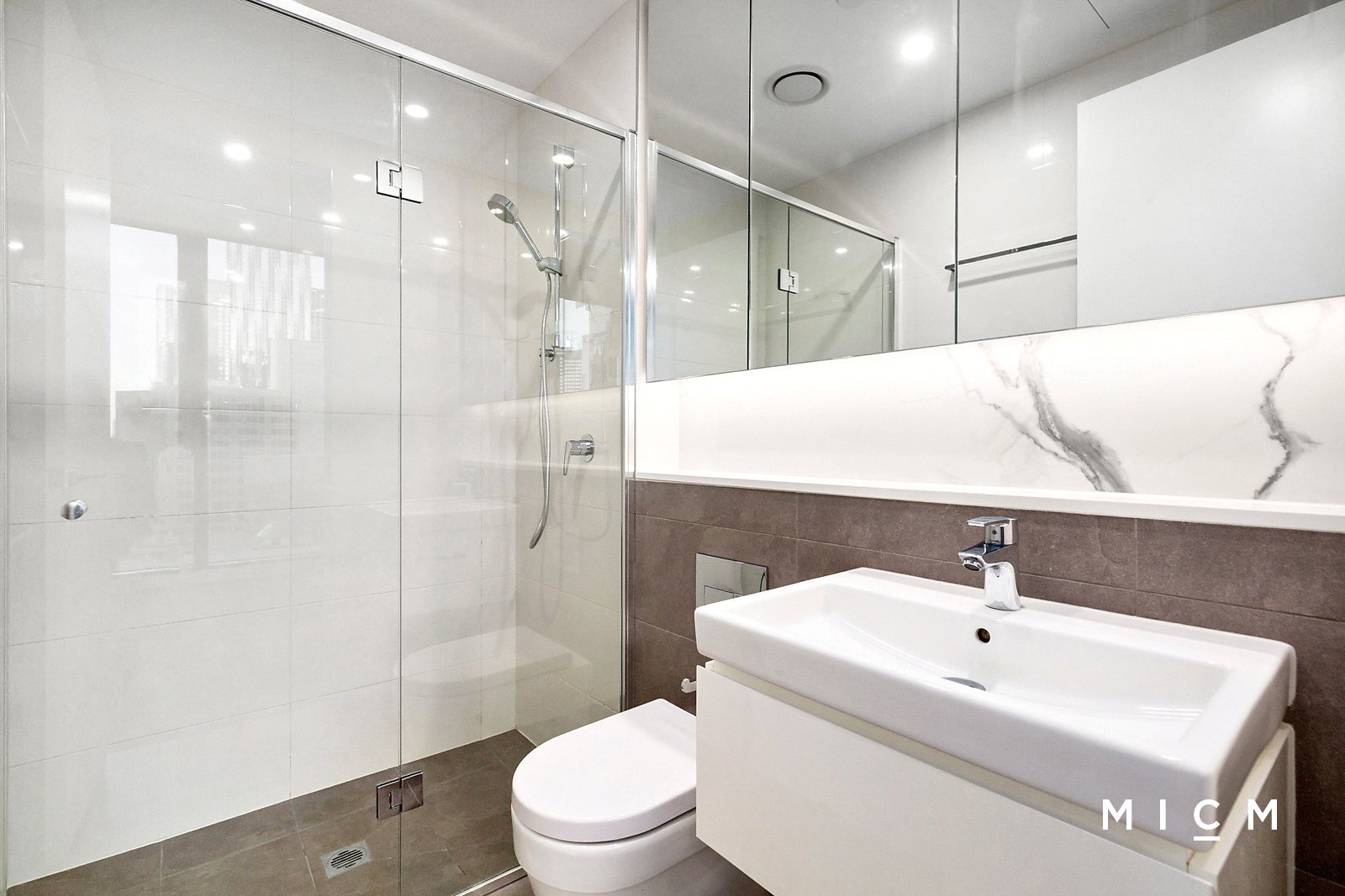 Natural sunlight streams across spacious open-plan living and dining, underscored by an L-shaped kitchen showcasing stone finishes, soft-closing cabinetry, a Fisher and Paykel dish-drawer, and high-end Miele appliances including an integrated microwave and a 4-burner gas cooktop. Making the most of a corner setting 18 floors high in the sleek Melbourne Grand complex, elevate yourself on a sheltered balcony and feel the heartbeat of the city with captivating views to the south and east. The mirror-robed and generously sized bedrooms take a share of the spectacular outlook through floor-to-ceiling glass, superbly serviced by a pristine pair of fully tiled bathrooms with mirrored cabinetry.