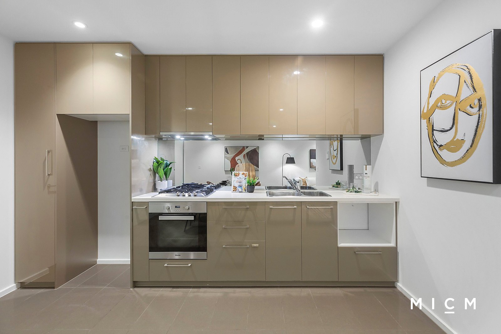 Wide-reaching open-plan living and dining is complemented by a stone-finished kitchen graced with soft-closing cabinetry, a premium Fisher and Paykel dish-drawer, and a selection of Miele appliances including a 4-burner gas cooktop and an integrated microwave. Floor-to-ceiling glass slides open to reveal a sheltered balcony basking in northern sunlight and highlighting the city skyline, Flagstaff Gardens, and the mountainous horizon. Always free-flowing, the generously sized and robed bedrooms are serviced by a pristine pair of fully tiled bathrooms.