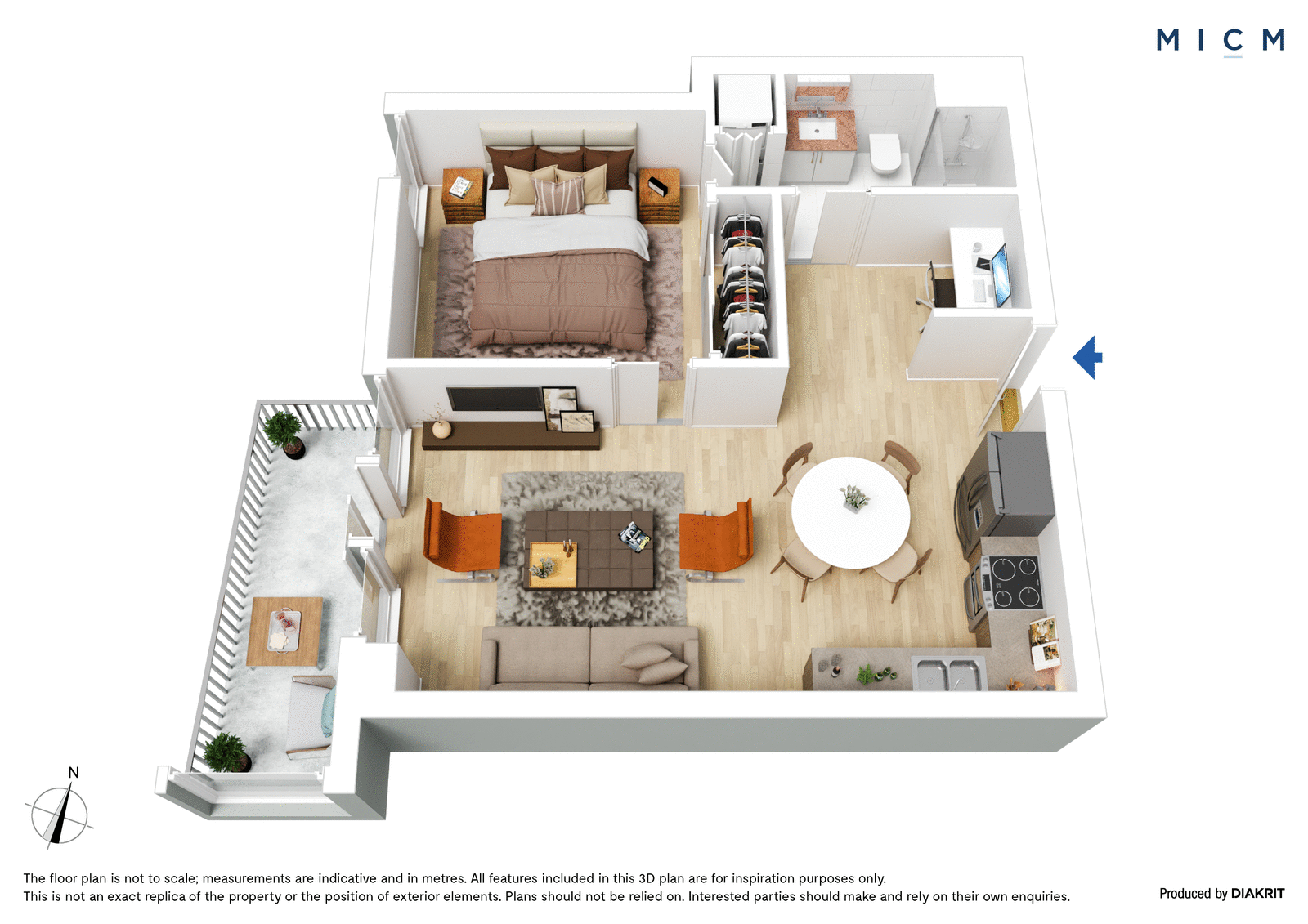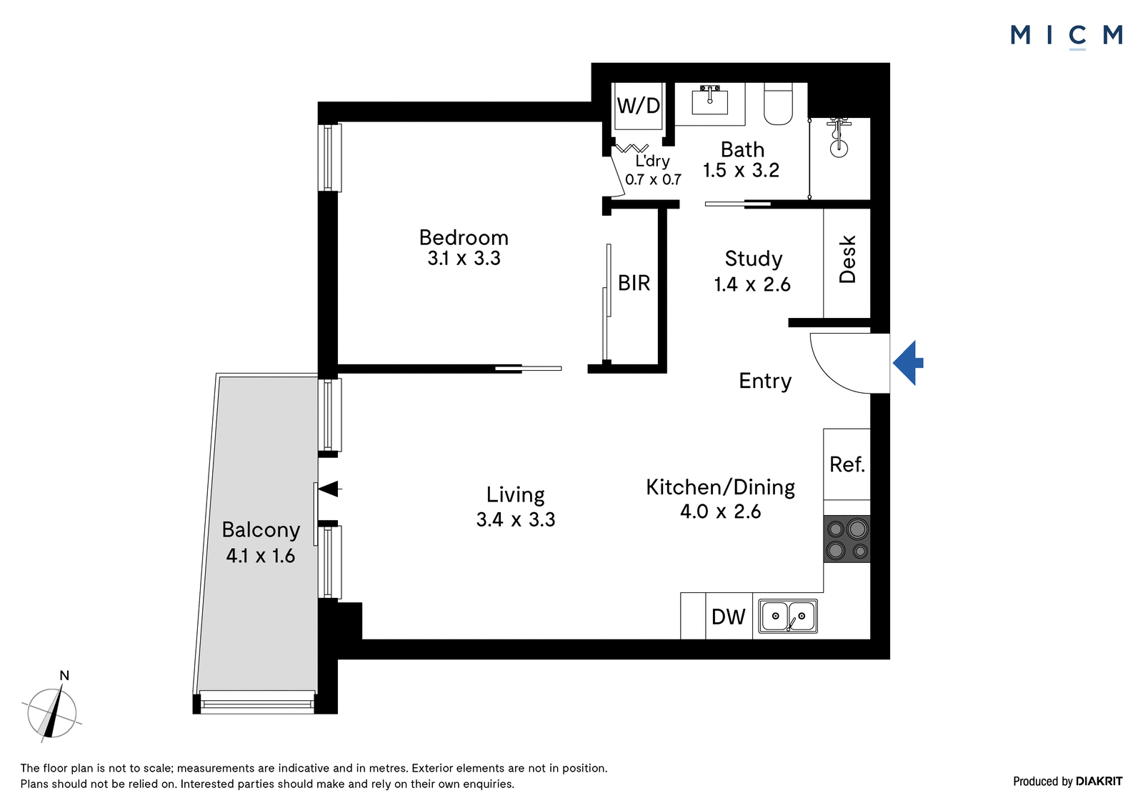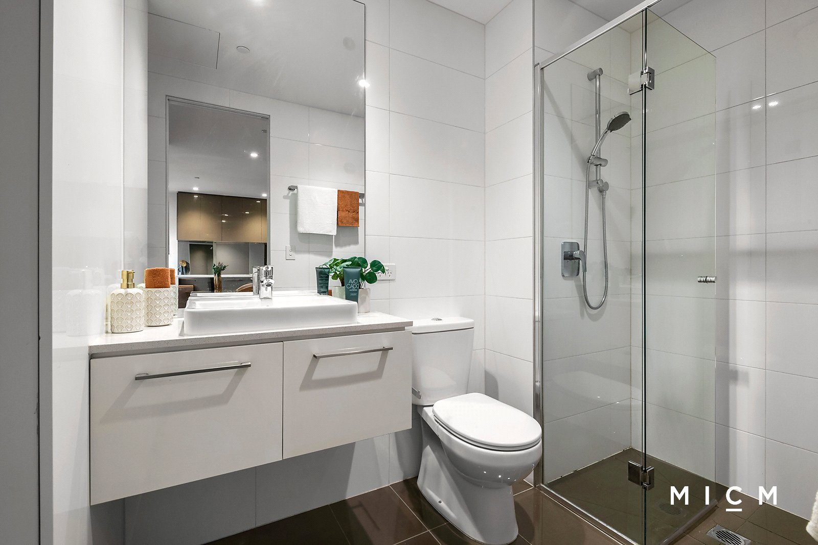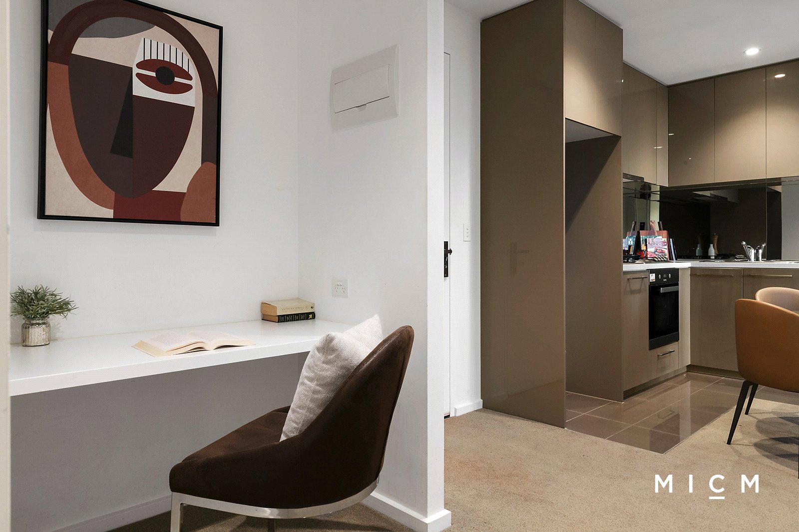 An L-shaped kitchen boasts smooth stone surfaces, a mirrored splashback, soft-closing cabinetry, a Fisher and Paykel dish-drawer, and premium Miele appliances including a microwave and a 4-burner gas cooktop. Wide-reaching living and dining is enhanced by an open study with a built-in workstation, ideal for students and also working from home. Connect with an undercover balcony highlighting the neighbourhood skyline and the mountainous northern horizon. A generously sized and naturally lit bedroom is serviced by mirrored built-in robes and a two-way bathroom with full-height tiles and a stone-topped vanity.