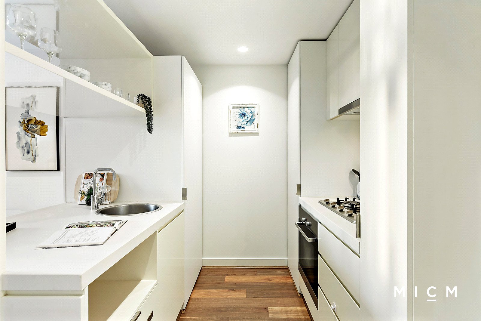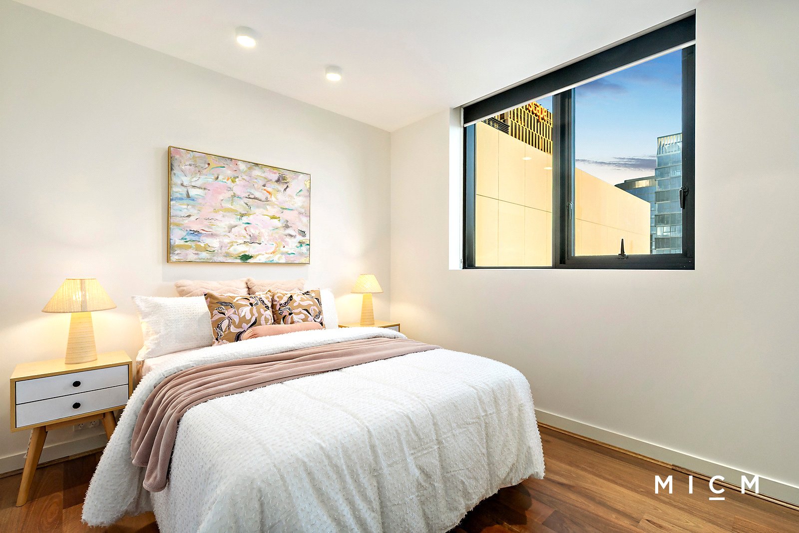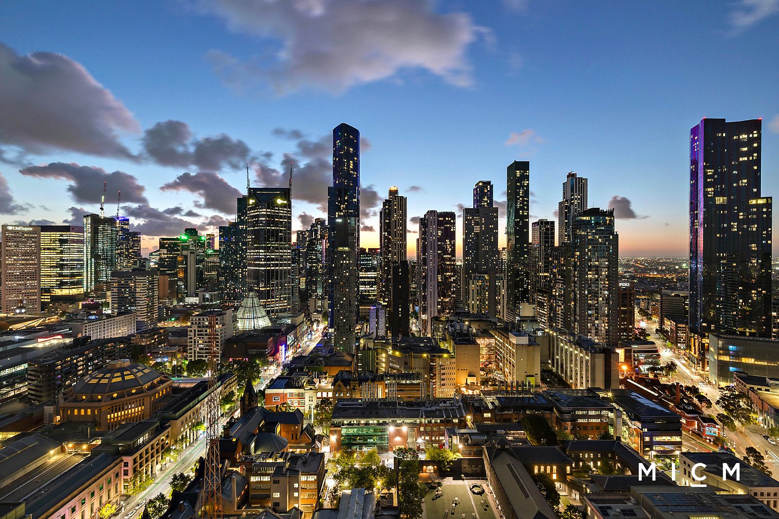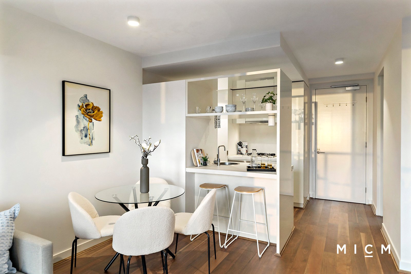 Roomy open-plan living and dining pivots a stone-topped kitchen boasting a breakfast bar, ample storage solutions, a concealed fridge space, a Fisher and Paykel dishwasher, and premium Miele appliances including an oven and 4-burner gas cooktop. Floor-to-ceiling glass slides open to a private sheltered balcony with commanding city skyline views extending over the State Library dome, the Melbourne Central Shot Tower, and the mountainous northern horizon. The perfect pair of sizeable bedrooms are filled with light, serviced by mirrored built-in robes and a luxe bathroom with a laundry nook.