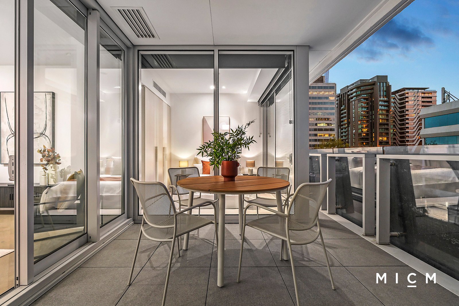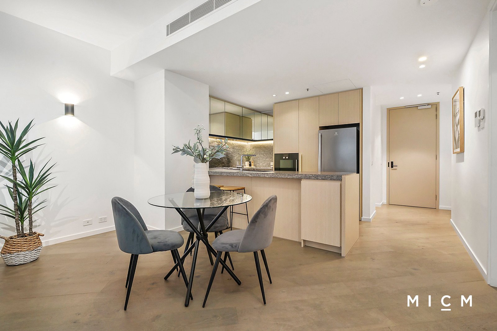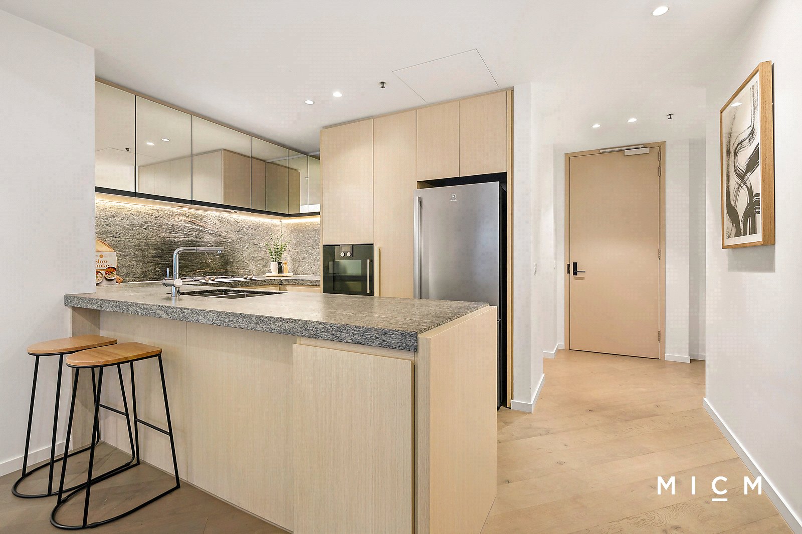 The considered floorplan includes wide-reaching open-plan living and dining basking in northern sunlight. A state-of-the-art kitchen showcases sleek stone surfaces, an inviting breakfast bar, a full-sized dishwasher, and the high performance of premium Gaggenau appliances including a wall oven and a 4-burner gas cooktop. This whole workspace will be a centrepiece for celebration. Superbly situated on the third floor of flawless Fawkner Residences. Step outside from the living space and both bedrooms to a sheltered balcony, ideal for dining and reclining with an after-work drink.