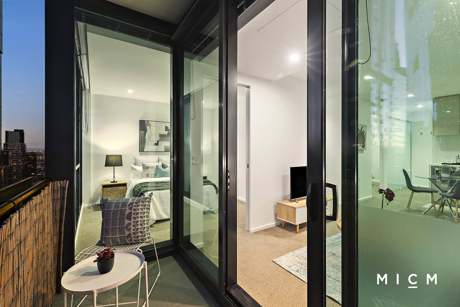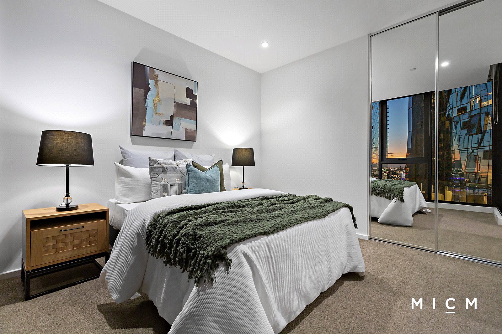 Spacious open-plan living and dining pivots an L-shaped kitchen highlighting slick stone surfaces and integrated appliances including a microwave, 4-burner gas cooktop, and a Fisher and Paykel dish-drawer. Positioned on the 32nd floor of the stylish Melbourne One complex, slide open floor-to-ceiling glass and step outside to a covered balcony highlighting the soaring neighbourhood skyline. A perfect pair of generously sized and mirror-robed bedrooms are serviced by a fully tiled bathroom with a stone-topped vanity. Offered for sale with an option to purchase a selection of the furniture and white goods on display, hit the ground running with a Queen-sized bed, Hisense television and unit, and a large Westinghouse fridge/freezer.