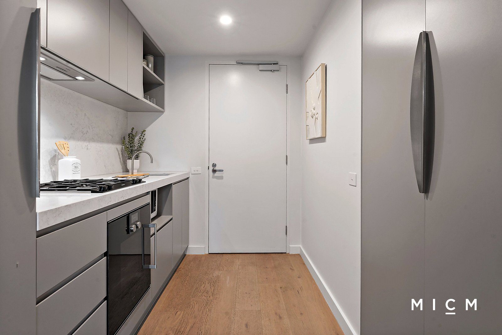 A stone-finished kitchen is chef friendly graced with soft-closing cabinetry, a Fisher and Paykel dish-drawer, and top-of-the-range Gaggenau appliances including a 4-burner gas cooktop. Glide over lightly toned timber flooring through spacious open-plan living/dining and immerse yourself in breathtaking views sweeping over the stunning city skyline, complemented by a sizeable blue-water glimpse of Port Phillip Bay. Peacefully separated by the living space, the generously sized, mirror-robed and air conditioned bedrooms share the spectacular outlook through full-height glass. A perfect pair of fully tiled bathrooms boast ample storage, concealed cisterns, and rainfall/hand-held shower fittings.
