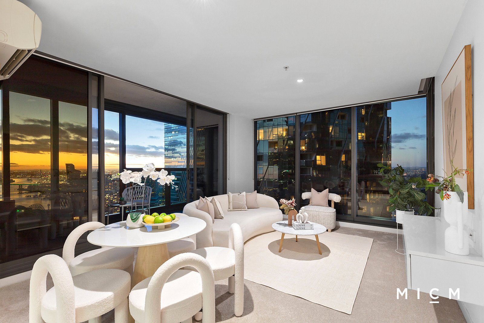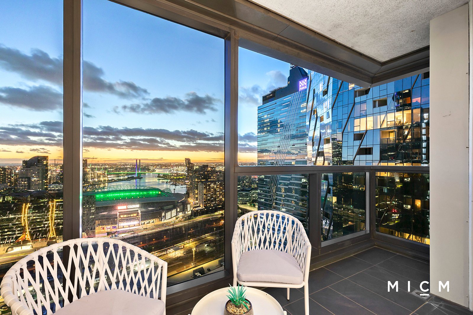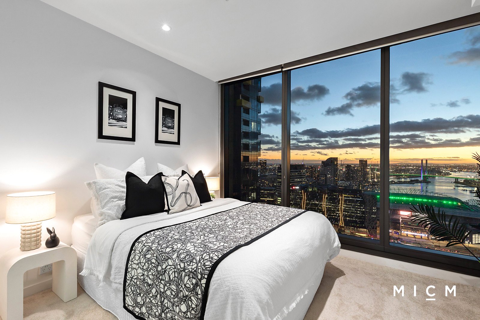 The spectacular use of floor-to-ceiling glass is an overriding feature of this radiant retreat. Spacious open-plan living and dining is underpinned by a stone-topped kitchen boasting soft-closing cabinetry, a mirrored splashback and stainless-steel appliances including an electric cooktop and a dishwasher. Set high on the 34th floor, step outside to a sheltered primary balcony graced with breathtaking views sweeping over the bay, the harbour, Marvel Stadium, and the dazzling Docklands skyline. This private perch is best enjoyed with an after-work drink framed by a colourful sunset. The generously scaled and robed bedrooms are filled with light, serviced by a perfect pair of deluxe bathrooms boasting full-height tiles and mirrored cabinetry. The second bedroom boasts its own north-facing balcony, ideal for watching the city come to life over a morning coffee.