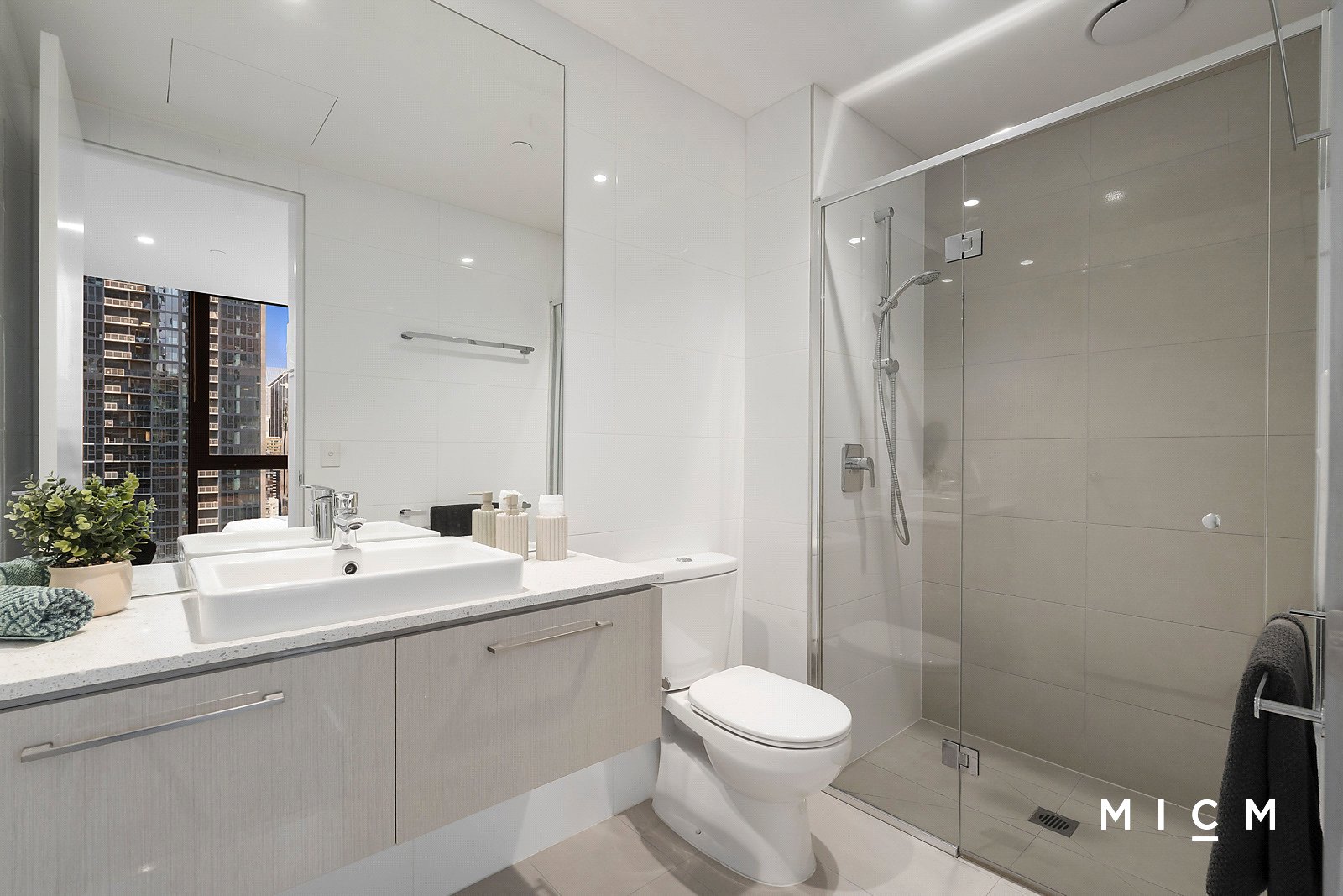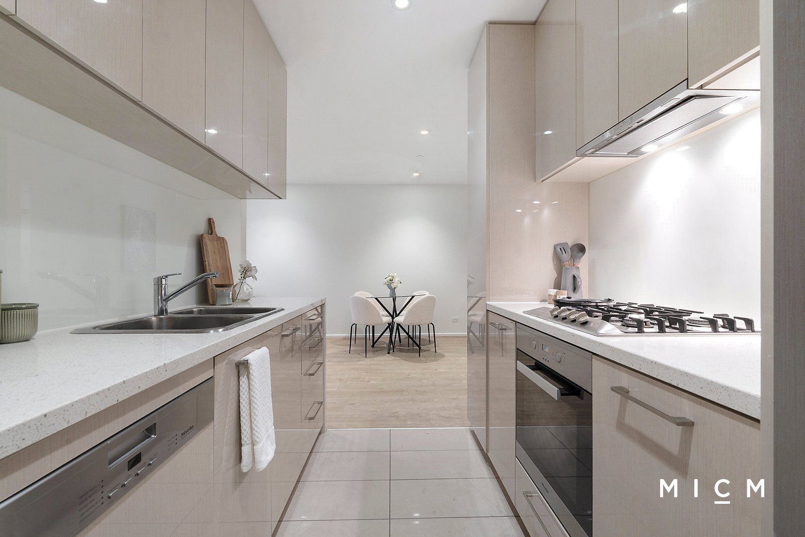 Roomy open-plan living and dining is complemented by a dual-sided kitchen boasting smooth stone surfaces, a waterfall-edged benchtop, and the full suite of high-performing Miele appliances including an integrated microwave, 4-burner gas cooktop, and a full-sized dishwasher. Enjoy a sheltered east-facing balcony capturing the warmth of morning sunlight and sweeping city skyline views. Both bedrooms are generously sized, serviced by mirrored built-in robes and a pristine pair of fully tiled bathrooms.