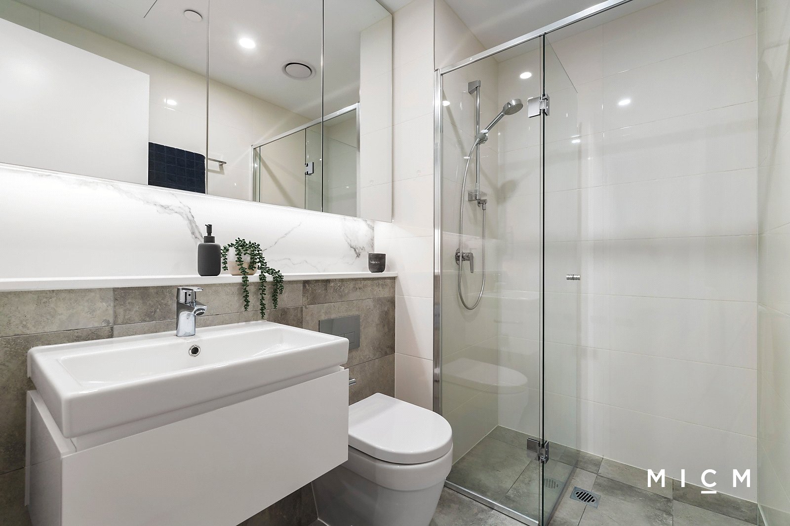 Spacious open-plan living and dining pivots a stone-finished kitchen featuring soft-closing cabinetry, a Fisher and Paykel dish-drawer, and quality Miele appliances including a microwave and a 4-burner gas cooktop. An undercover east-facing balcony spreads out in the gentle warmth of morning light, while showcasing commanding views sweep over the soaring city skyline towards the dramatic Dandenong Ranges. Alfresco entertaining will be a dream in this radiant retreat! The generously sized and light-filled bedrooms are serviced by mirrored built-in robes and a perfect pair of fully tiled bathrooms with mirrored cabinetry and concealed cisterns. Additionally, the oversized main bedroom boasts a sizeable study zone, ideal for students or for work-from-home professionals.
