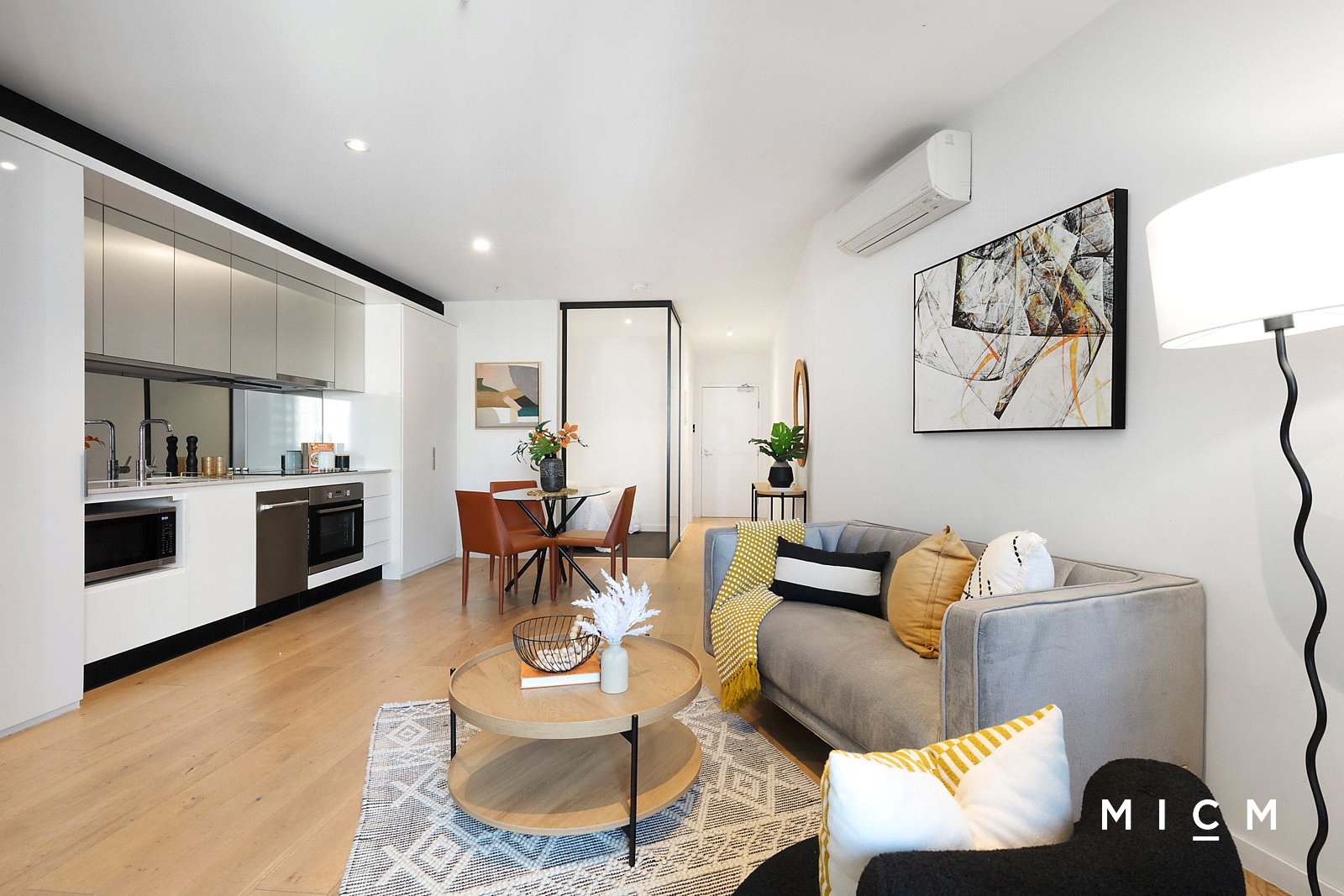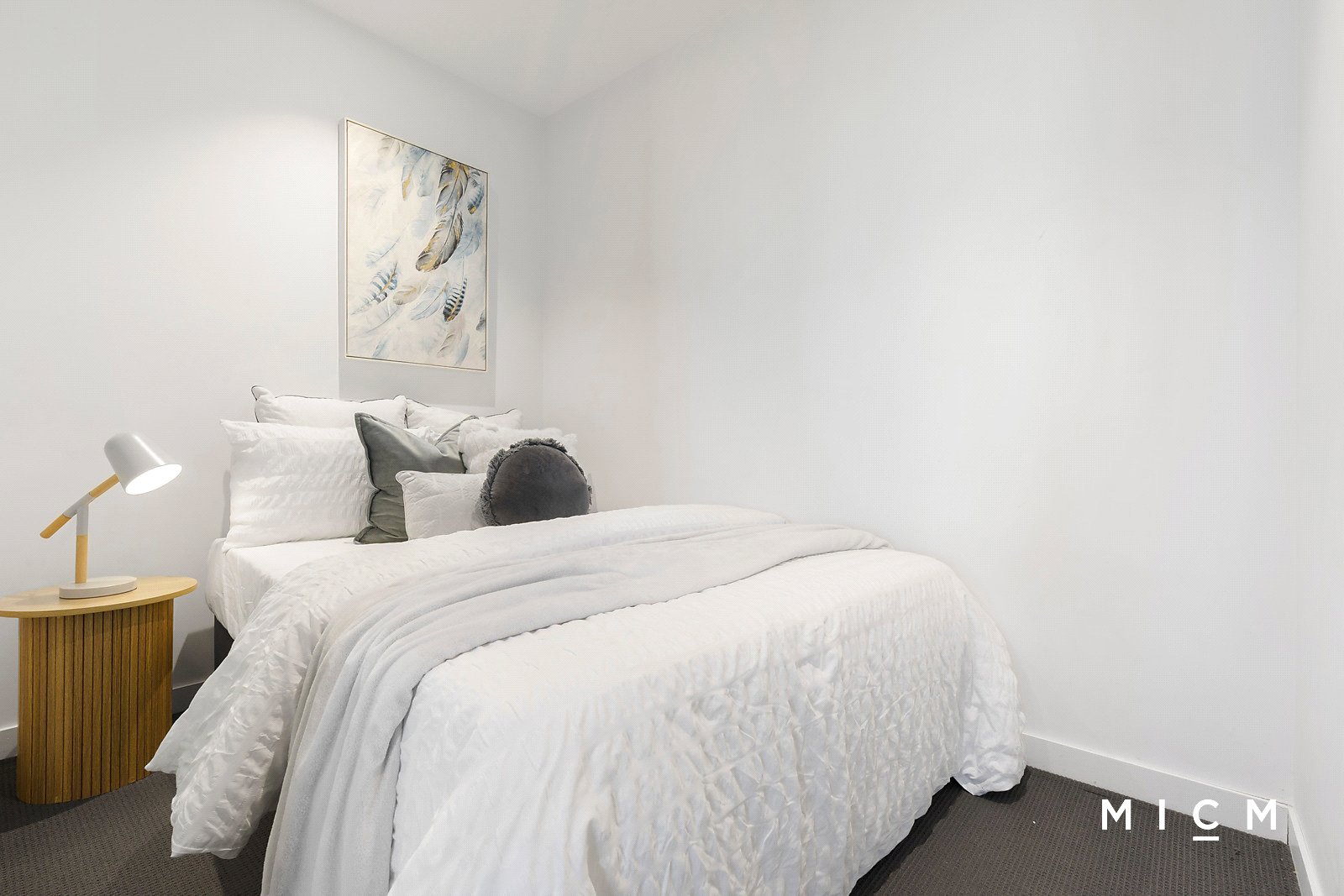 Discover a stone-topped kitchen with stainless-steel appliances including a dishwasher and an easy-clean electric cooktop. Always free-flowing, spacious open-plan living and dining connects with a sheltered balcony showcasing unrivalled views sweeping over the city skyline, the Yarra River, and the blue-water beauty of Port Phillip Bay. Both bedrooms are generously sized, serviced by a sleek bathroom with mirrored cabinetry and a fully tiled shower area.