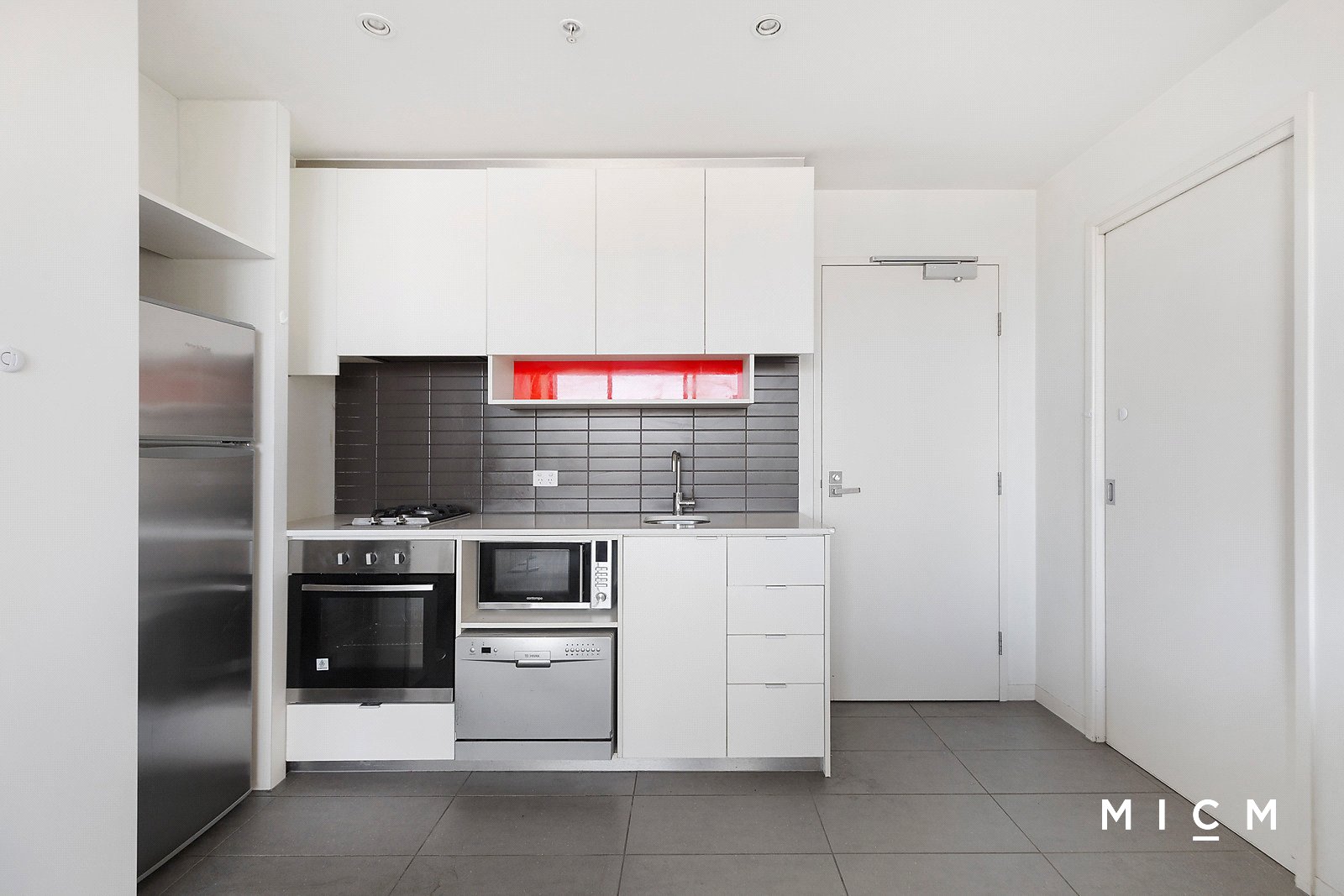 Roomy open-plan living and dining pivots a stone-topped kitchen showcasing stainless-steel appliances including an oven, dishwasher, microwave and a gas cooktop. Set inside the boutique Infinity 8 complex, step outside to a sheltered north-facing balcony showcasing striking views over Queen Vic Market, the neighbouring skyline, and the mountainous horizon. Enjoy a pair of bedrooms with the main offering built-in robes, while the sleek bathroom is graced with a fully tiled shower area and a laundry nook with a sink, washing machine and a dryer.