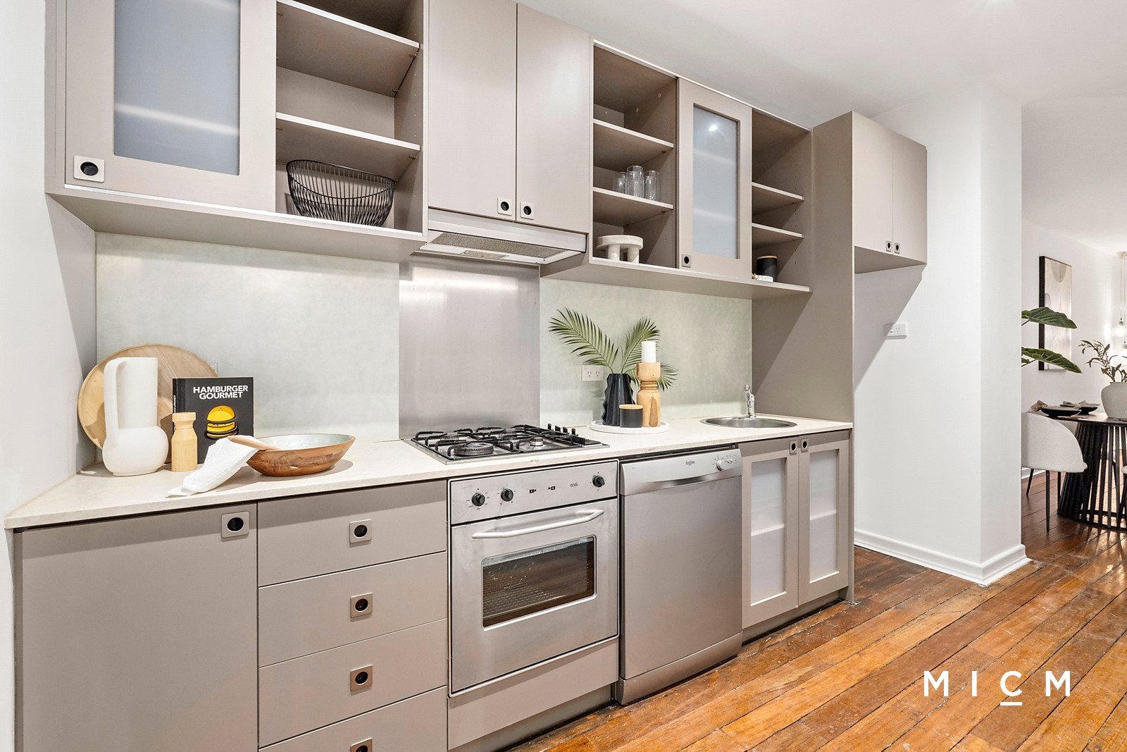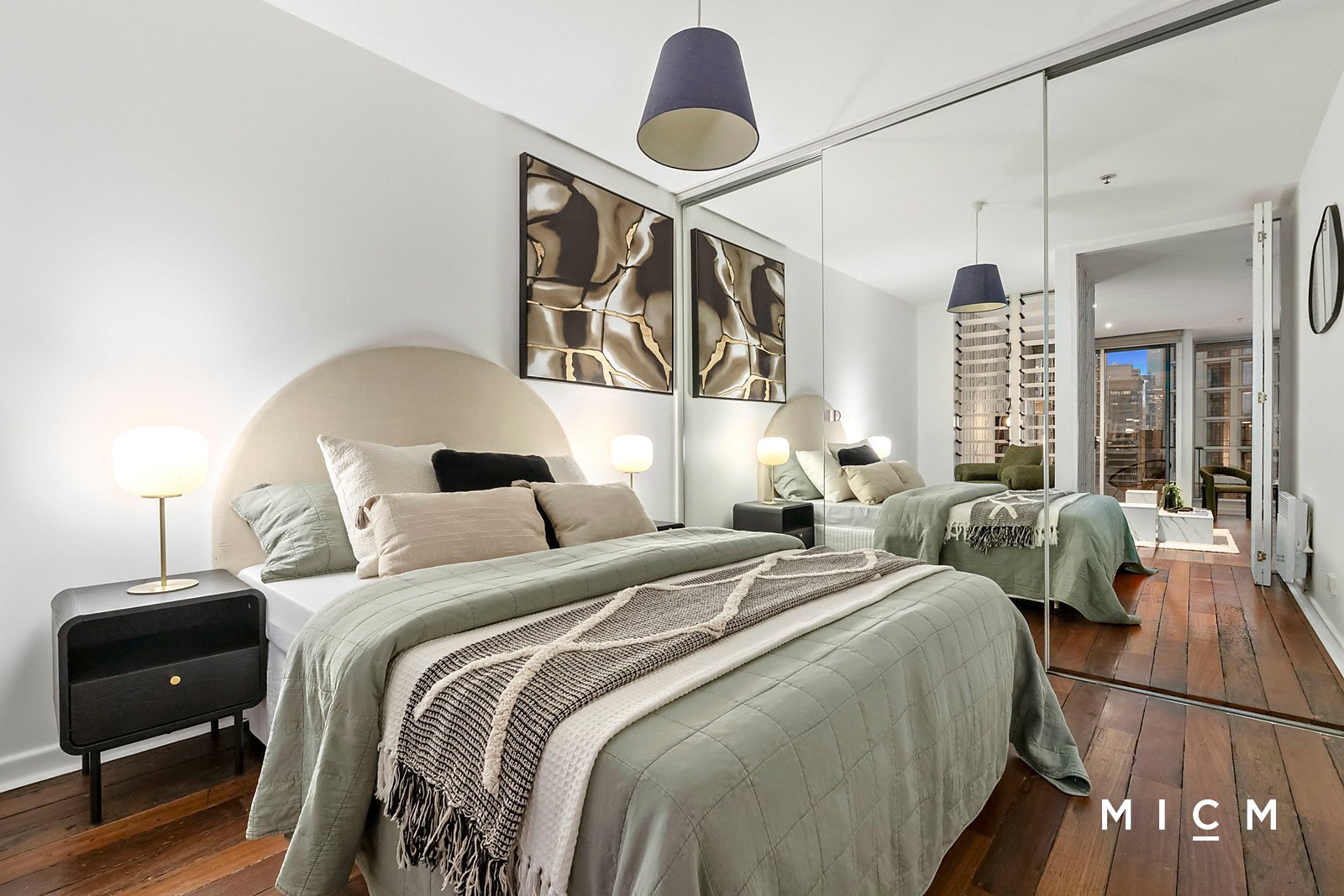 The design-driven quality is on stunning display from the very first step inside. Glide across reclaimed hardwood flooring throughout spacious open-plan living and dining, framed by exquisite British-manufactured Cole & Son wallpaper. A streamlined kitchen is graced with sleek stone surfaces, a full-sized dishwasher and a 4-burner gas cooktop. Privately placed on the 9th floor inside the prestigious Philadelphia building, step outside to a commanding balcony showcasing a soaring city skyline backdrop. A generously sized and heated bedroom is serviced by extensive mirrored built-in robes and an ultra-stylish bathroom with floor-to-ceiling tiles.