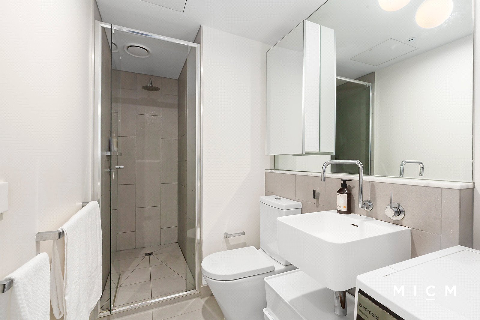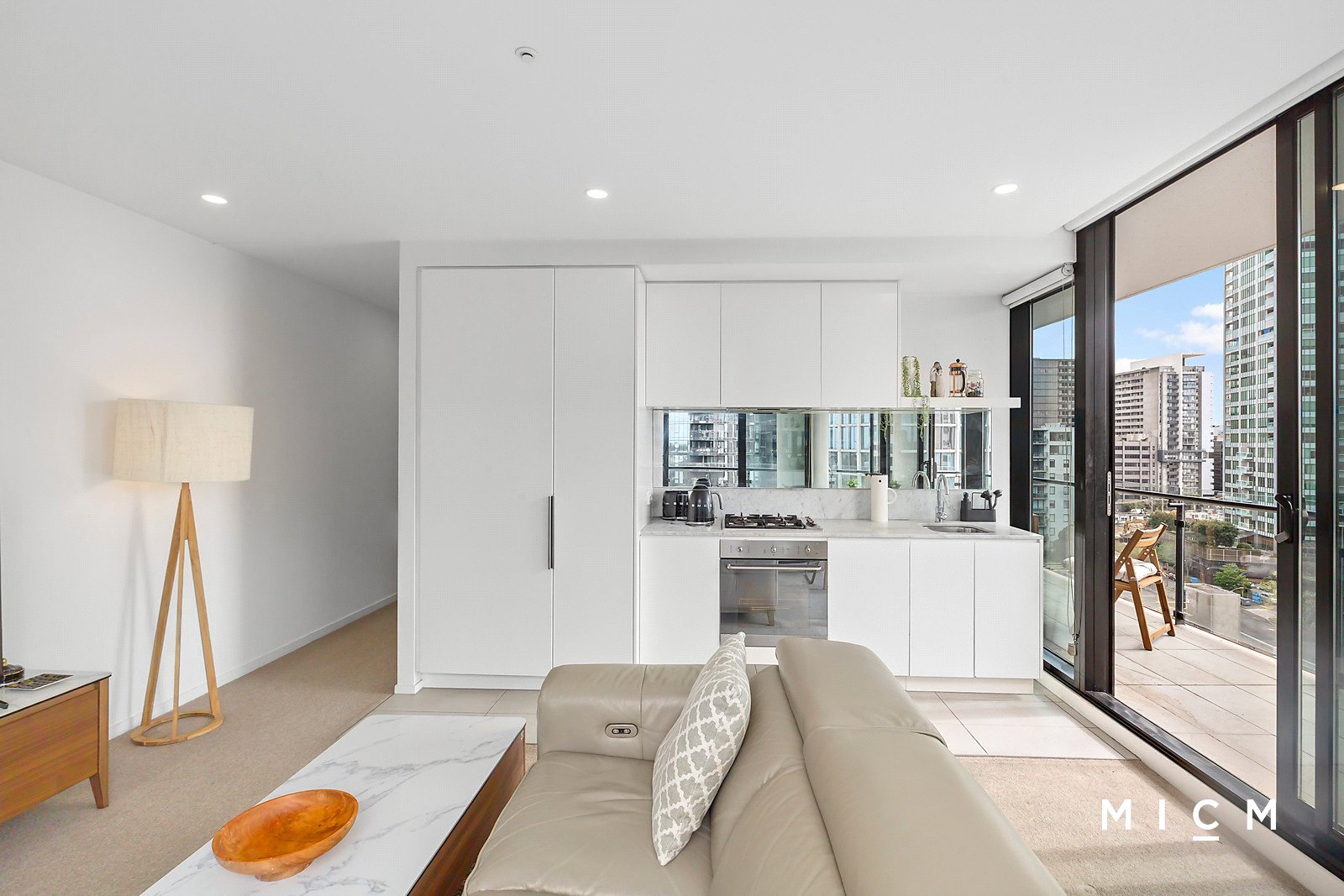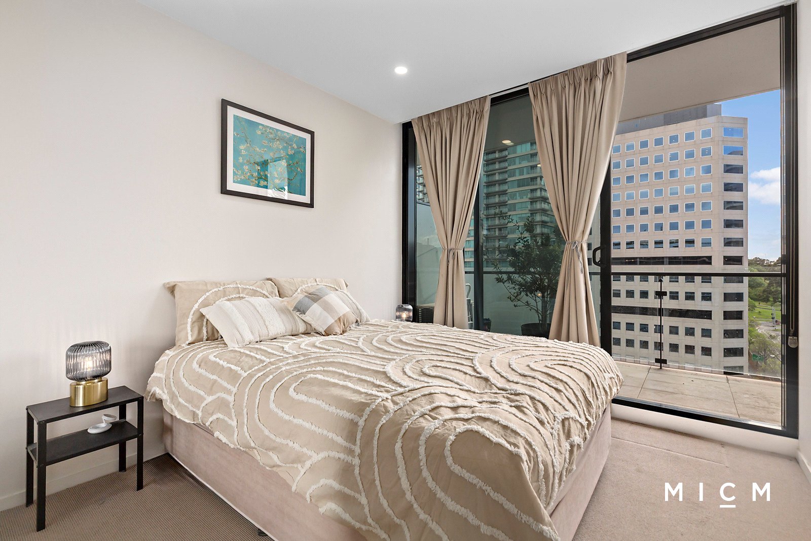 Spacious open-plan living and dining pivots a marble-topped kitchen with soft-closing cabinetry, a mirrored splashback, concealed fridge space, and high-end Smeg appliances including a dishwasher and a 4-burner gas cooktop. Owning a spectacular 11th floor setting inside the exclusive Essence building, floor-to-ceiling glass slides open to a sheltered L-shaped balcony capturing the beauty of Port Phillip Bay and Royal Botanic Gardens greenery in the gentle warmth of eastern sun. Entertaining alfresco will become your default position in this radiant retreat! The large mirror-robed bedrooms both enjoy balcony access, serviced by a deluxe bathroom boasting a walk-in shower, floor-to-ceiling tiles, and marble detailing.
