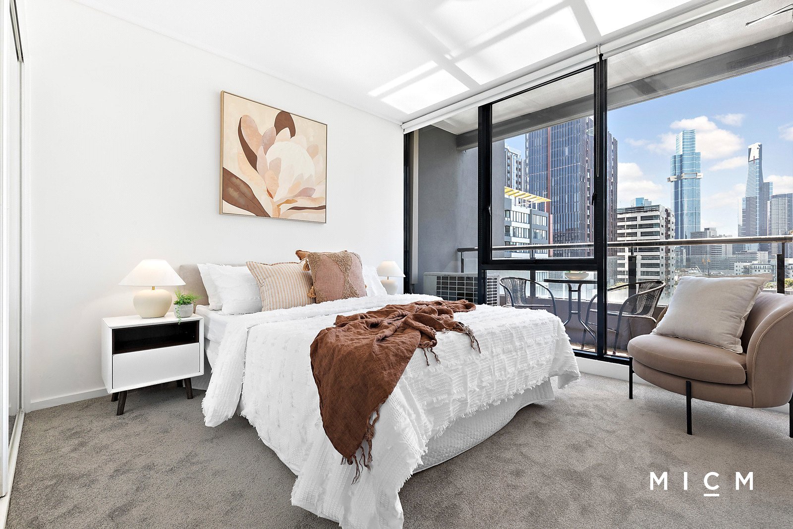 A gleaming kitchen is graced with a breakfast bar and stainless-steel appliances including a dishwasher and a 4-burner gas cooktop. Set on the 8th floor of the popular Parkside complex, wide-reaching open-plan living and dining makes a seamless transition to a sheltered balcony capturing the warmth of northern sun and a commanding Southbank skyline aspect. The generously sized bedroom is framed by floor-to-ceiling glass and serviced by mirrored built-in robes and a fully tiled bathroom with a shower over a bath.