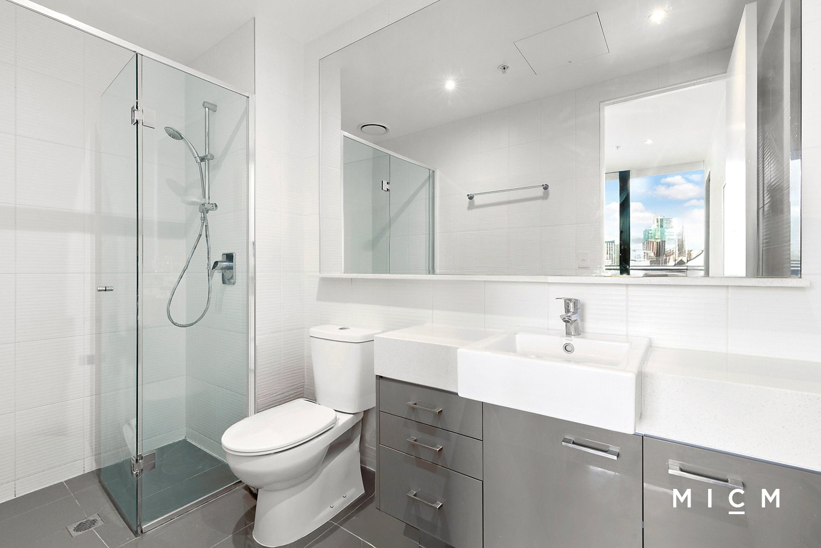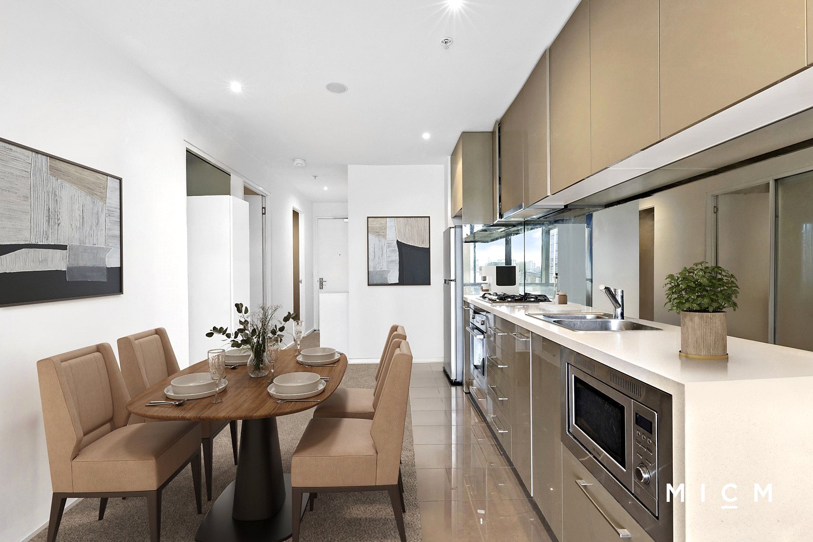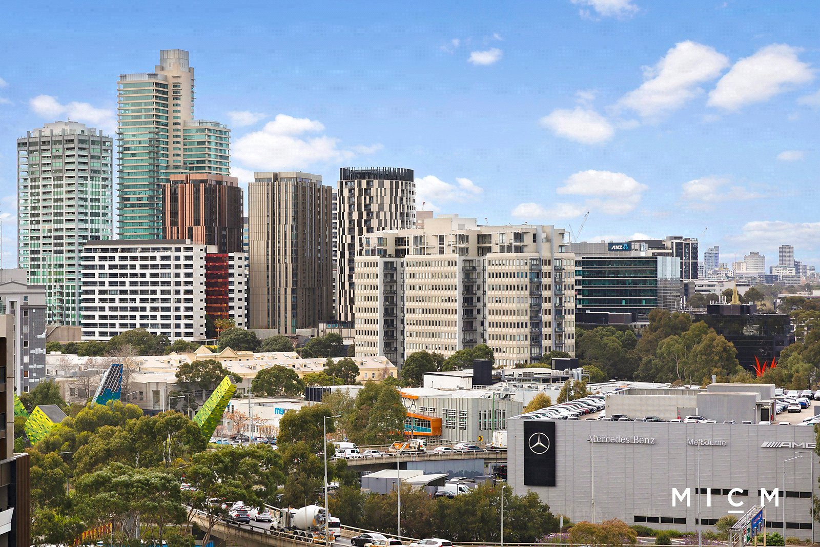 Discover roomy open-plan living and dining, complemented by a stone-finished kitchen with a Fisher and Paykel dish-drawer and stainless-steel appliances including a microwave and a 4-burner gas cooktop. Spill outside to a sheltered east-facing balcony featuring extensive views over the MCG and the neighbourhood skyline, enriched by blue-water glimpses of Port Phillip Bay. This prestigious perch is best enjoyed in the morning with a colourful sunrise lighting up the sky. Both substantially sized bedrooms are serviced by mirrored robes and a pair of fully tiled bathrooms with stone detailing.