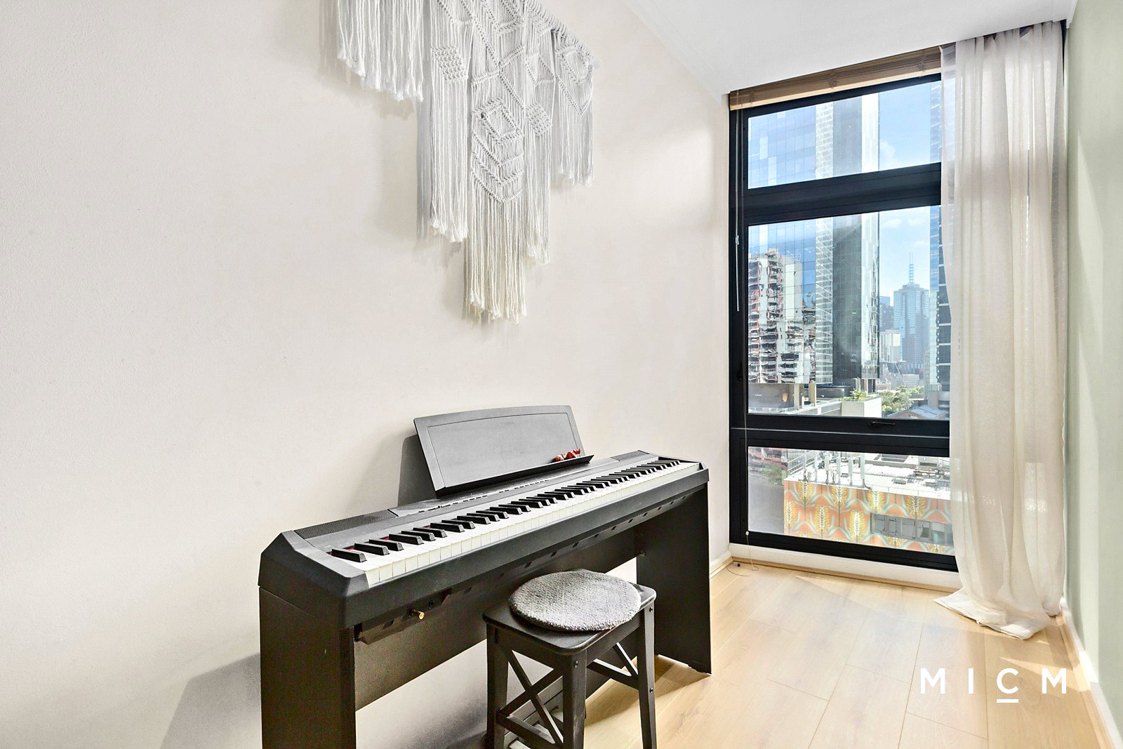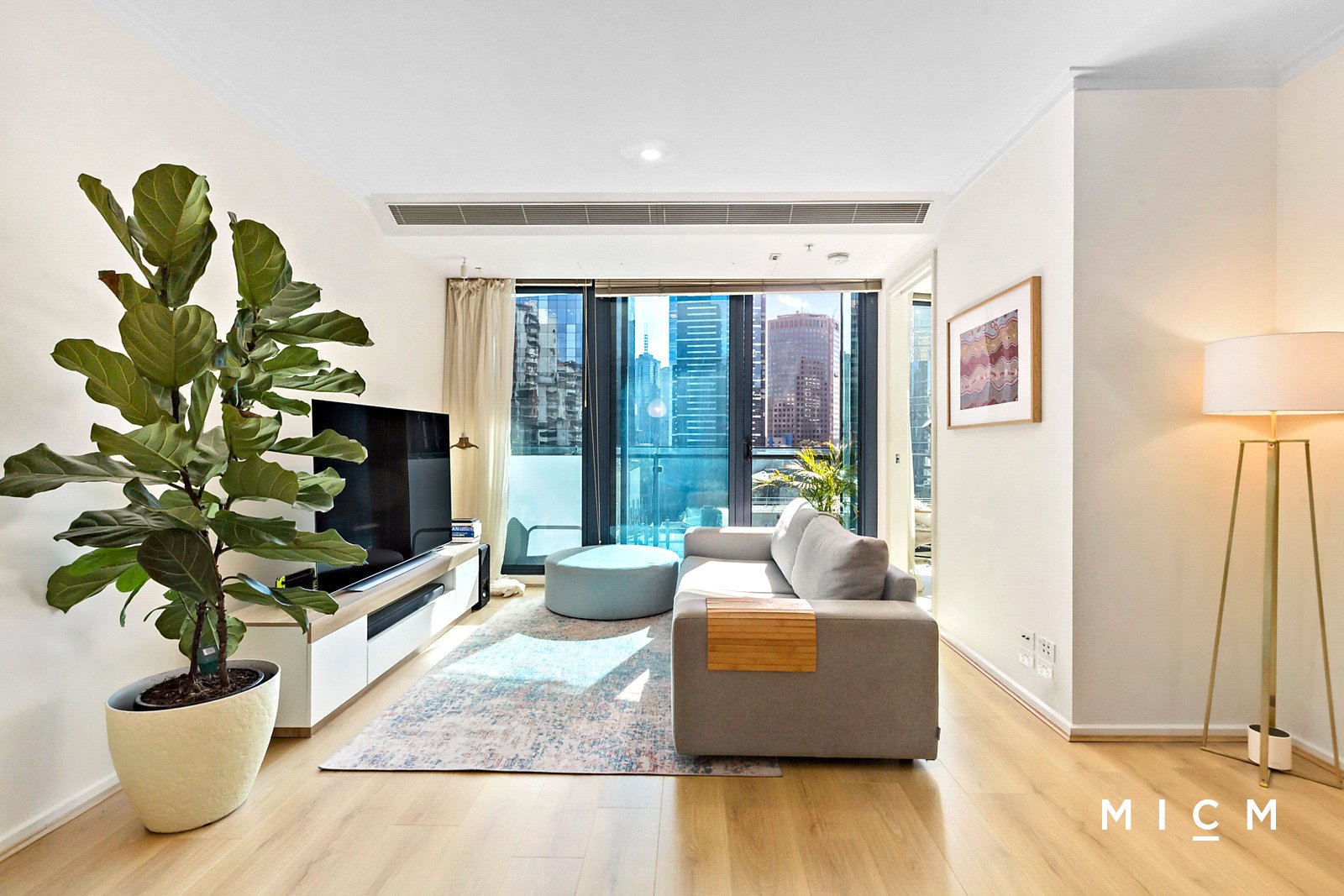 Discover a granite-finished kitchen featuring a waterfall-edged breakfast bar and stainless-steel appliances including a full-sized dishwasher and a 4-burner gas cooktop. Glide across brand-new timber floorboards through wide-reaching open-plan living and dining, underscored by a northeastern orientation attracting the all-day warmth of natural light. Owning an 11th floor setting in the award-winning Southbank One complex, an undercover balcony showcases sweeping views over the neighbouring skyline and a sizeable glimpse of Royal Botanic Gardens greenery. This private perch is ideal for relaxing with an after-work drink. The generously sized bedrooms are filled with light, serviced by mirrored built-in robes and a fully tiled bathroom with upgraded storage capacity. In addition, the master suite boasts a sunlit study zone, while a separate powder room is perfect for entertaining.