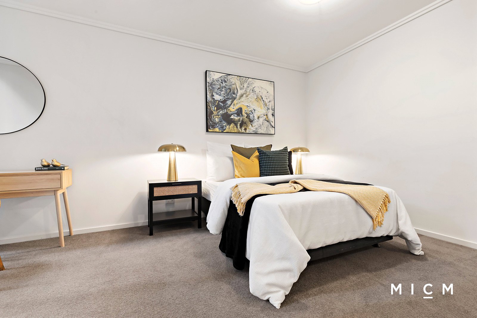 Enjoy a genuine feeling of space from the first step inside as natural light streams through floor-to-ceiling glass. Discover the wide-reaching and air-conditioned comfort of open-plan living and dining, complemented by a granite-finished kitchen boasting a breakfast bar and stainless-steel appliances including a 4-burner gas cooktop and an updated oven. Always free-flowing on the 11th floor, take full advantage of a sheltered balcony with spectacular views across the skyline and sizeable blue-water glimpses of Port Phillip Bay on the horizon. Both large bedrooms are filled with light, serviced by mirrored built-in robes and a fully tiled bathroom with marble detailing.