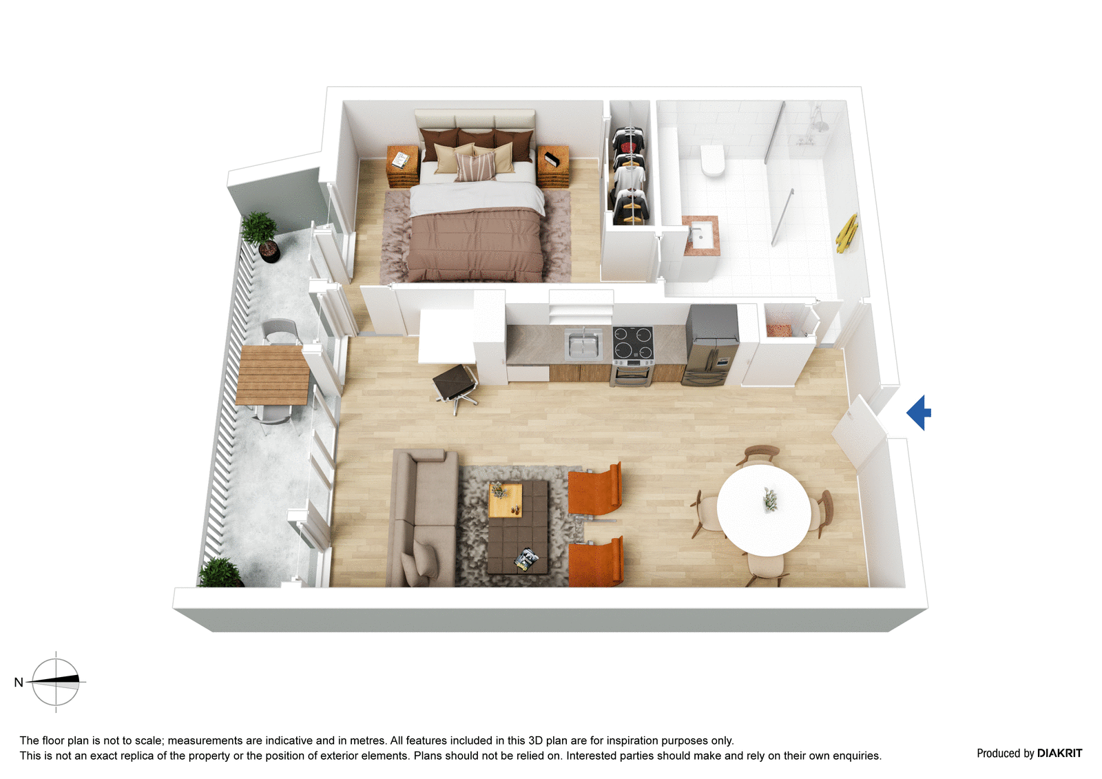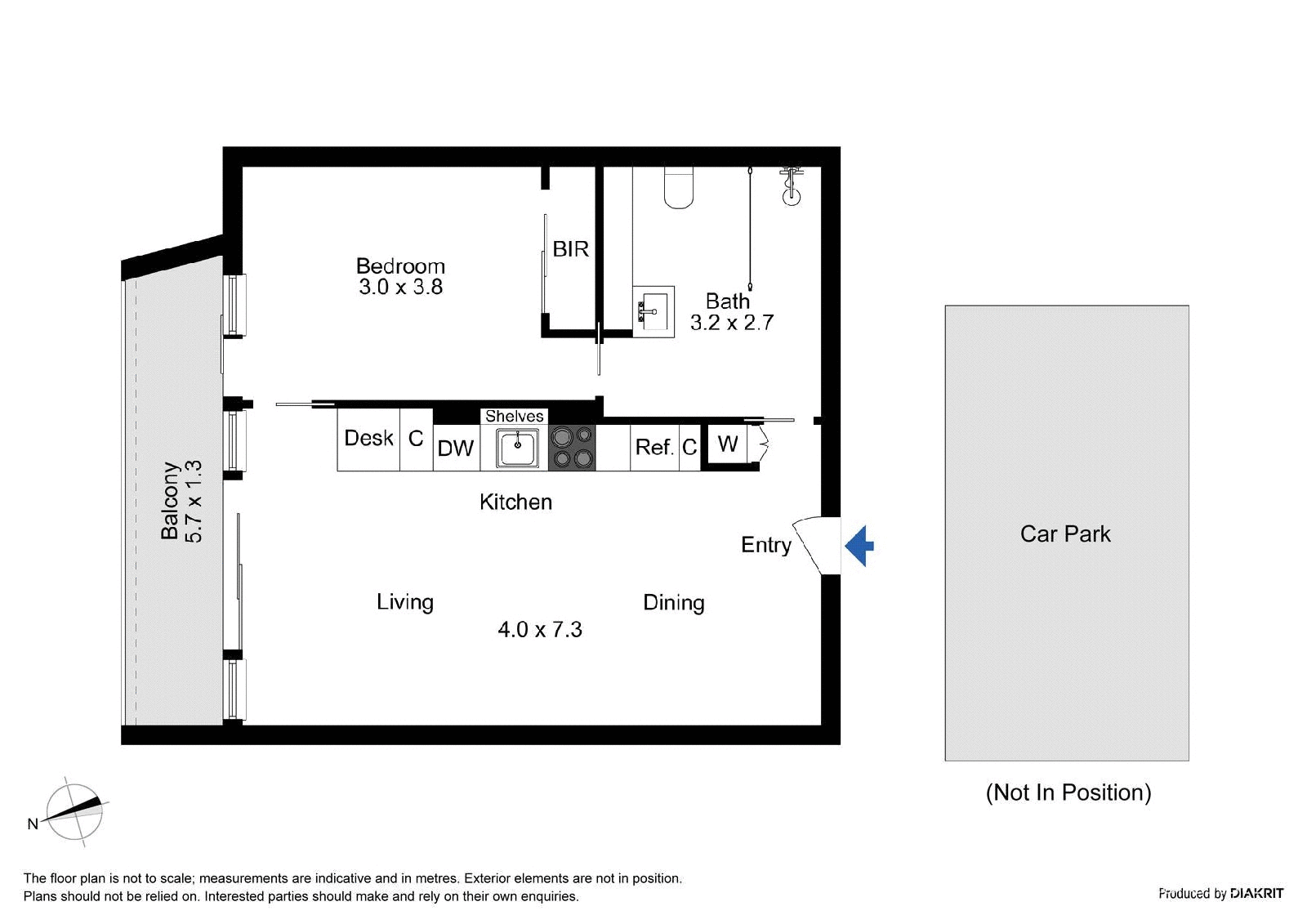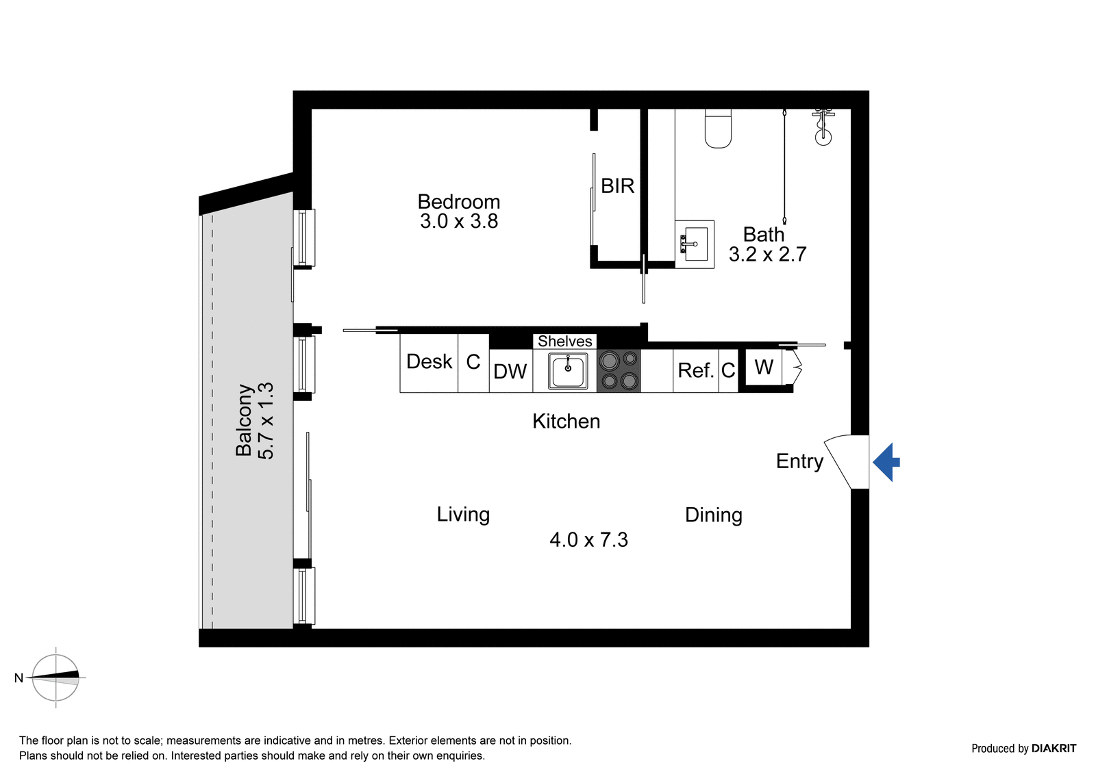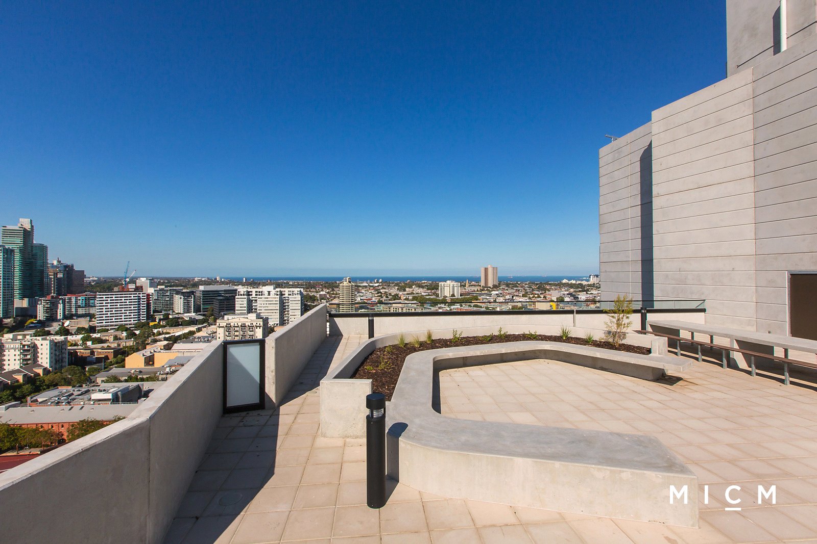 Spacious open-plan living and dining makes way for a stone-finished kitchen showcasing a pull-out pantry, glossy splashback and stainless-steel appliances including an integrated dishwasher. Framed by walls of full-height glass, step outside in to the northern light from both the living space and the bedroom onto a vast undercover balcony with sweeping views towards the city skyline with the soaring Australia 108, Eureka Tower and the Arts Centre spire featuring prominently. Sharing this breathtaking aspect, an extensively robed bedroom is generously sized and naturally lit, superbly serviced by a fully tiled bathroom with dual access, a frameless shower and mirrored cabinetry.
