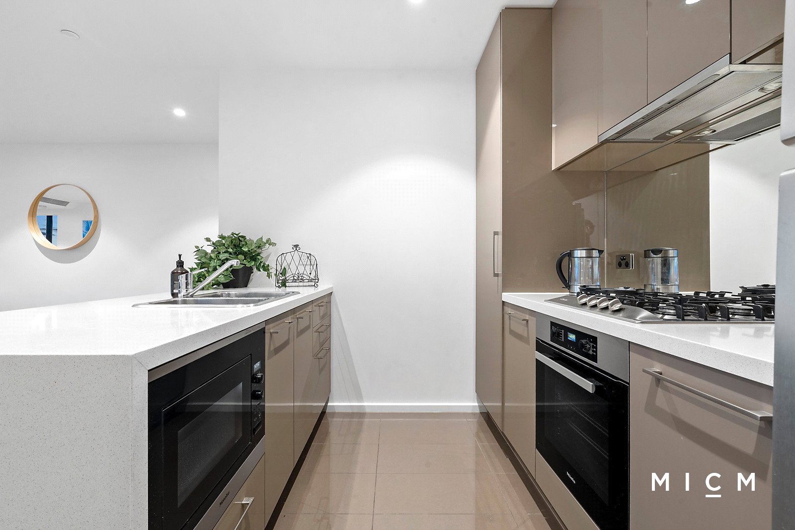 An exquisite kitchen showcases smooth stone surfaces, a waterfall-edged breakfast bar, a Fisher and Paykel dish-drawer, and state-of-the-art Miele appliances including an integrated microwave and a 4-burner gas cooktop. This whole workspace will be a centrepiece for entertaining. Stretching out on the 12th floor of the luxury-led Southbank Place complex, far-reaching open-plan living and dining flows to a sheltered balcony highlighting commanding views over the MCG and Royal Botanic Gardens greenery towards the mountainous horizon. Capturing morning sunlight with ease, this peaceful perch is ideal for a morning coffee or a lazy weekend breakfast.