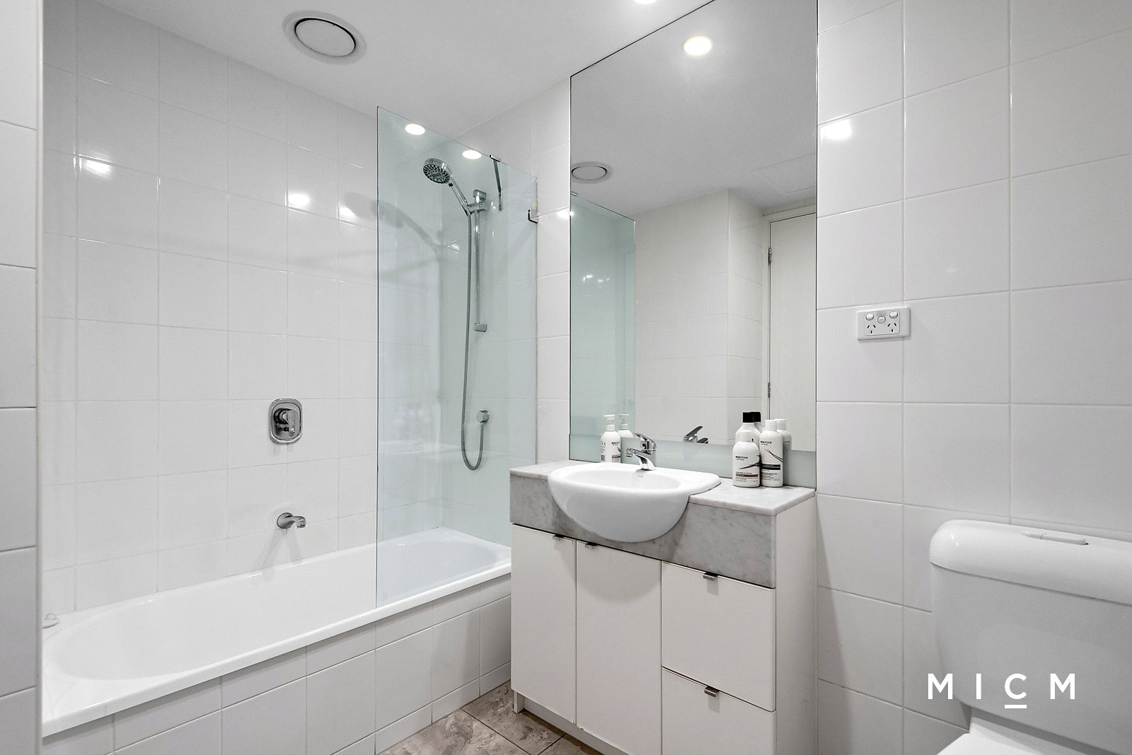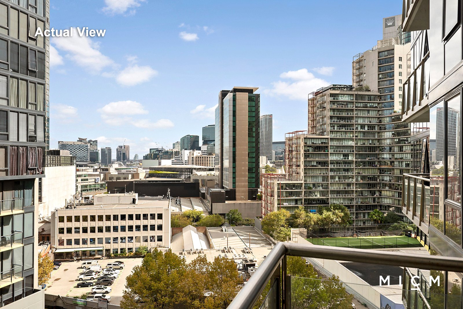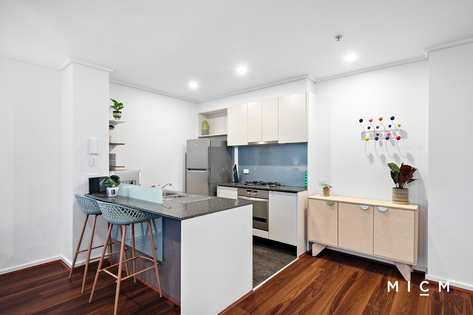 A well-planned layout totalling an impressive 91sqm (approx.) reveals spacious open-plan living and dining underscored by a granite-topped kitchen with a breakfast bar, 4-burner gas cooktop, and a full-sized dishwasher. Floor-to-ceiling glass slides open to a sheltered balcony capturing a soaring skyline backdrop extending across the neighbourhood. Both generously scaled bedrooms feature mirrored built-in robes, serviced by fully tiled bathrooms with marble detailing, while the primary one boasts a bathtub.