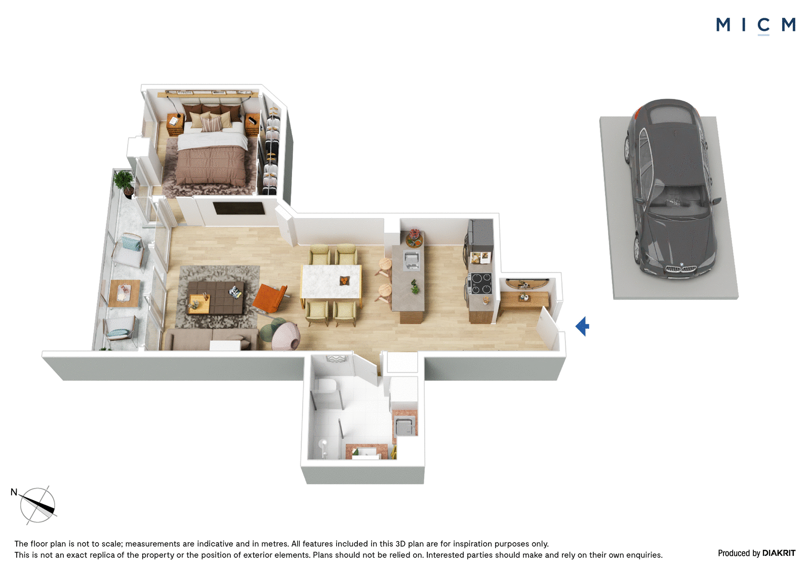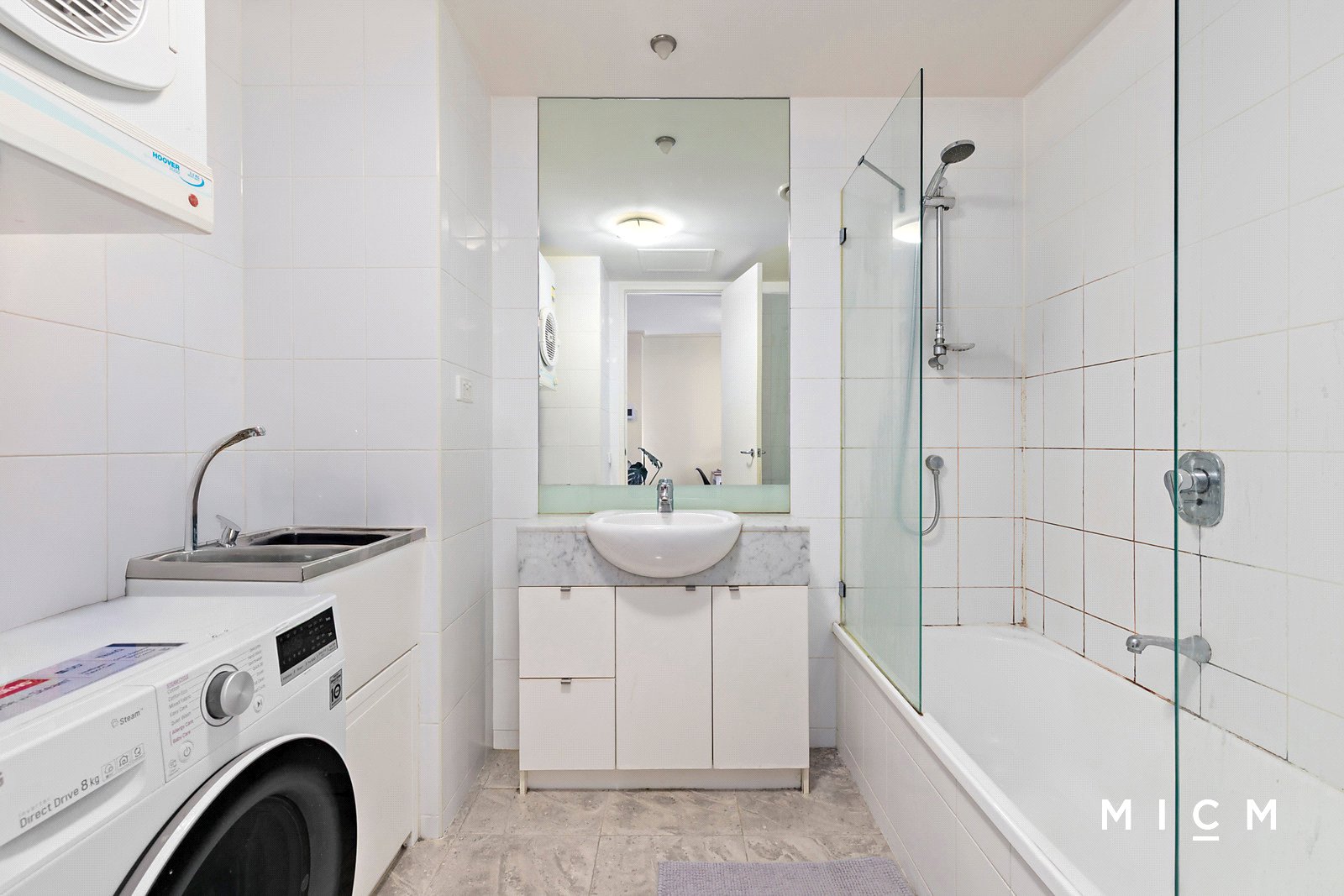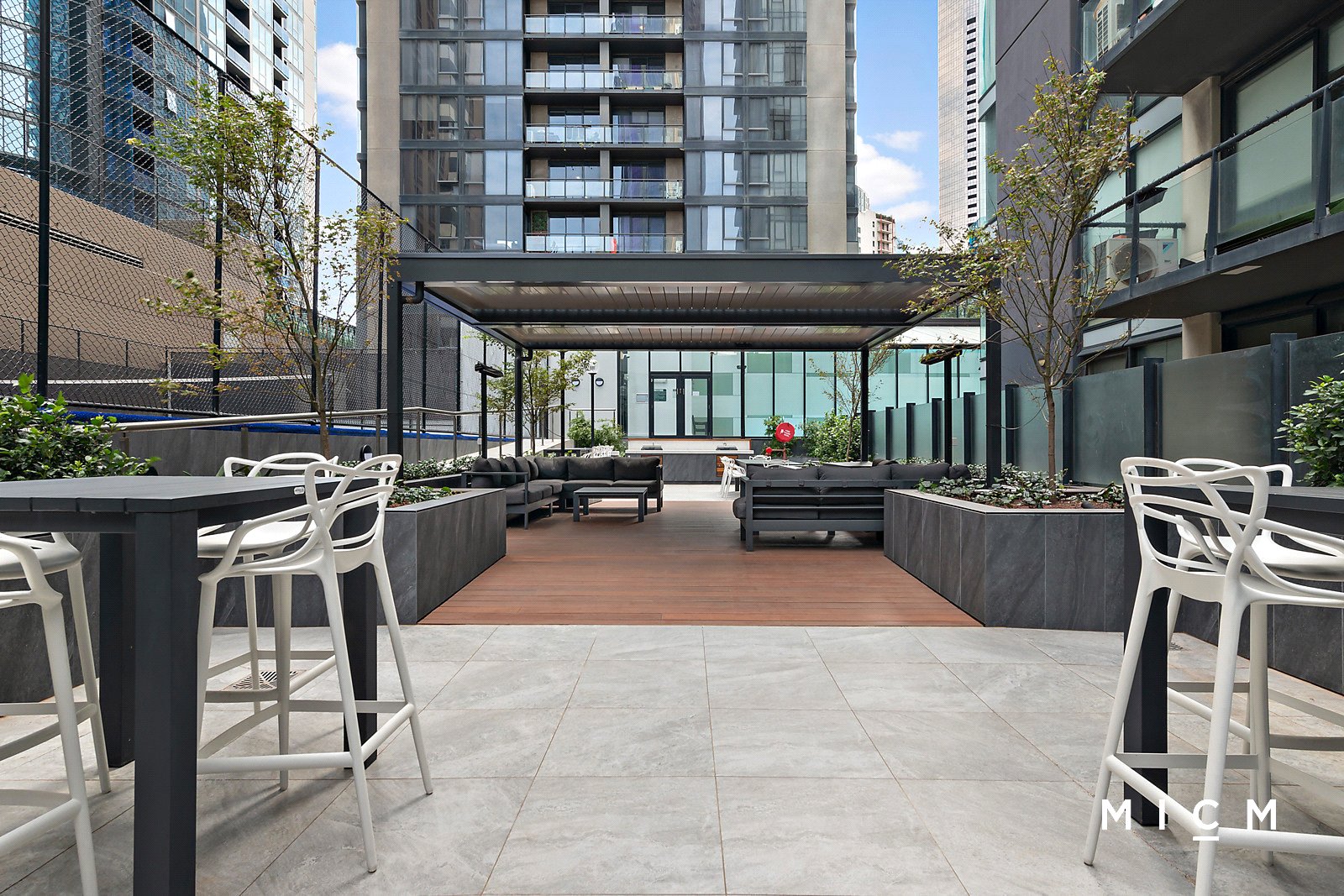 A deluxe kitchen boasts a breakfast bar finished in sleek black granite and premium appliances including a 4-burner gas cooktop. Wide-reaching open-plan living and dining connects with a sheltered north-facing balcony highlighting the surrounding skyline in style. The same view is shared in the generously sized bedroom through floor-to-ceiling glass, superbly serviced by mirrored built-in robes and a central bathroom with full-height tiles, a marble-topped vanity, and a shower over a bathtub.