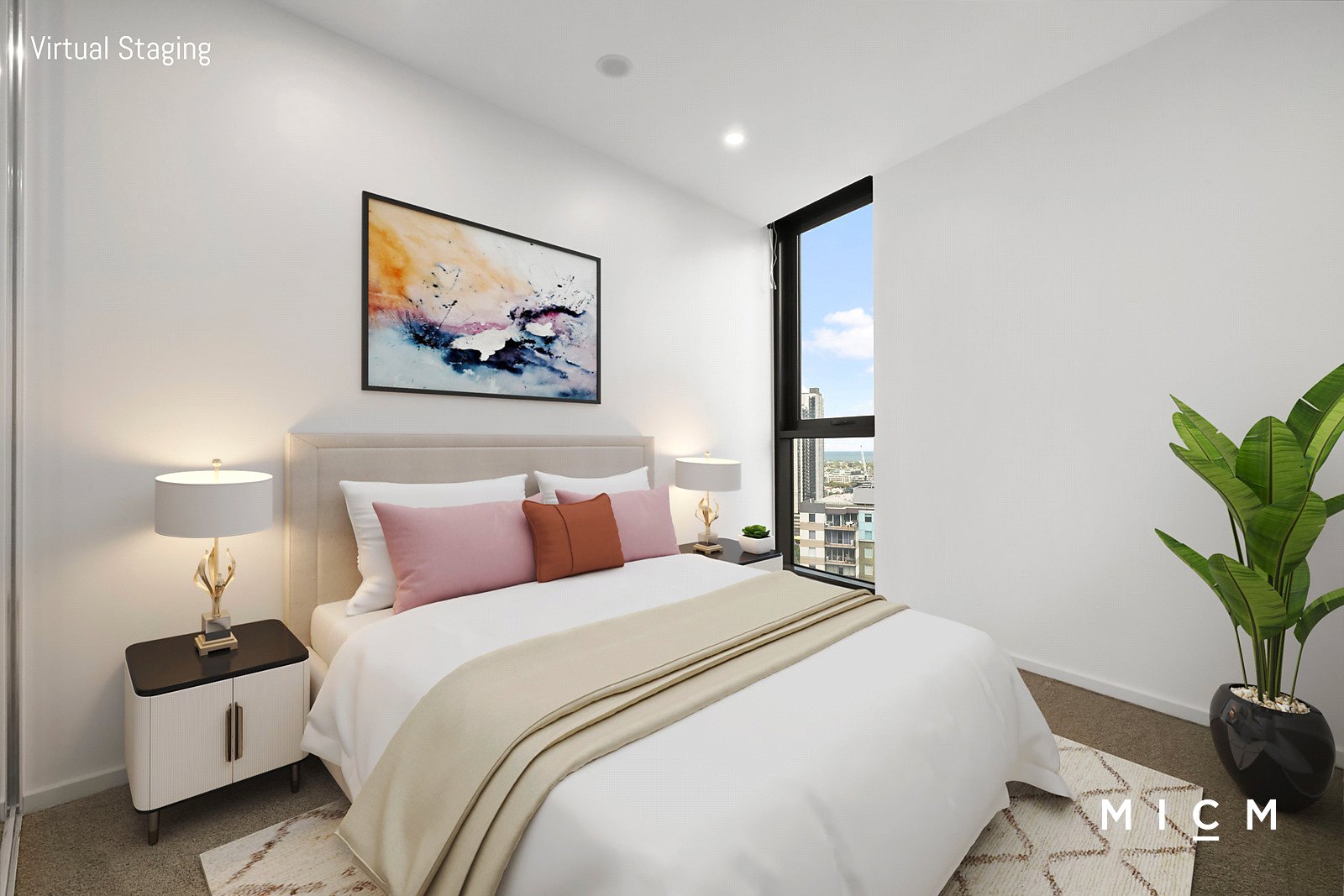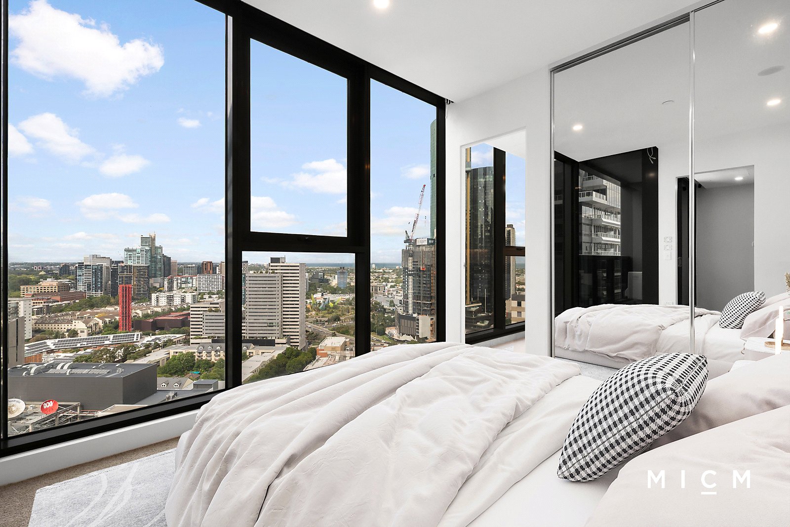 Under towering 2.7m high ceilings on the 24th floor of the stylish Focus building, discover roomy open-plan living and dining, complemented by a stone-topped kitchen showcasing soft-closing cabinetry. Step outside to a sheltered balcony highlighting skyline vistas towards the blue-water beauty of Port Phillip Bay. The sizeable and sunlit bedrooms are newly carpeted, sensationally serviced by mirrored built-in robes and a pristine pair of fully tiled bathrooms.
