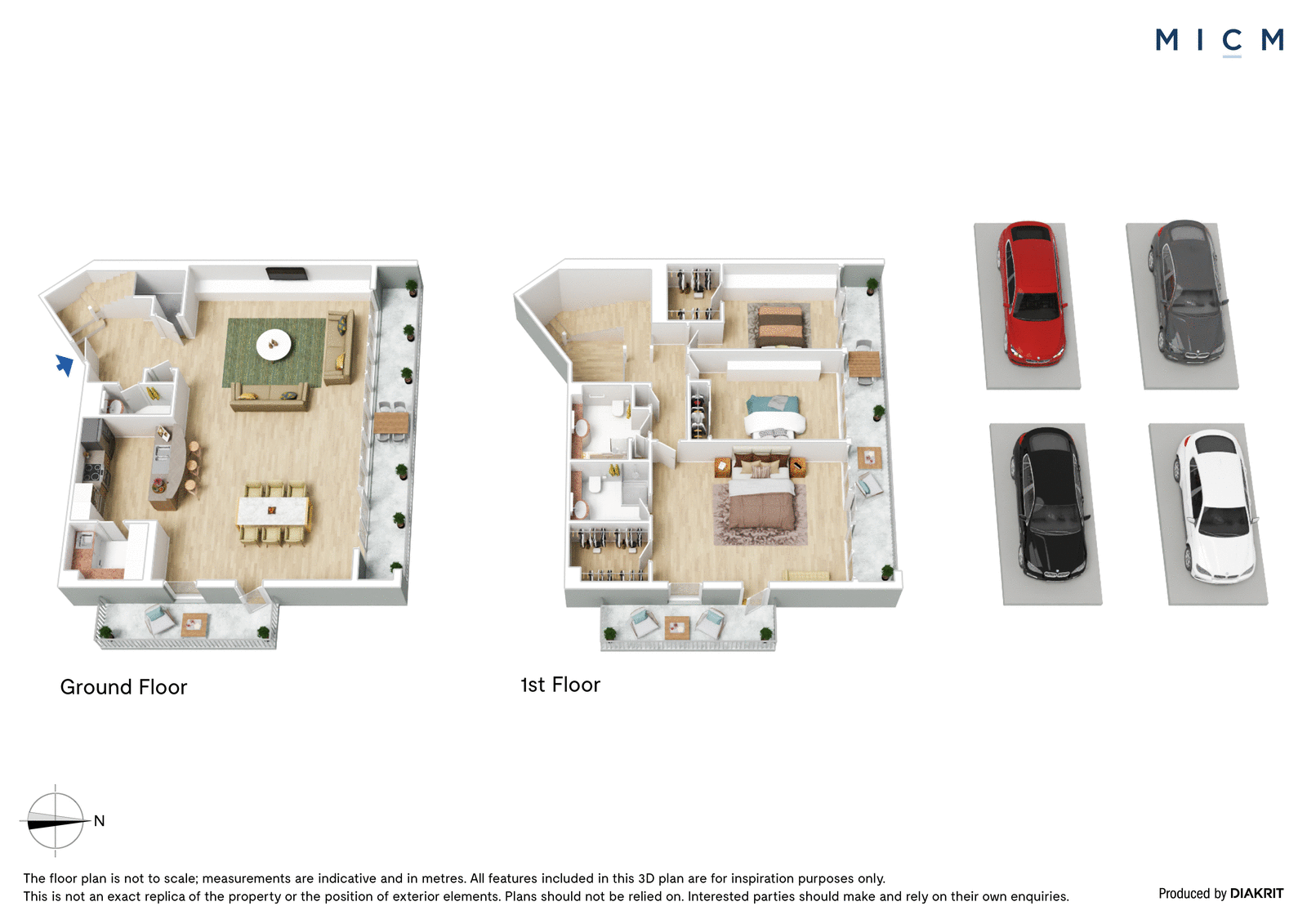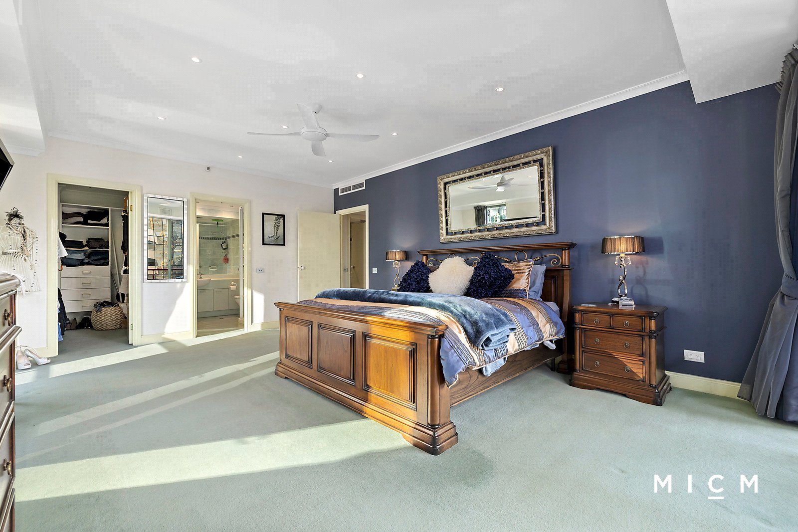 The same spectacular balcony views are on display upstairs, placed alongside a light-filled trio of bedrooms, all generously sized and extensively robed. The corner-sited main bedroom features walk-in robes, dual balcony access, and a pristine fully tiled ensuite. One of the bedrooms also enjoys walk-in robes and access to the north-facing balcony, while the family-sized bathroom is graced with full-height tiles, a wall-to-wall mirror, and a rainfall shower over a luxurious bathtub.