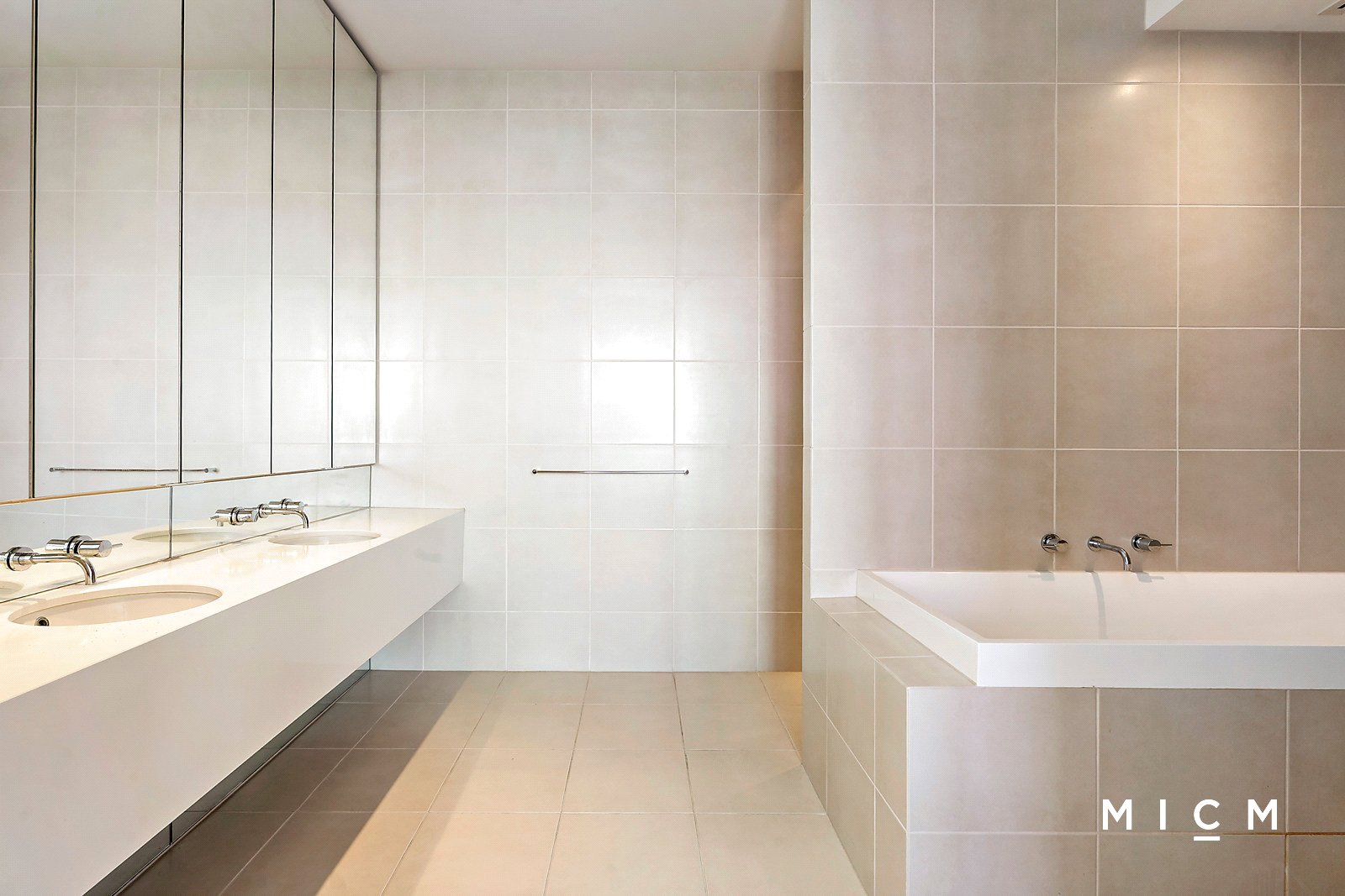 Both generously sized and robed bedrooms are naturally lit, serviced by a dual-access principal bathroom with full-height tiles. The main bedroom highlights a twin-vanity ensuite featuring a soothing bathtub, concealed cistern, mirrored cabinetry, and floor-to-ceiling tiling throughout.