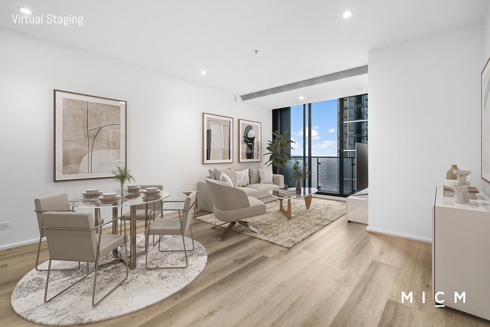 Placed to perfection on the 28th floor of award-winning Southbank Grand, spacious open-plan living and dining pivots a stone-topped kitchen featuring a breakfast bar and premium appliances including an integrated microwave, 4-burner gas cooktop, and a Fisher and Paykel dish-drawer. Glide across sleek floorboards and enjoy a seamless connection with a private sheltered balcony showcasing a breathtaking aspect extending across the best of Melbourne including Royal Botanic Gardens greenery and all the stadiums of the sporting precinct. This private perch is ideal for a morning coffee in the gentle warmth of morning sunlight. Both mirror-robed bedrooms are generously sized and filled with light, while a fully tiled principal bathroom is graced with laundry capacity and stone detailing. Additionally, the wide-reaching master suite is enriched by a work-ready study nook and a luxe ensuite.