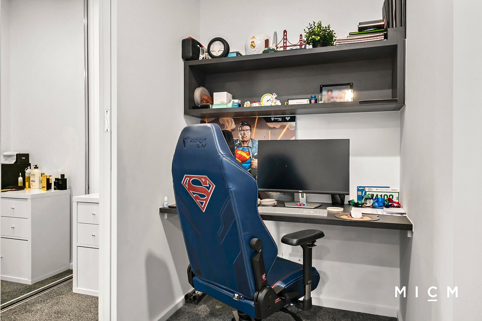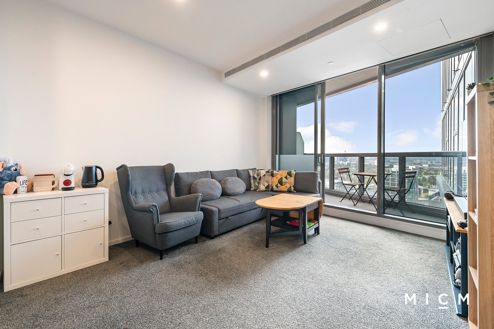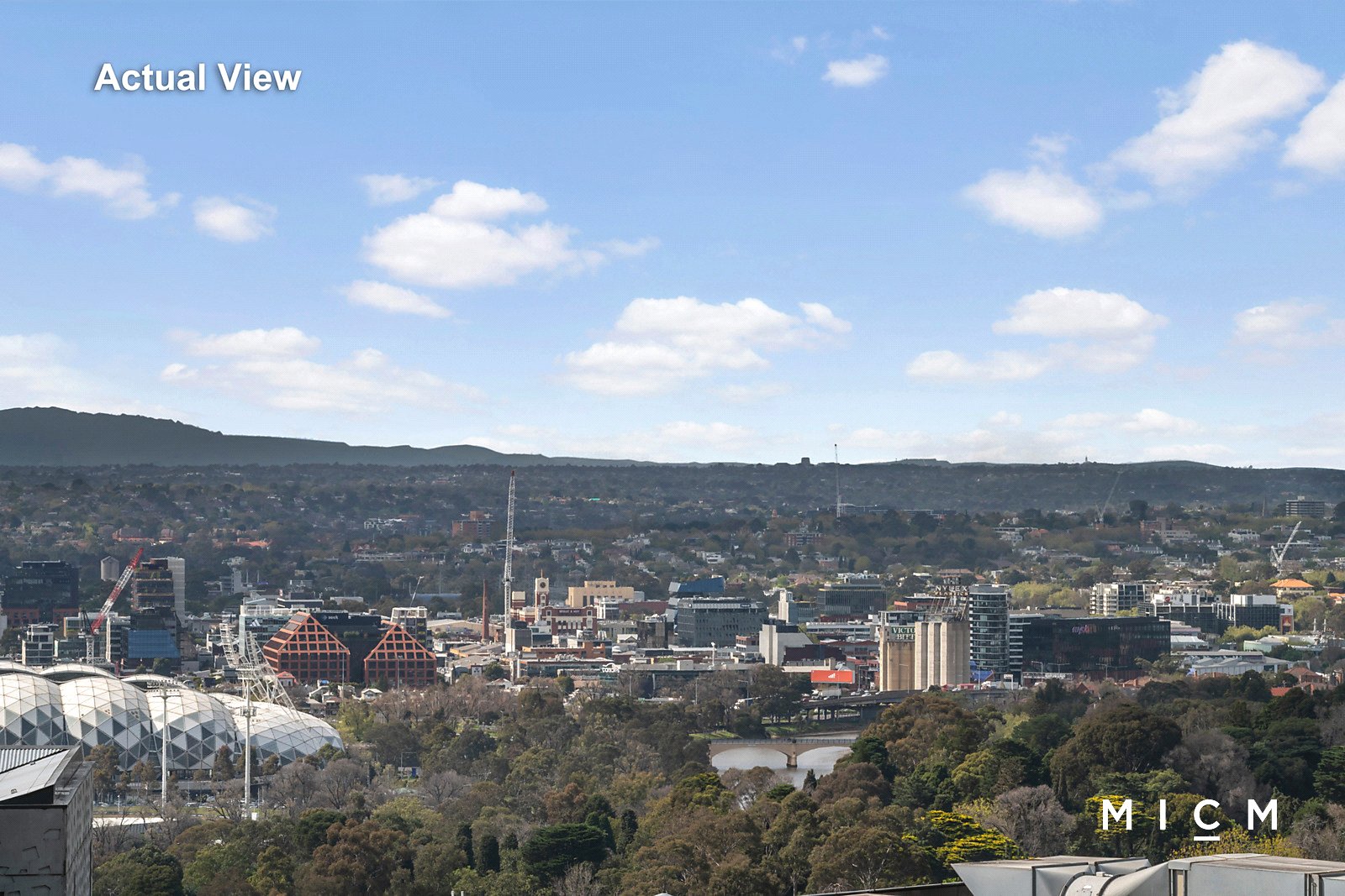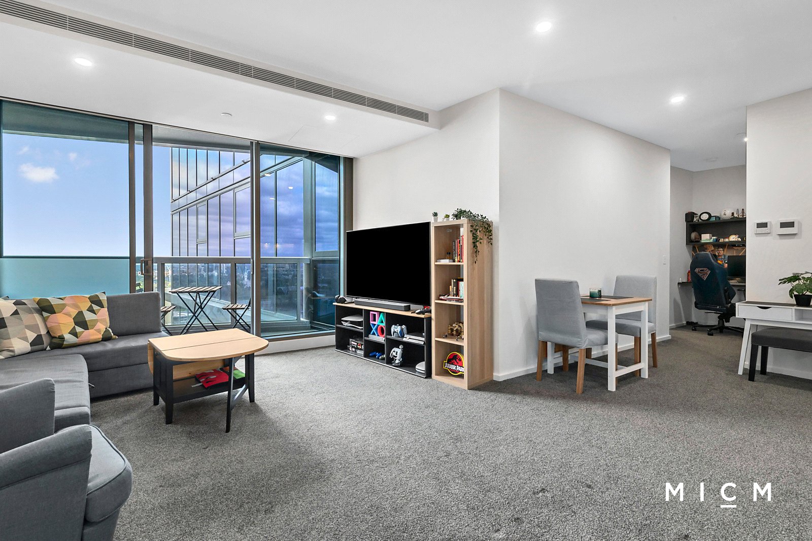 Under towering 2.7m high ceilings, spacious open-plan living and dining is hemmed by floor-to-ceiling glass and underscored by a stone-finished kitchen showcasing soft-closing cabinetry, a Fisher and Paykel dish-drawer, and top-of-the-range Miele appliances including an integrated microwave. The handy study area comes complete with a sleek workstation boasting storage capability. Seamless flow will lead you to a sheltered balcony with picturesque parkland views towards the Dandenong Ranges. Set to inspire on the 32nd floor of the luxury-led Focus complex, the generously sized bedroom is filled with light, serviced by mirrored built-in robes and a fully tiled bathroom graced with mirrored cabinetry and a concealed cistern.
