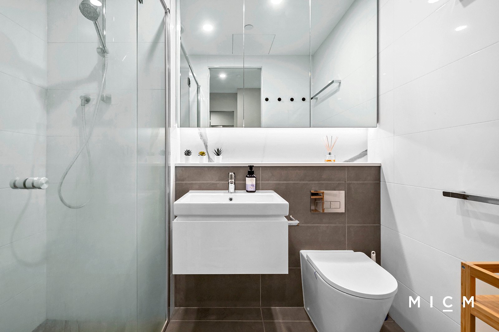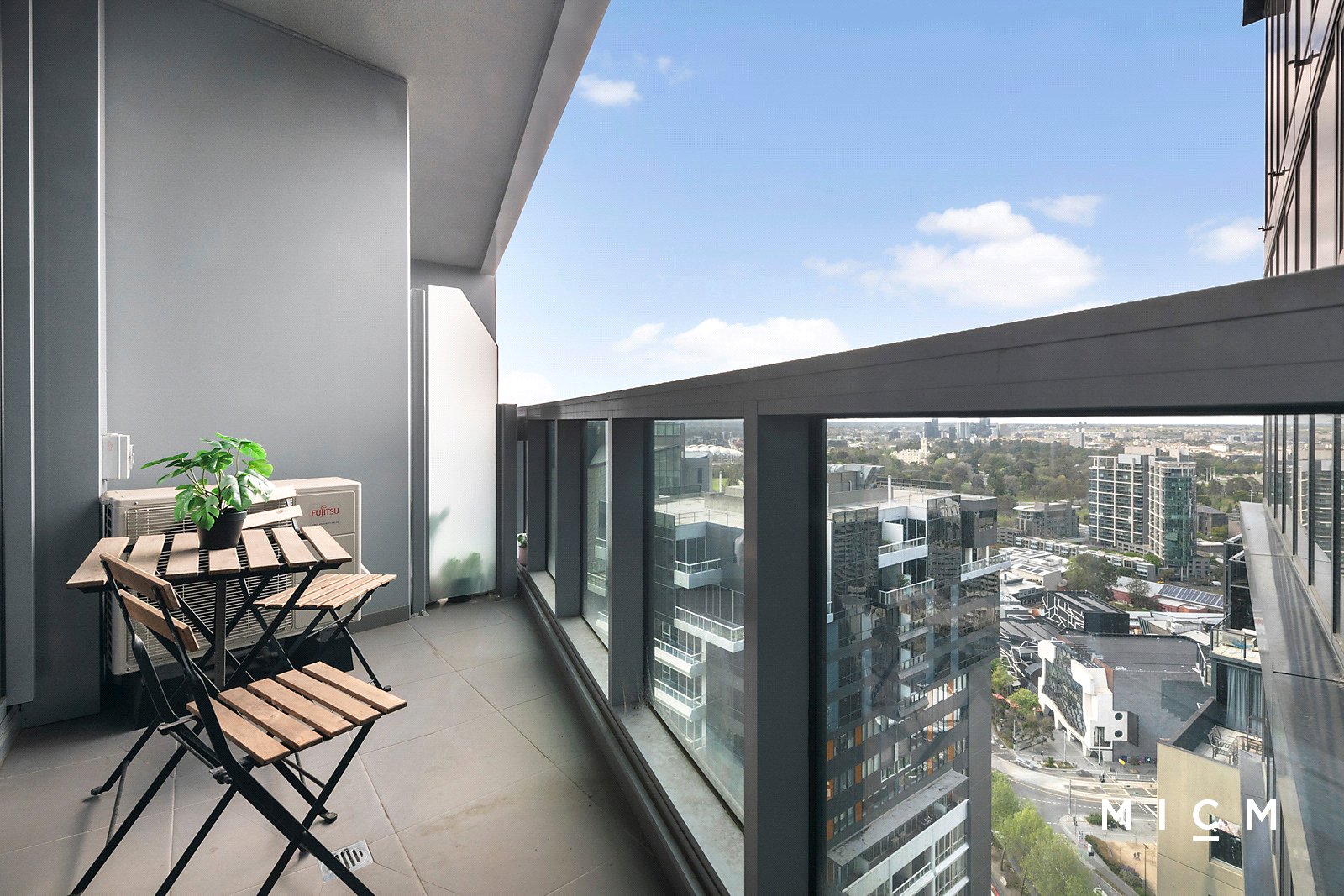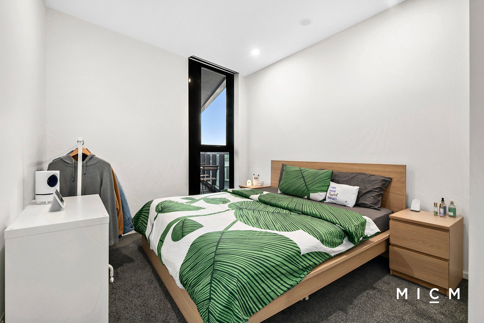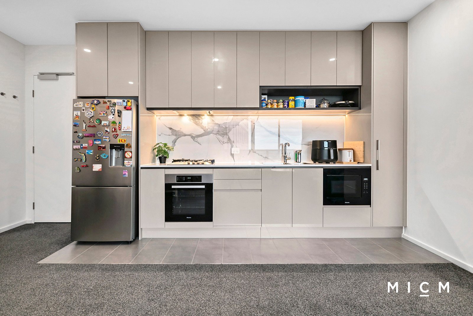 Under towering 2.7m high ceilings, spacious open-plan living and dining is hemmed by floor-to-ceiling glass and underscored by a stone-finished kitchen showcasing soft-closing cabinetry, a Fisher and Paykel dish-drawer, and top-of-the-range Miele appliances including an integrated microwave. The handy study area comes complete with a sleek workstation boasting storage capability. Seamless flow will lead you to a sheltered balcony with picturesque parkland views towards the Dandenong Ranges. Set to inspire on the 32nd floor of the luxury-led Focus complex, the generously sized bedroom is filled with light, serviced by mirrored built-in robes and a fully tiled bathroom graced with mirrored cabinetry and a concealed cistern.