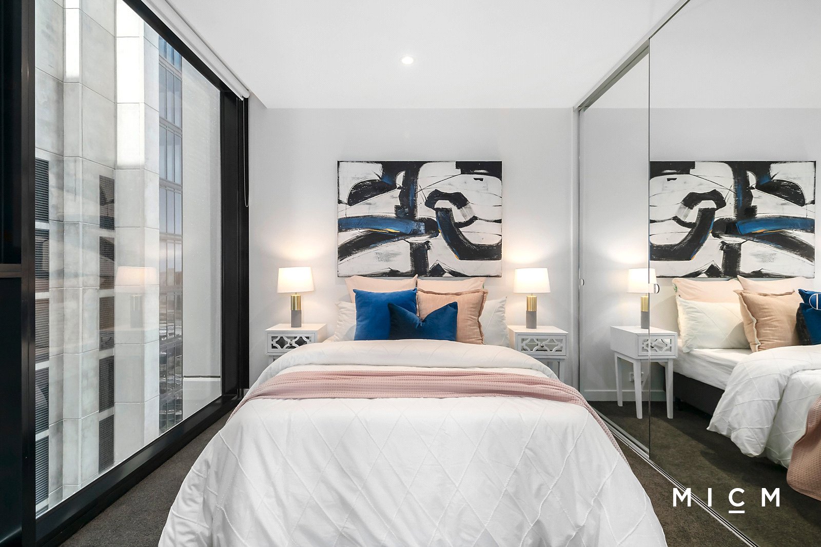 The open-plan layout enjoys more than enough space for light-filled living/dining and a study zone, if required. A stone-topped kitchen is driven by quality, graced with soft-closing cabinetry, a mirrored splashback, Miele oven/cooktop, an integrated Ilve microwave, and a full-sized Bosch dishwasher. Positioned to perfection on the 33rd floor of the resort-inspired Palladium Tower complex, step outside to an undercover balcony attracting northern light, ideal for a morning coffee or unwinding with a drink after work. Both spacious and sunlit bedrooms are serviced by mirrored built-in robes and a pair of sleek bathrooms with rainfall shower fittings, floor-to-ceiling tiles and ample storage.