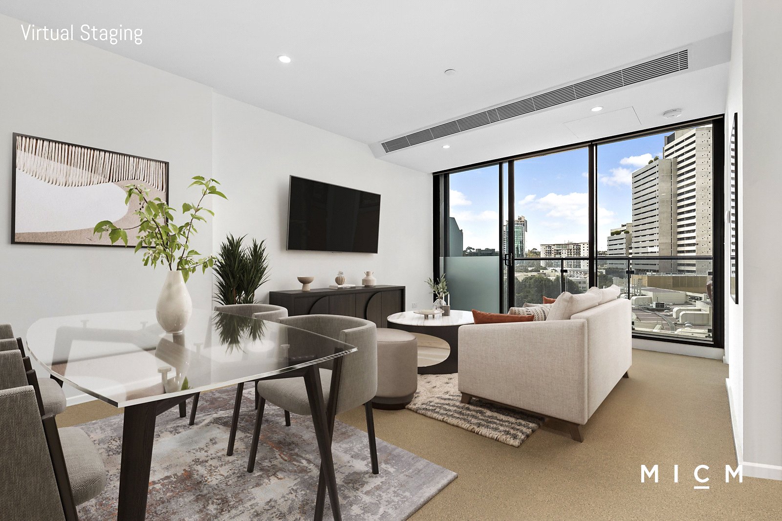 Spacious open-plan living and dining is underscored by a stone-finished kitchen highlighting a mirrored splashback, a Fisher and Paykel dish-drawer, and premium Miele appliances including an integrated microwave and a 4-burner gas cooktop. Elevated on the 6th level of the sought-after Southbank Place building, step outside to a sheltered balcony capturing gentle eastern sun and sweeping views of the MCG light towers. The generously sized bedrooms are naturally lit, serviced by mirrored built-in robes and a perfect pair of fully tiled bathrooms with stone-topped vanities. One of the bedrooms enjoys a sunlit study nook, while the living space plays host to another study area with a built-in desk. Working from home will be a breeze!