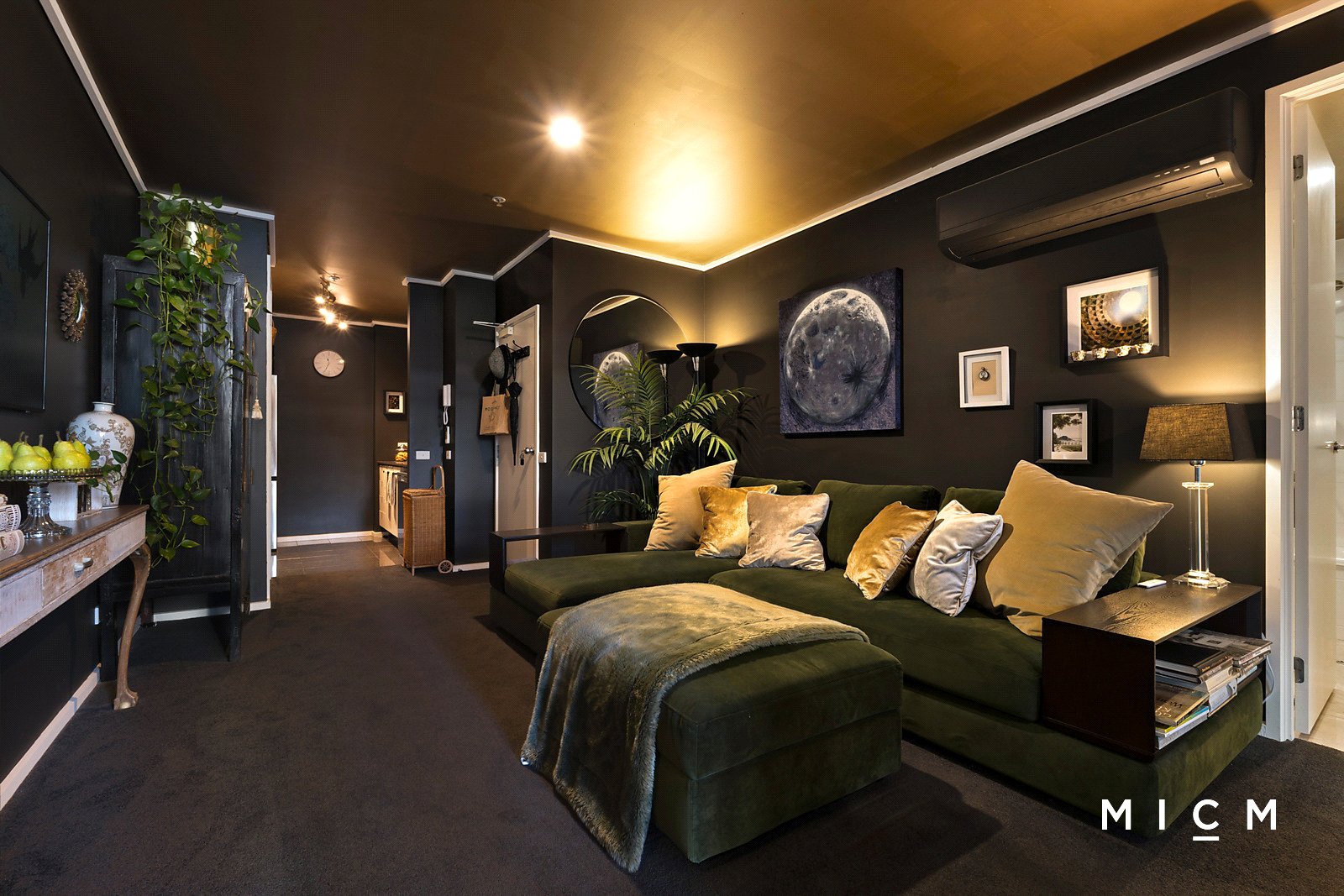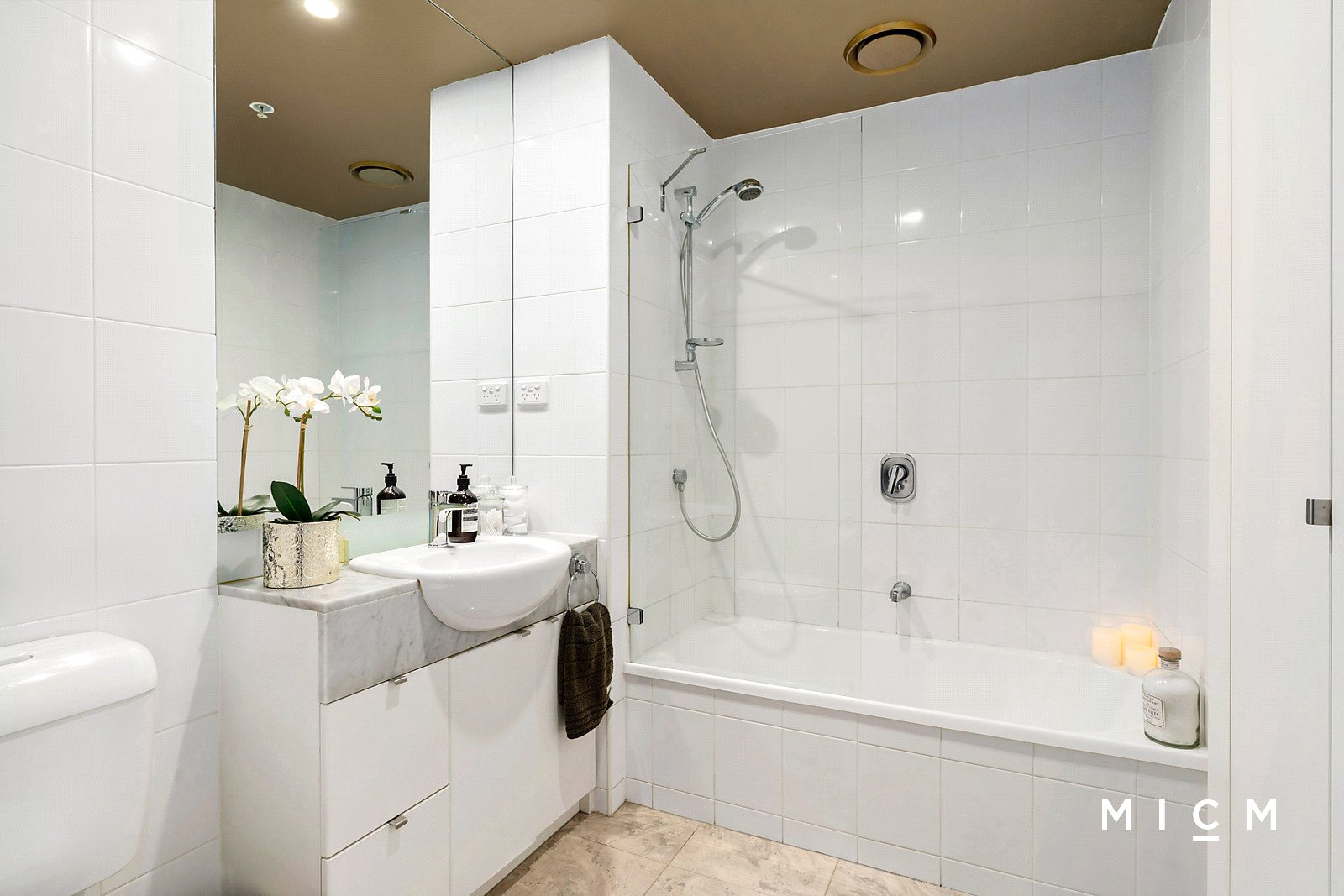The large and bright bedroom is serviced by mirrored built-in robes and a fully tiled bathroom with a shower over a bathtub and a luxe marble-topped vanity. Take advantage of a large Euro-style laundry with storage capacity, split-system heating and cooling, sleek feature walls, designer lighting, and day/night curtains.