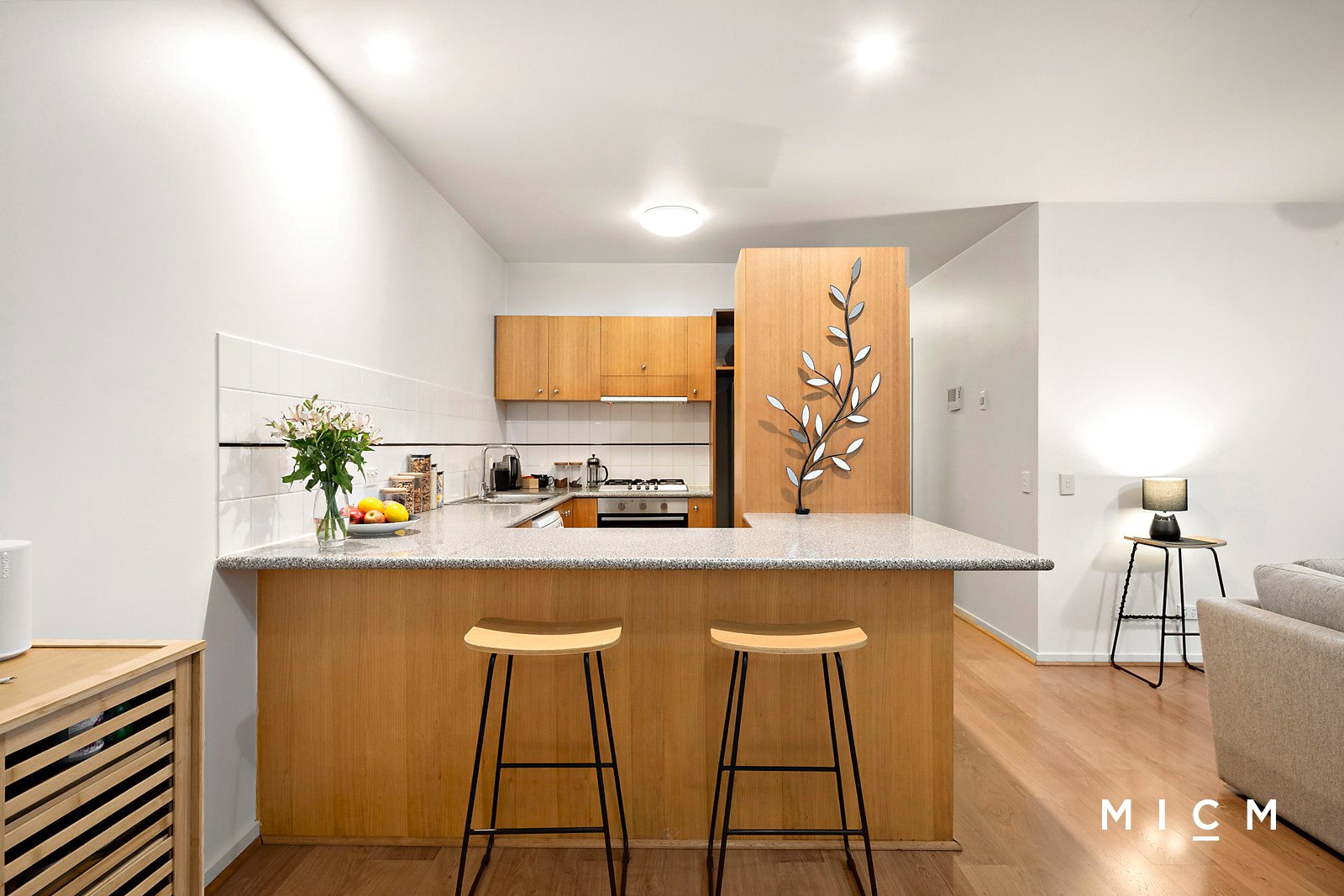 The air-conditioned comfort of wide-reaching open-plan living and dining is underscored by a chef-friendly kitchen graced with a breakfast bar, a premium Bosch dishwasher, and a 4-burner Smeg gas cooktop. Perched on the second floor, step outside and enjoy surrounding skyline views from a sheltered balcony, ideal for weekend breakfasts. The living area is also fitted with secondary glazing with double glass doors, ensuring the internal space remains quiet.