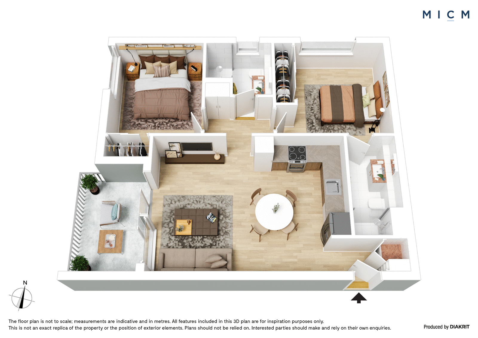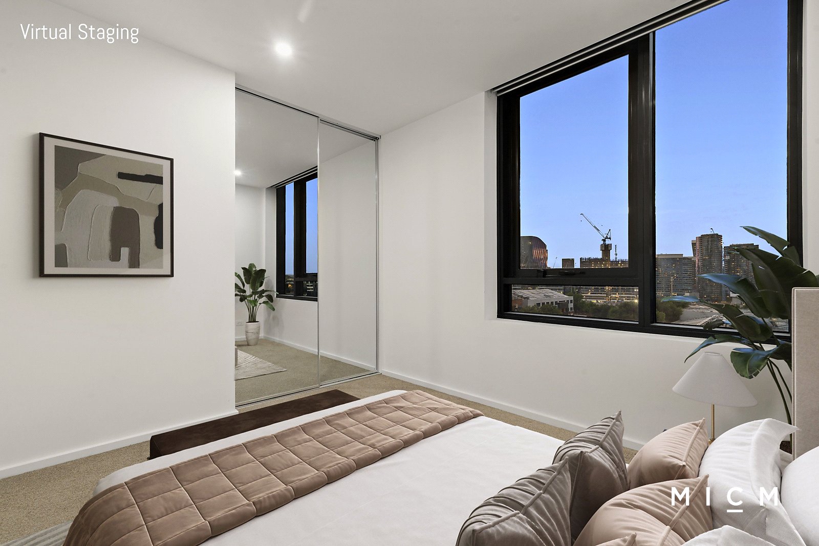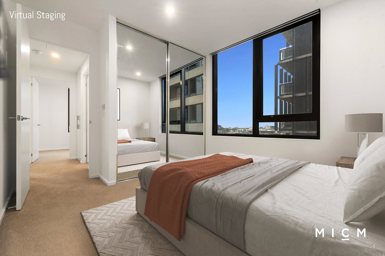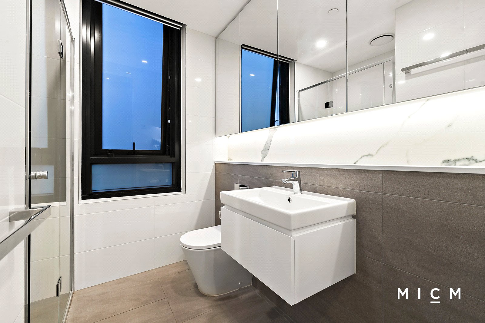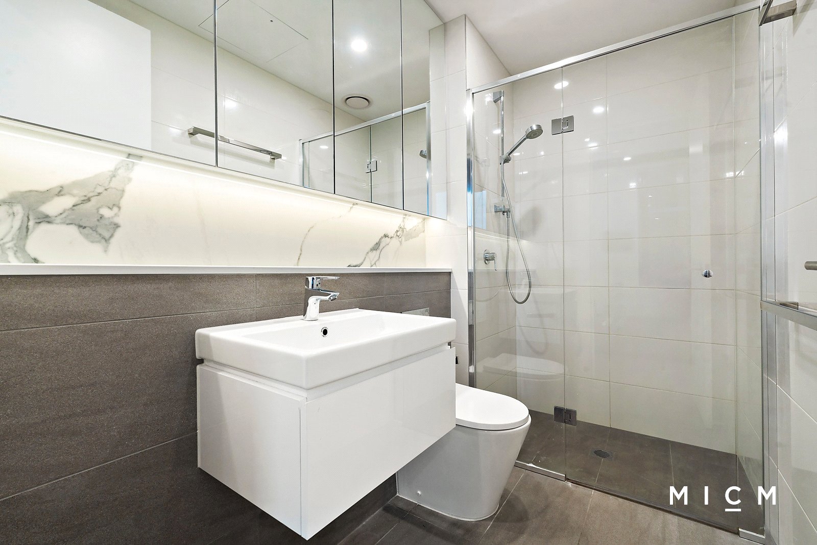 Spreading out on the 5th floor, far-reaching open-plan living and dining is filled with natural light courtesy of floor-to-ceiling glass lining the perimeter. A stone-finished kitchen showcases soft-closing cabinetry, a Fisher and Paykel dish-drawer, and top-of-the-range Miele appliances including a microwave and a 4-burner gas cooktop. Always free-flowing, step outside and entertain alfresco on an oversized balcony under shelter and shade highlighted by open views of the surrounding skyline. The naturally lit bedrooms are generous in size, serviced by mirrored built-in robes and a perfect pair of sleek bathrooms boasting fully tiled shower areas, mirrored cabinetry and concealed cisterns.