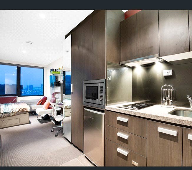 Situated on the 12th floor this self-contained studio apartment offers a good size living room area with queen size bed, an ensuite style bathroom complete with shower and WC. A well equipped kitchen that includes a built in oven/microwave, bar fridge, dishwasher, stone bench top and a built in washer-dryer combo unit. Additional items include wall mounted TV, electrical appliances, AC heating and cooling, a built in wardrobe and a built in study desk