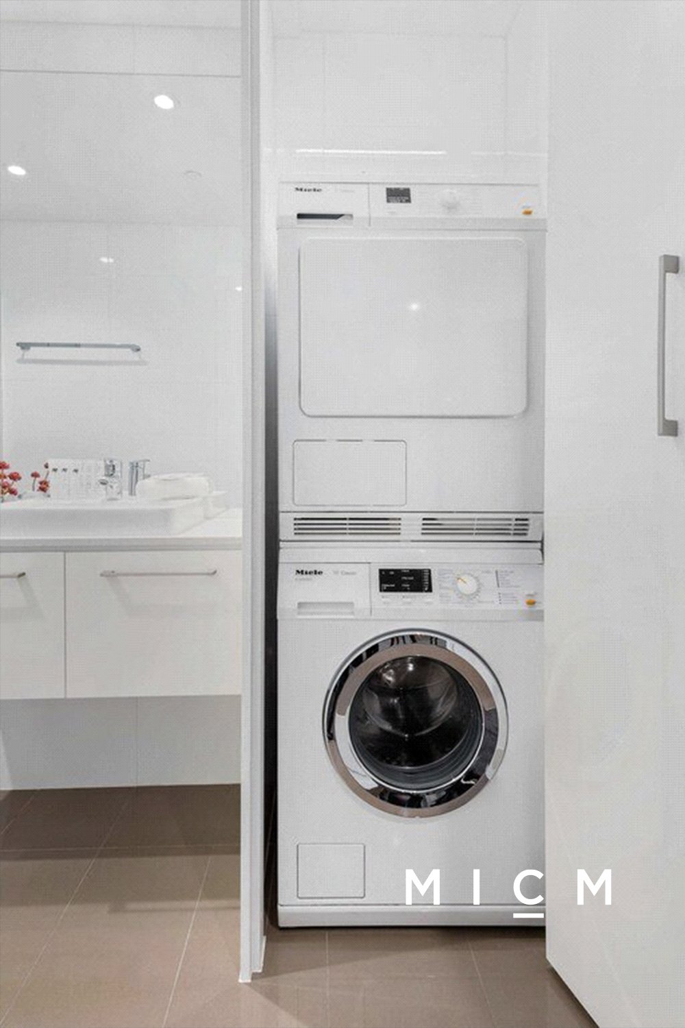 Premium Miele appliances including gas cooktop, microwave, and electric oven, plus convenient dishdrawer