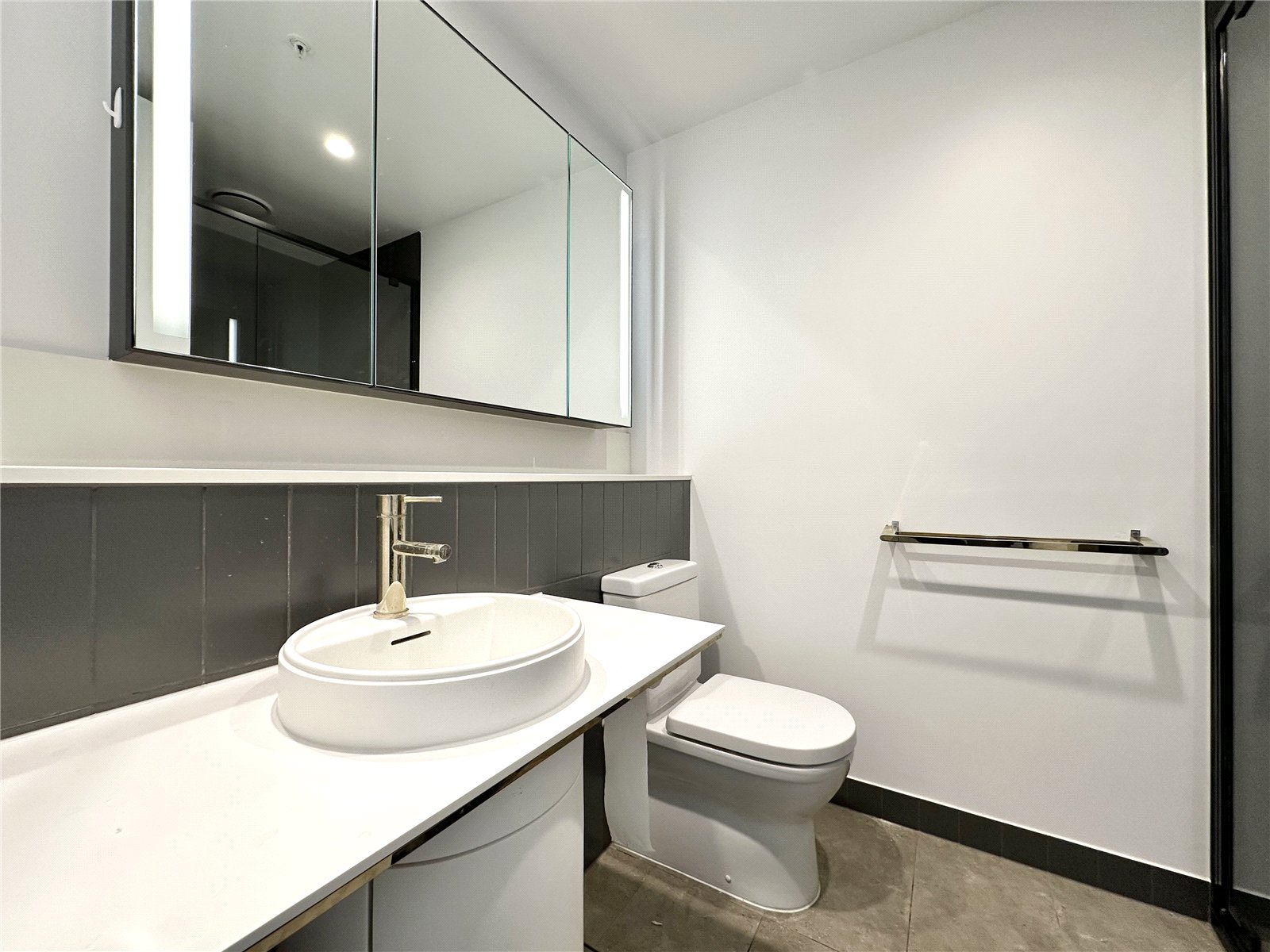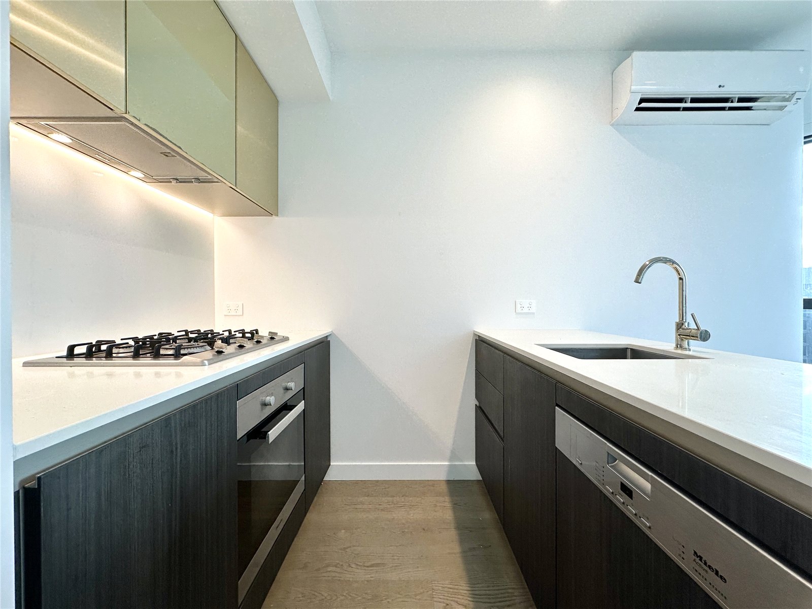 Superbly set in a commanding corner position, the spacious comfort of open-plan living and dining pivots a stone-topped kitchen showcasing a breakfast bar, soft-closing cabinetry, and high-quality Miele appliances including a full-sized dishwasher and a 4-burner gas cooktop. Curved floor-to-ceiling glass attracts northern light with ease and captures the soaring city skyline and the mountainous horizon as far as the eye can see. Serenely separated by the living space, the generously sized and mirror-robed bedrooms are filled with natural light, serviced by a luxe bathroom boasting full-height tiles, mirrored cabinetry and a hand/held shower fitting.