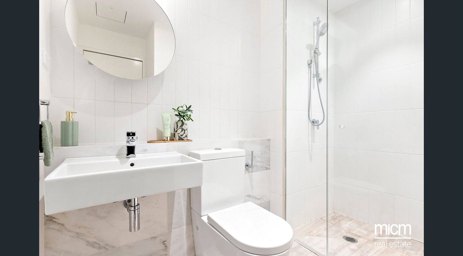 A chef-friendly kitchen showcases smooth stone surfaces, soft-closing cabinetry, a Fisher and Paykel dish-drawer and high-performing Bosch appliances including a 4-burner gas cooktop. A streamlined layout boasts zones for spacious living and dining, before connecting with an east-facing undercover balcony capturing the warmth of morning sunlight with ease. Sit back and relax with picturesque views towards the city skyline while overlooking the tree-lined boulevard below. The generously sized bedroom is serviced by built-in robes and a gleaming bathroom with mirrored cabinetry, full-height tiles and marble detailing.