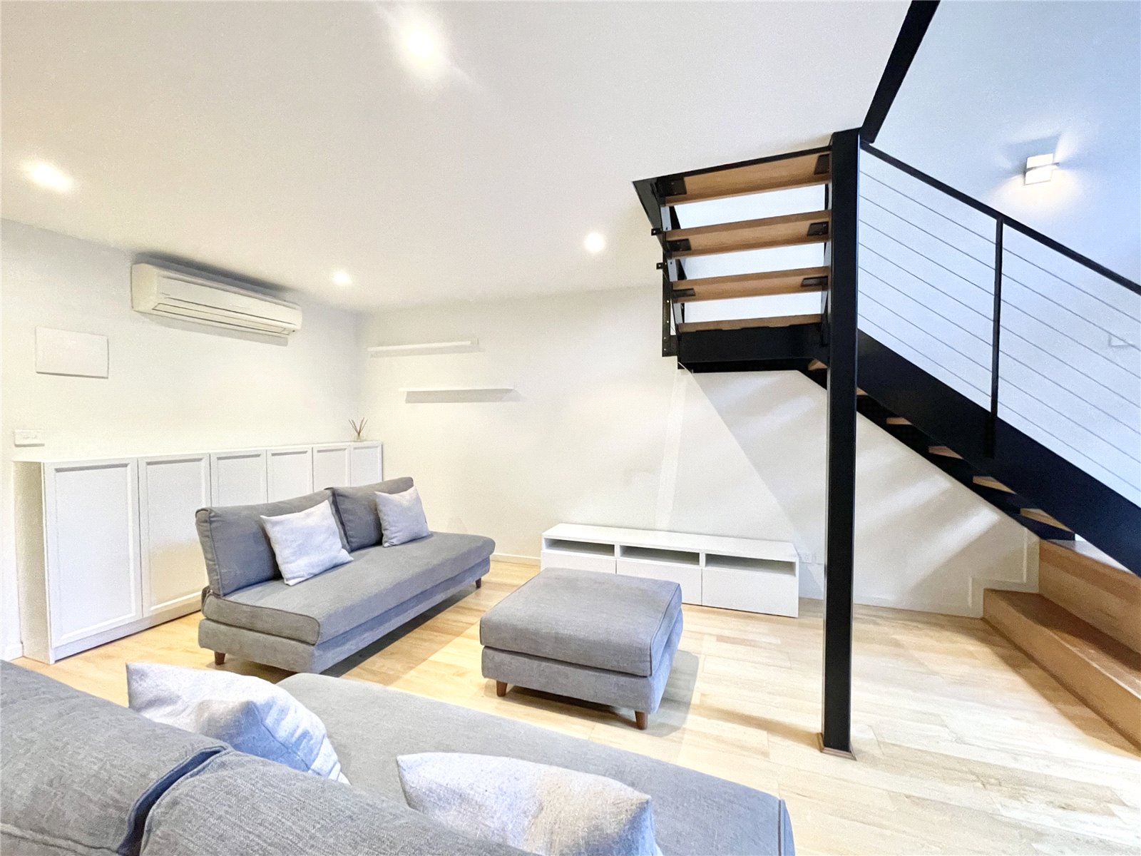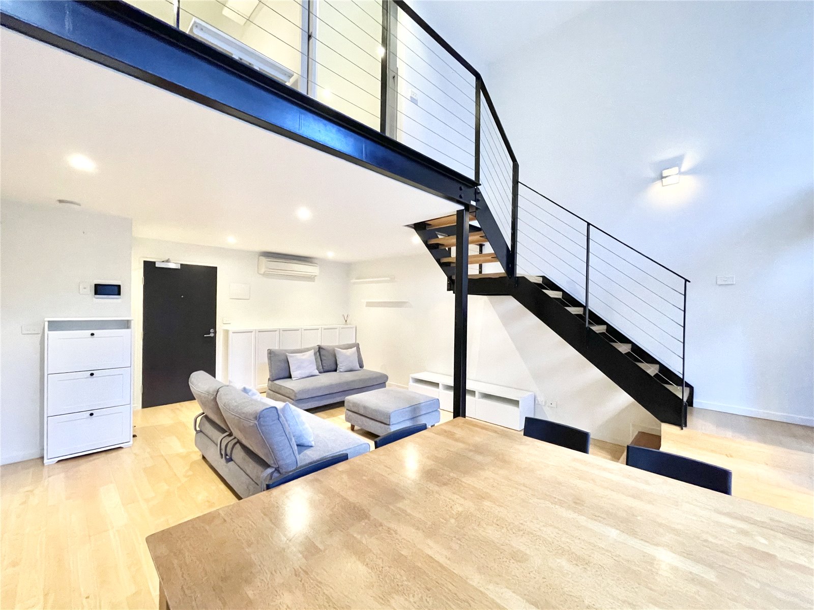 Downstairs features open plan living/dining area with heating/cooling, powder room and gourmet kitchen with stainless steel appliances opening on to full width balcony. Stunning full height glass doors with high ceilings are a definite focal point of this property. Upstairs has 2 good sized bedrooms, both with built-in wardrobes.