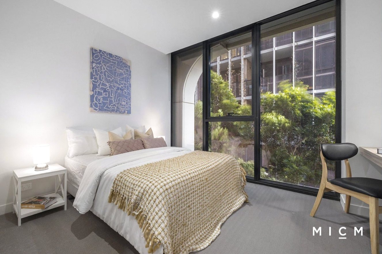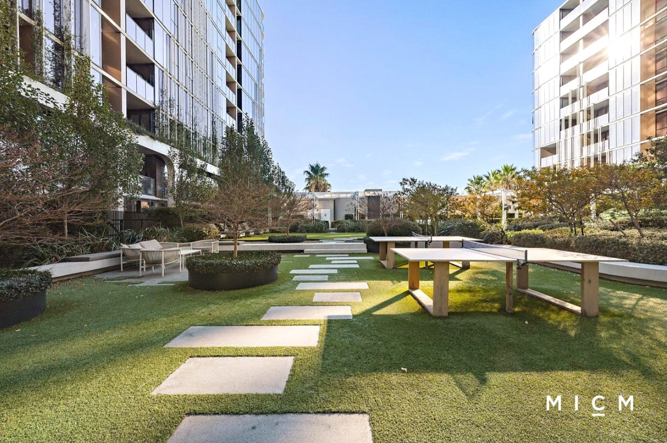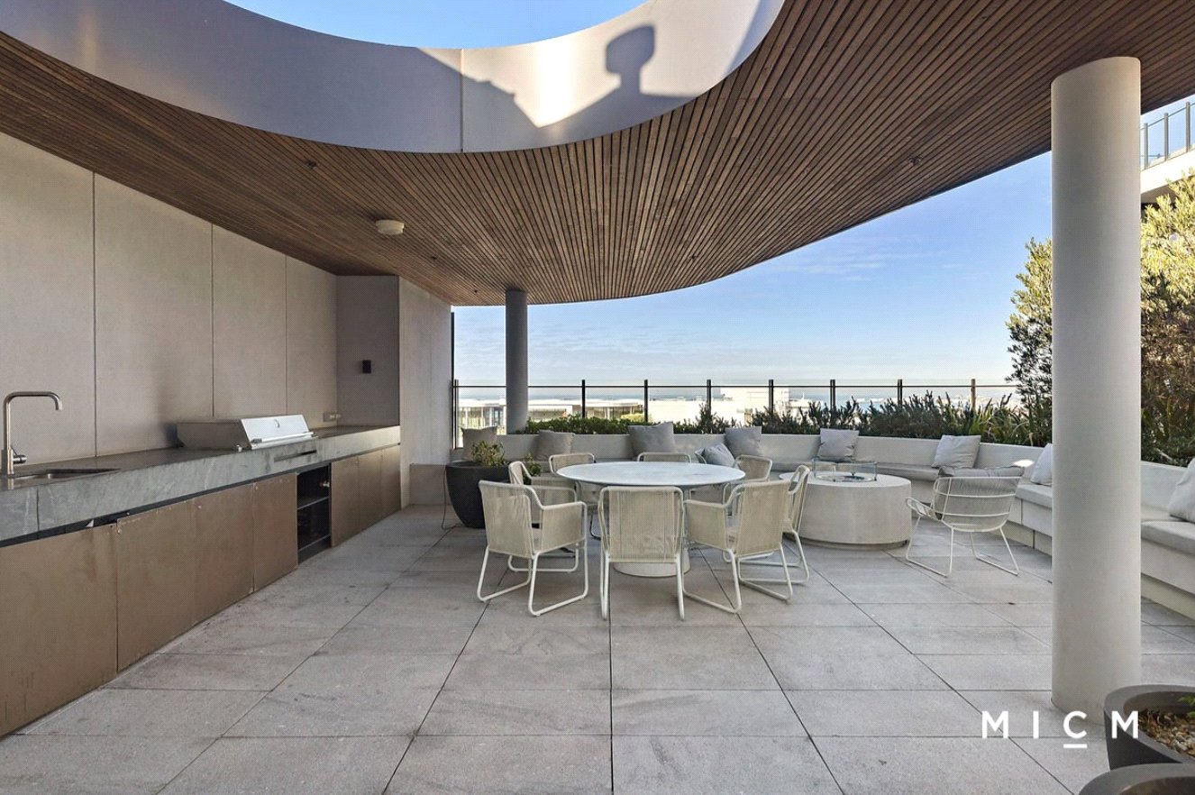 Both bedrooms are generously sized with mirrored robes. The master has direct balcony access, while the second bedroom offers a leafy outlook and a handy study nook with a built-in desk. Two sleek bathrooms boast rainfall showers, stone-topped vanities, and full-height tiling. Additional features include: • Car space • Euro laundry • Split-system heating and cooling • Timber flooring and roller blinds • Intercom Entry Enjoy access to an infinity pool, private cabanas, spa, a gym, yoga/Pilates studio, rooftop BBQ terrace, and residents lounge with kitchen and dining areas.