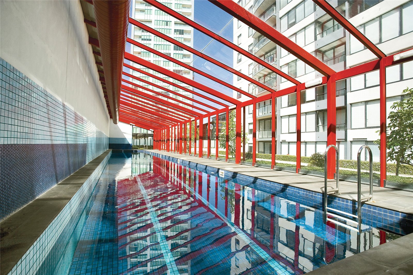 Additional amenities include entry with intercom, one undercover car space, and access to the complex's recreational facilities, which include an indoor swimming pool, tennis court, and gym.
