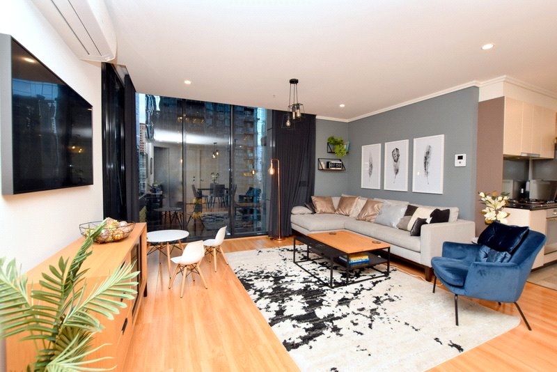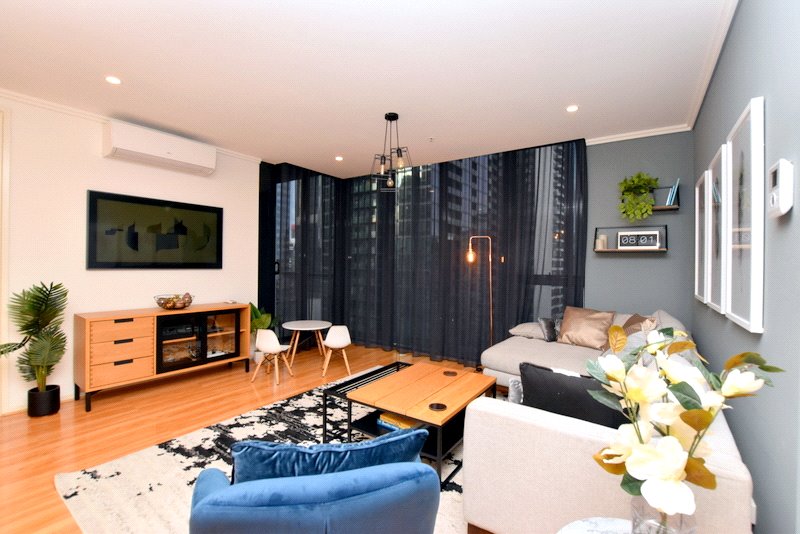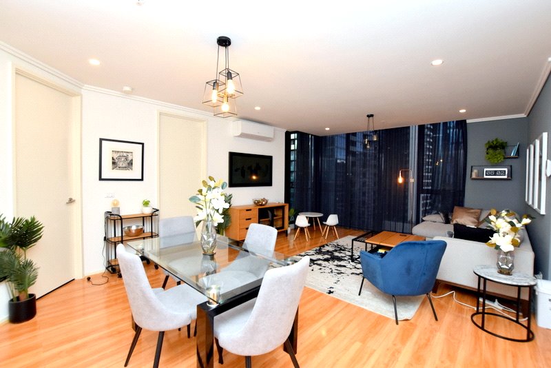 Apartment features: - Spacious open plan living and dining area with reverse cycle spit system and floor-to-ceiling windows with direct access to the private balcony. Fitted out with great quality large L-shape comfy couch, coffee table, accent chair, TV unit and Samsung "Frame TV. Art, accessories, feature lights complemented the atmosphere of cosiness and warmth. Dining area equipped with glass table and four comfortable chairs. - High-end kitchen brilliantly boasting bench-tops, including gas cook-top, electric oven, microwave, full-size dishwasher, and large bottom-mounted freezer fridge. - Master bedroom with floor to ceiling windows, large mirrored build-in robe. Complemented with KING size bed & big and fluffy mattress with bedsides, Samsung "Frame" TV and side table. Art, accessories, feature lights will bring you into the greatest relaxation and comfort. - Second bedroom with floor to ceiling window and amazing city view, generous size mirrored built-in robe and bunk-bed and chest of drawers. - Sparkling bathroom shower above the bath, European laundry with washing machine & drier