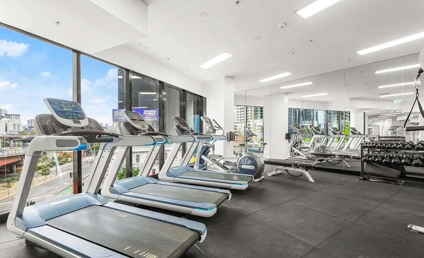 Both bedrooms are generously sized with plush carpet and built-in wardrobes, while the central bathroom is stylish and functional. Residents enjoy access to a fully equipped gym, adding to the convenience and lifestyle appeal.
