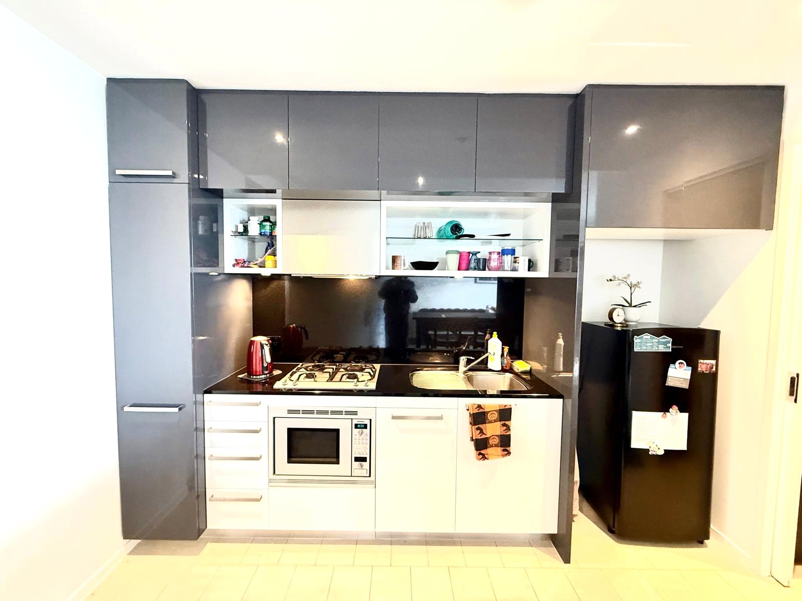 Sleek granite benchtops and enamel cabinetry